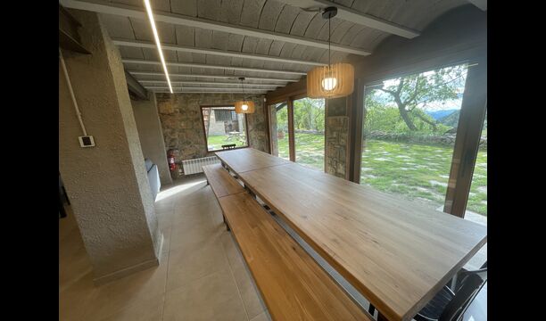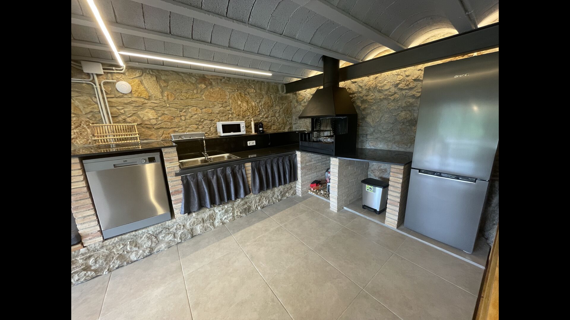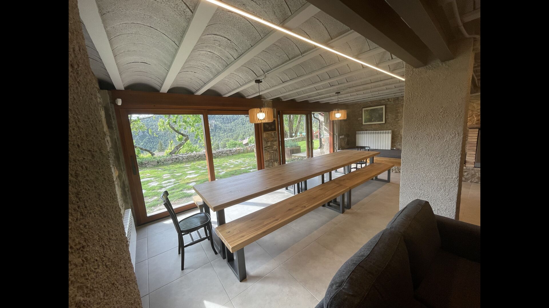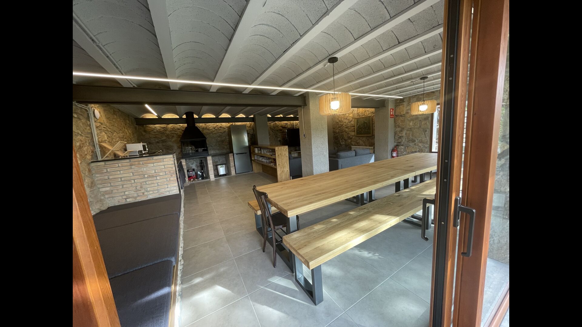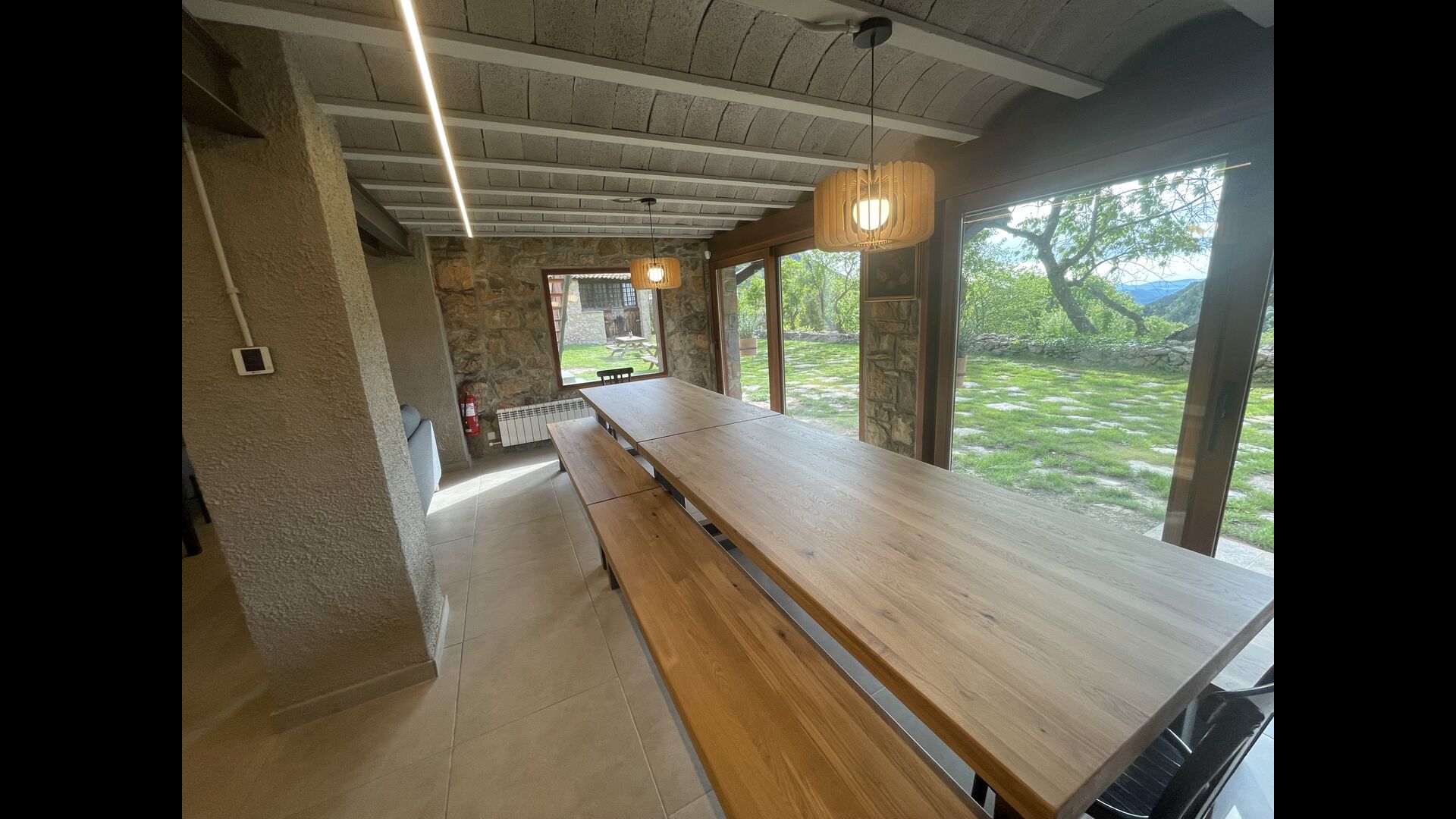 La casa también posee un maravilloso porche/patio, completo con su mesa grande (hasta 14 personas), su nevera/congelador< /strong> y una barbacoa para asar a la parrilla. Perfecto para cenar mientras el sol se pone en el sereno paisaje montañoso que se despliega ante tus ojos, tardes de juegos de mesa y largas charlas con amigos o familiares hasta altas horas de la noche con una buena botella de vino catalán.