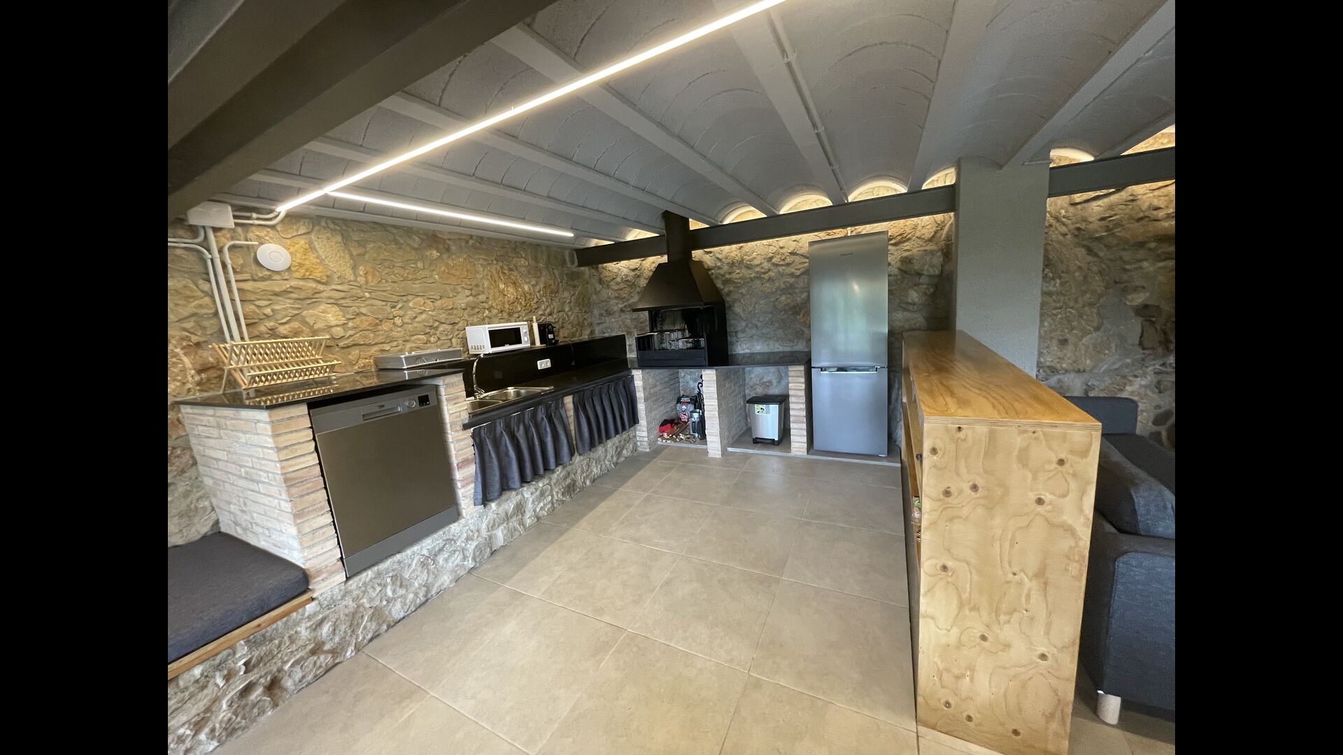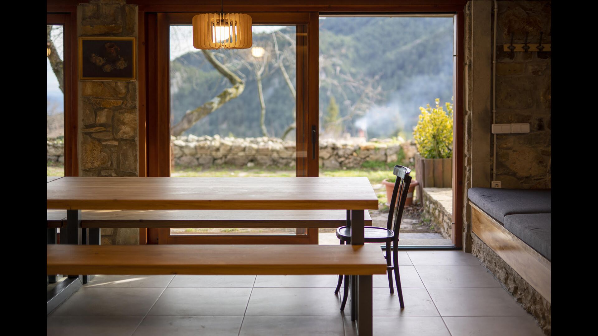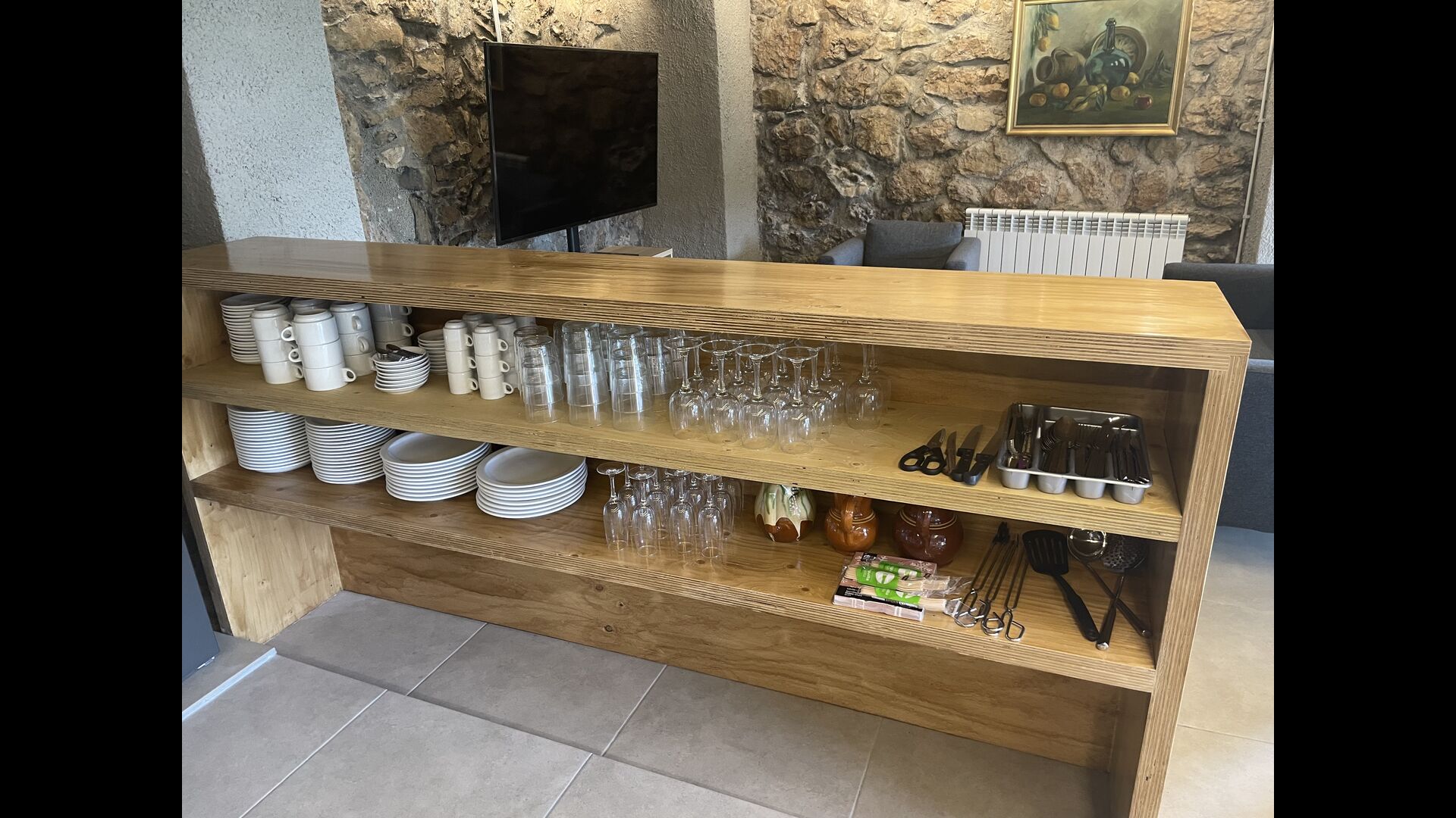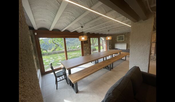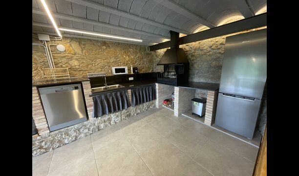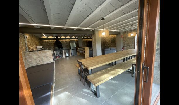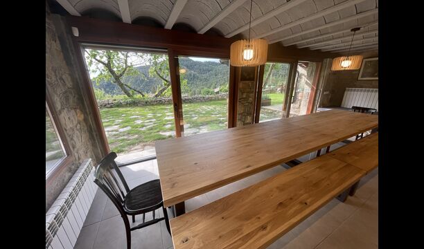 La casa también posee un maravilloso porche/patio, completo con su mesa grande (hasta 14 personas), su nevera/congelador< /strong> y una barbacoa para asar a la parrilla. Perfecto para cenar mientras el sol se pone en el sereno paisaje montañoso que se despliega ante tus ojos, tardes de juegos de mesa y largas charlas con amigos o familiares hasta altas horas de la noche con una buena botella de vino catalán.