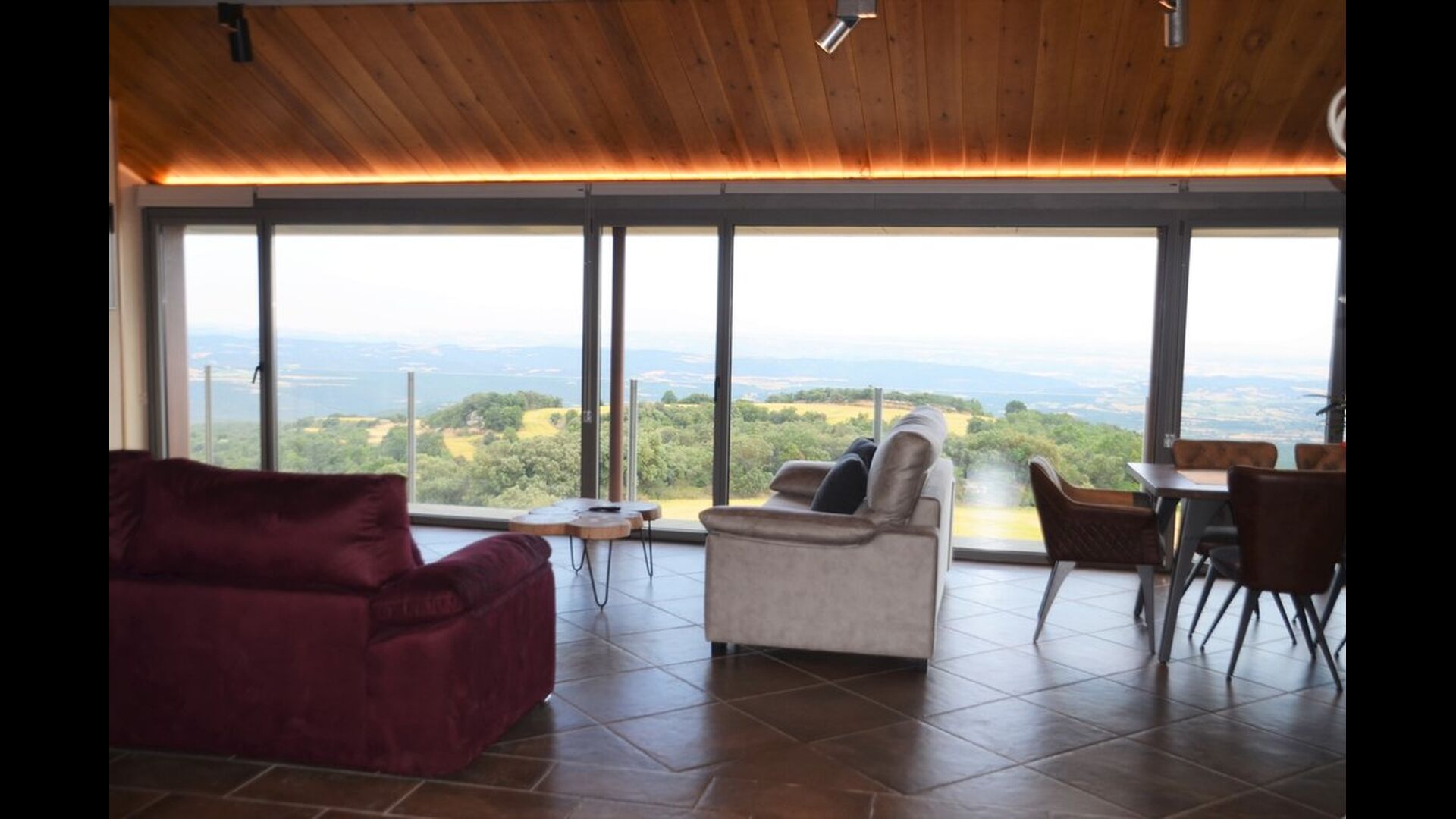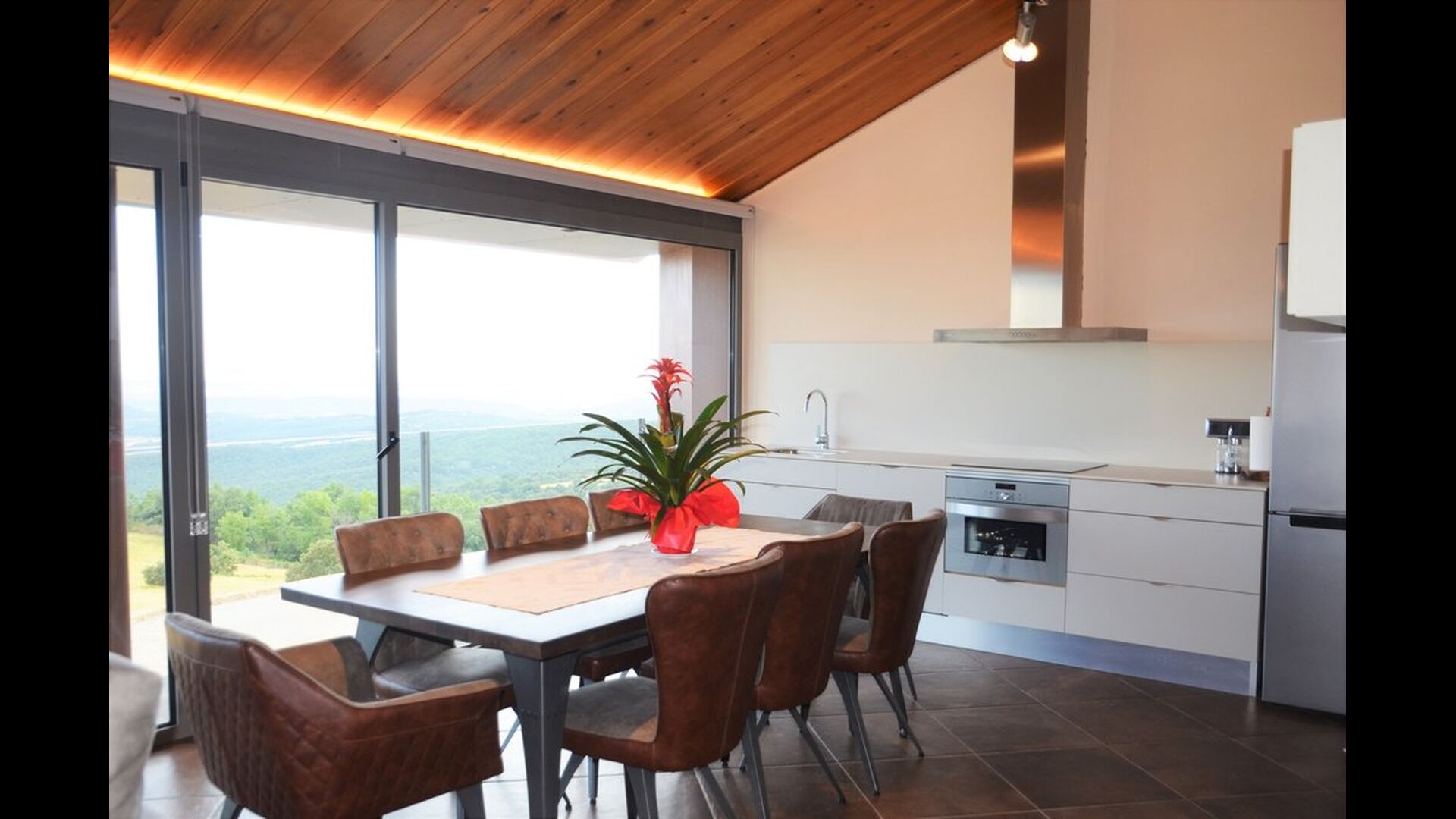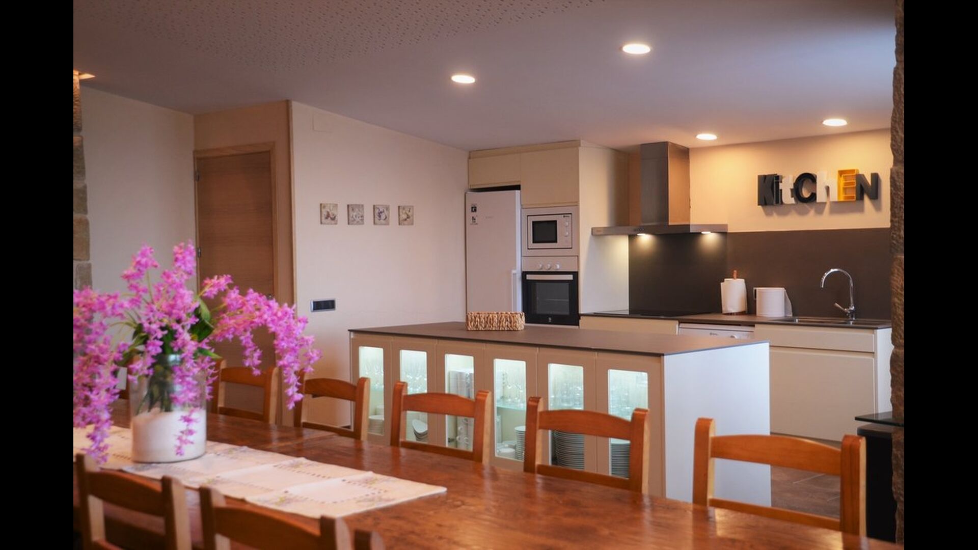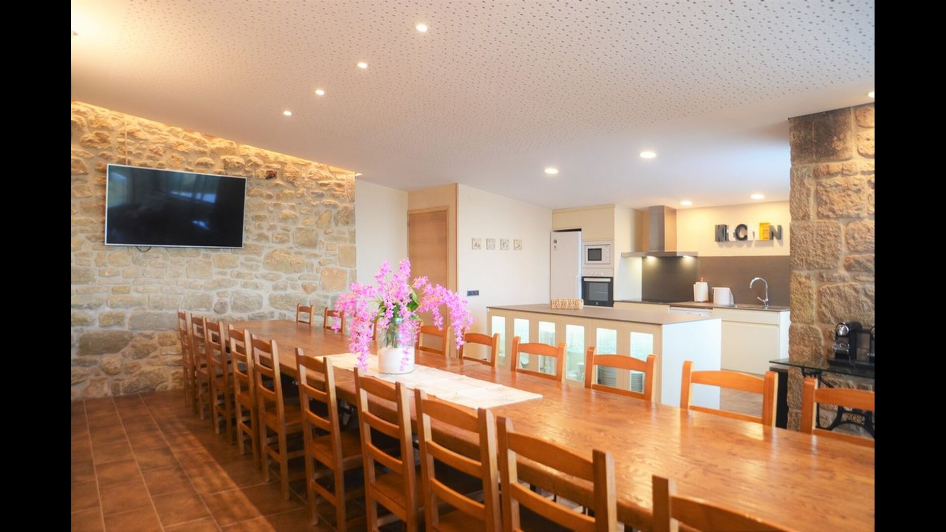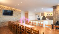 Al entrar en la planta baja de la casa, se encuentra la amplia zona de cocina-comedor abierta. La cocina está totalmente equipada y hay una gran mesa de comedor con capacidad para todo el grupo. También hay una sala de estar con cómodos sofás y un enorme televisor de pantalla plana, donde puedes recostarte y relajarte en el interior si lo necesitas.