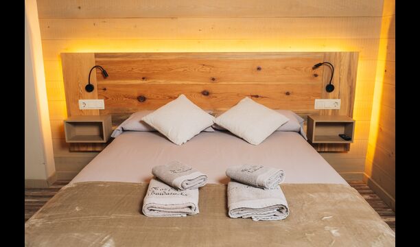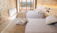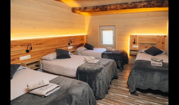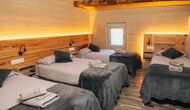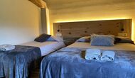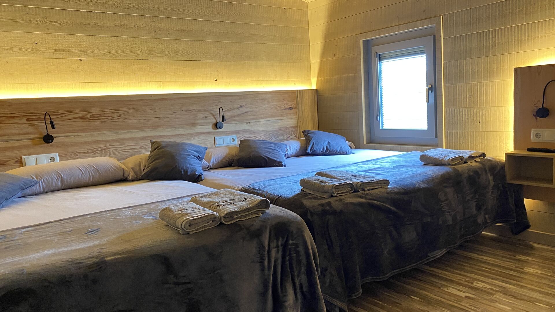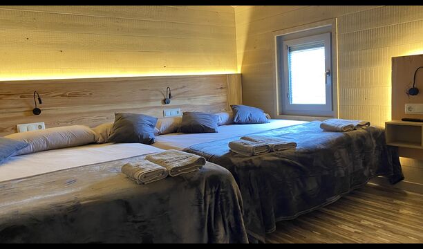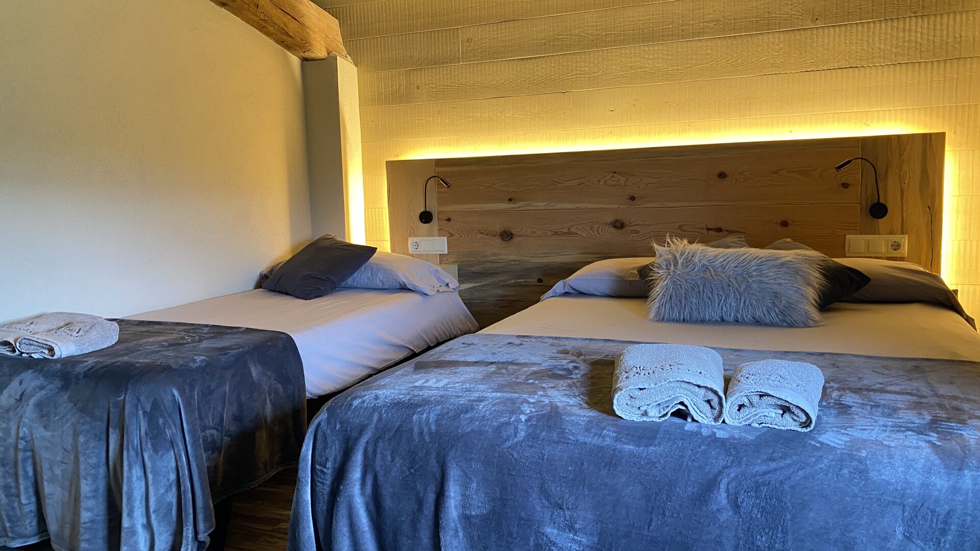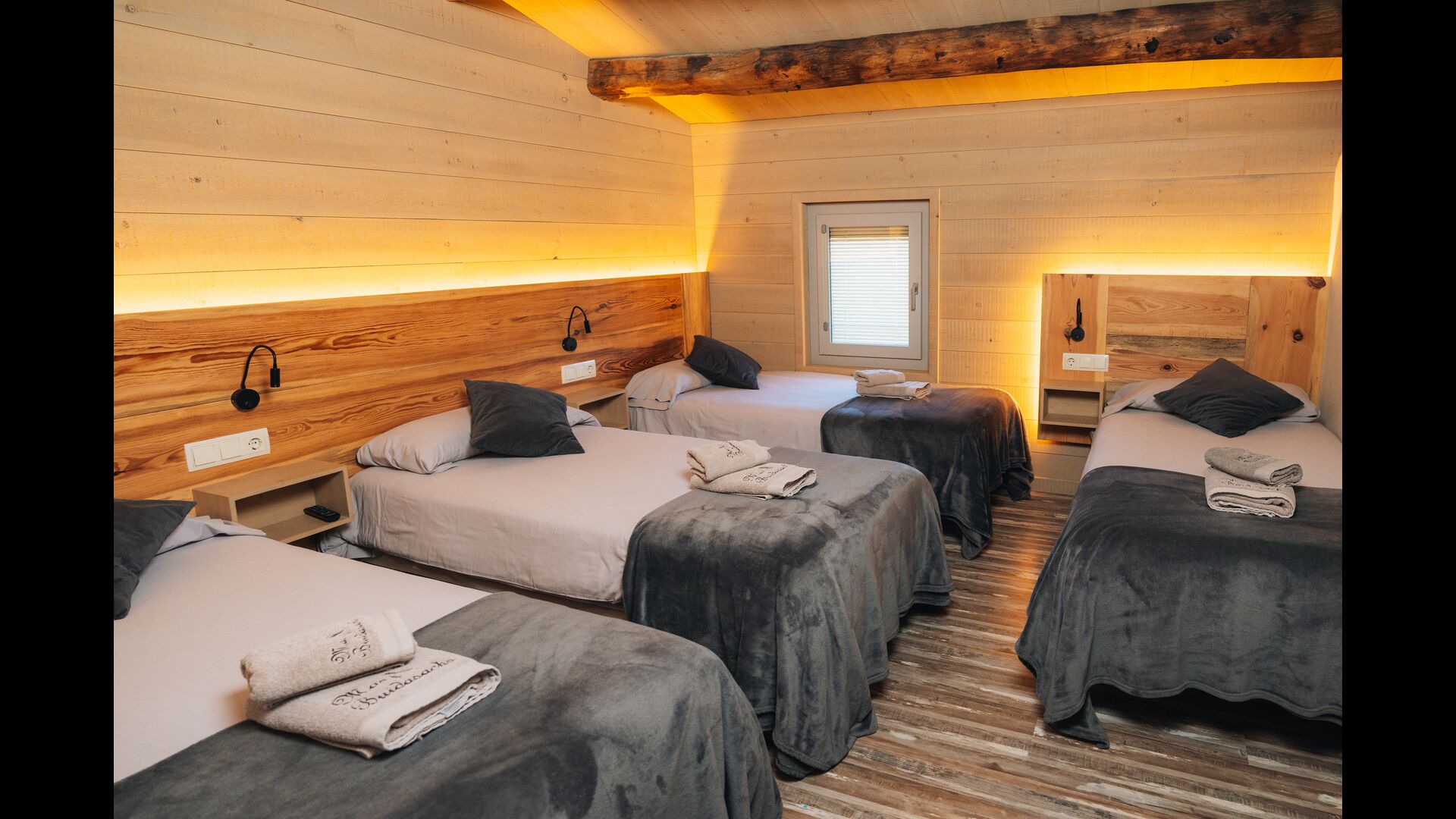 En la planta superior, hay una acogedora sala de estar con sofás, TV, aire acondicionado y luego hay cuatro dormitorios más. Uno es de cuatro dormitorios con 4 camas individuales y baño en suite. Luego hay 3 habitaciones dobles con camas dobles, baño propio y TV. Todos tienen espacio para 1 o 2 camas supletorias.