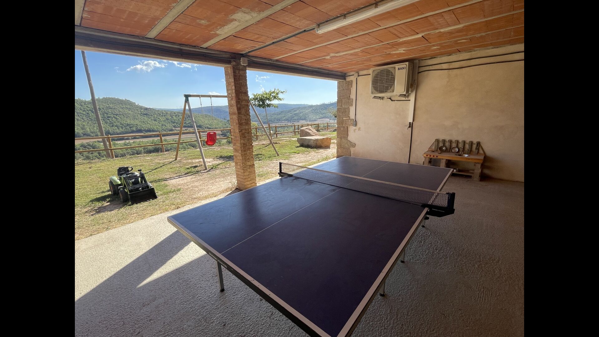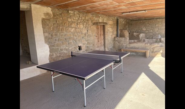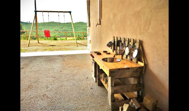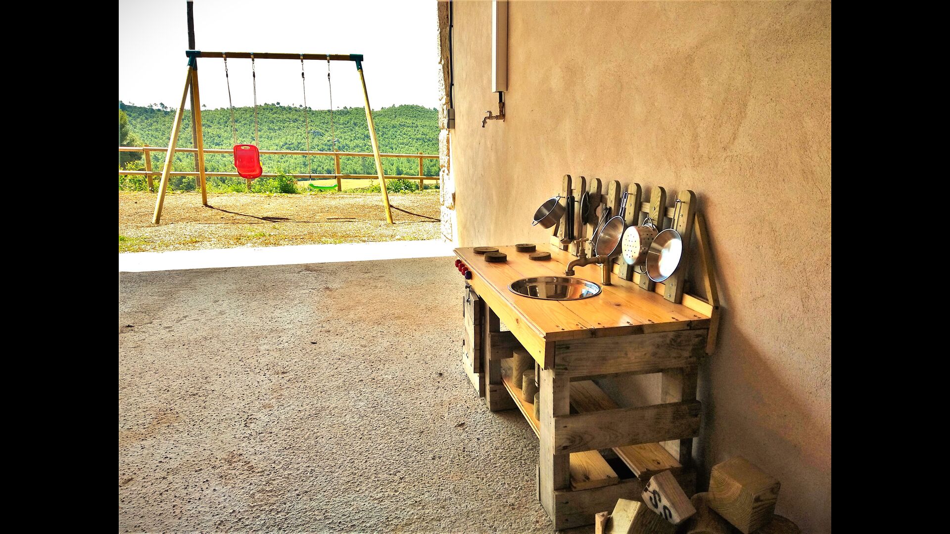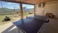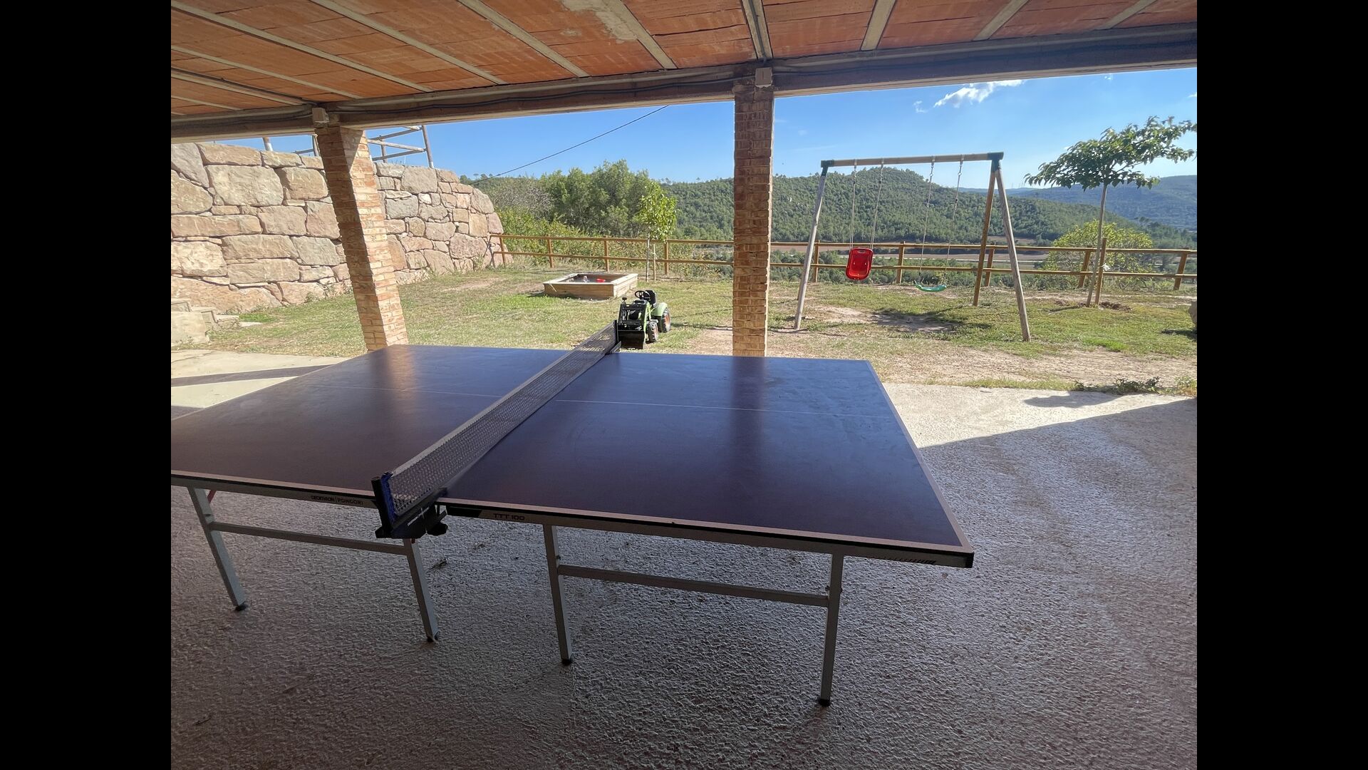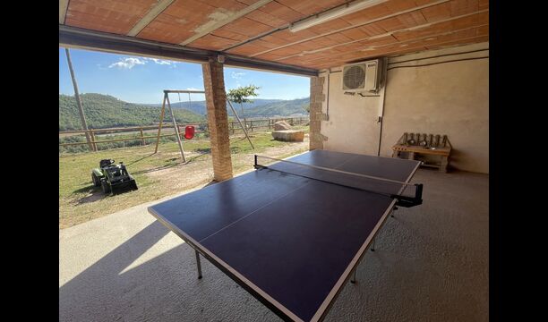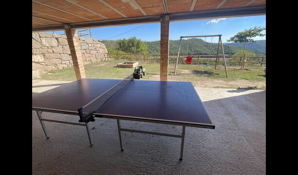 Fuera de la casa principal, hay un área/patio para barbacoa, donde también encontrará un largo banco para cenar y sofás , una minicocina con fregadero y uno de los dos porches, con vistas al hermoso valle que se encuentra debajo. La propiedad también cuenta con muchas instalaciones para que disfruten los niños; columpios, un trampolín, un arena/parque infantil y – ya seas joven o mayor, no importa si eres joven o mayor. una mesa de tenis para divertirte por la tarde en familia.