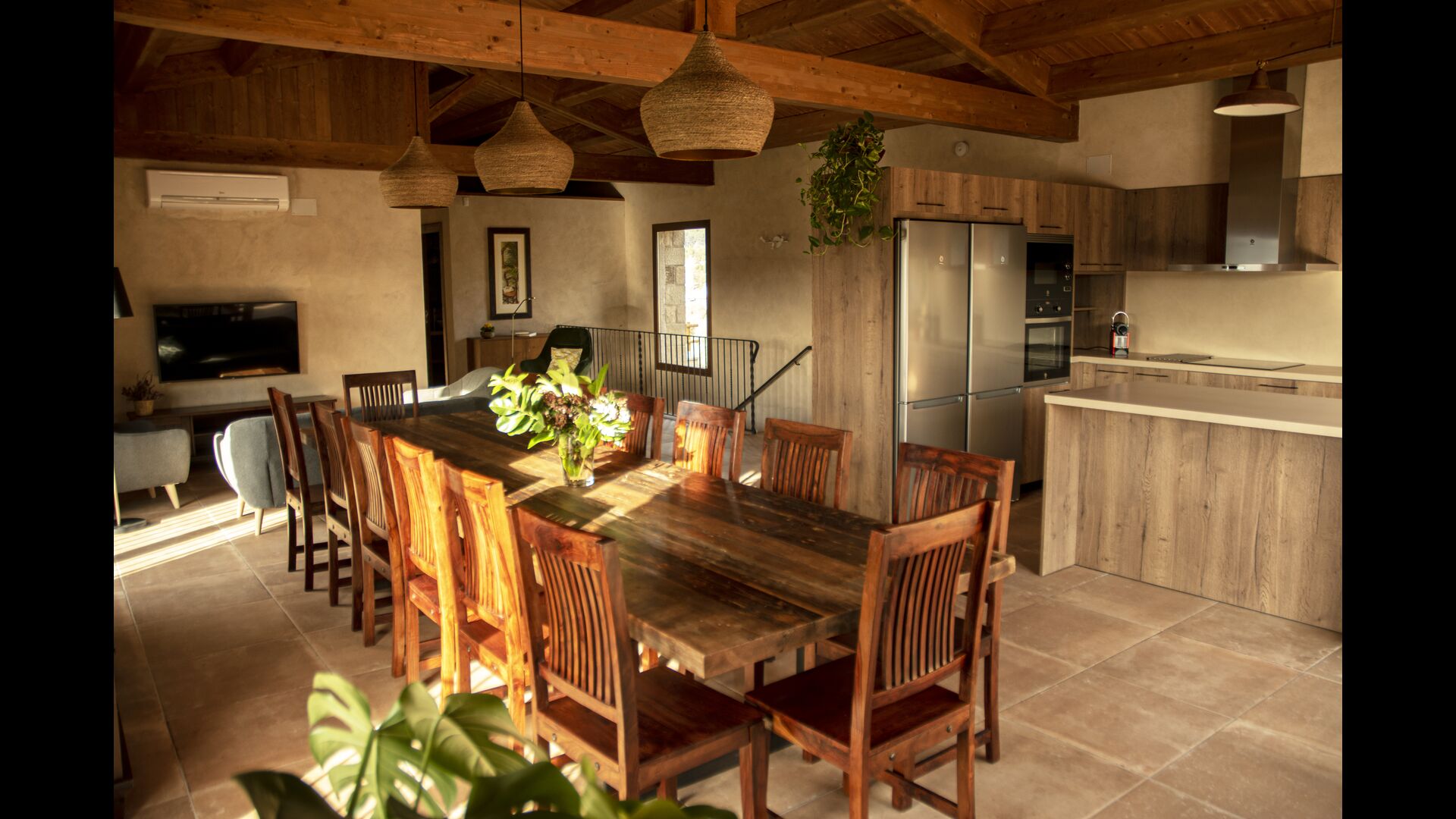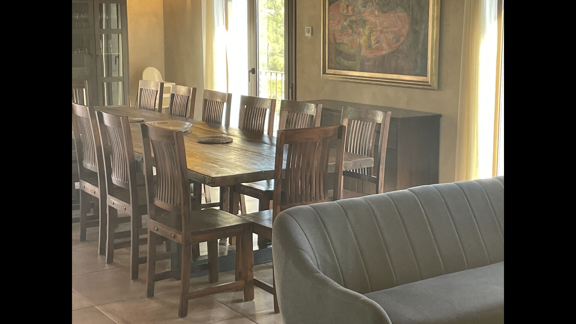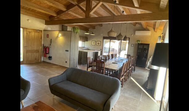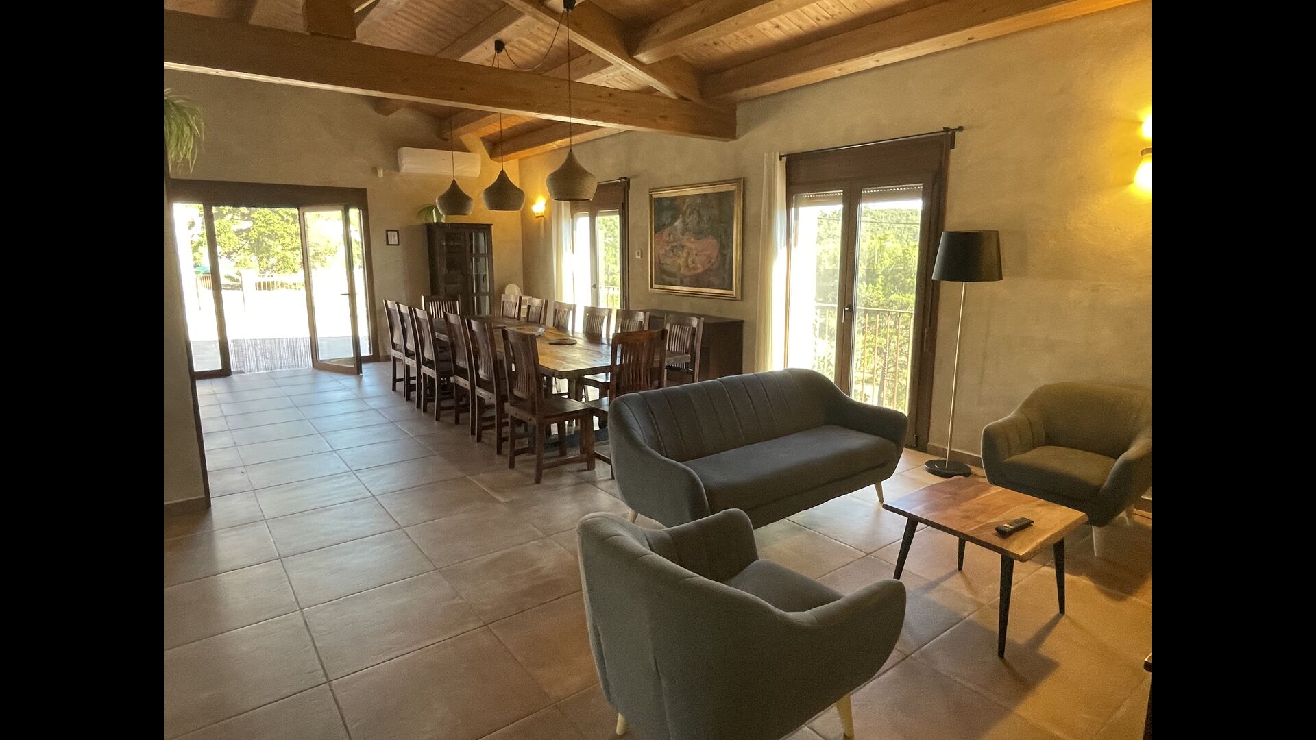 El salón/sala de estar principal, hermoso y tranquilo contiene una mesa de comedor grande, larga y de madera y – directamente unido a esta área: es la cocina modernizada y de alta calidad con 2 frigoríficos (con congeladores), un horno y todo lo necesario utensilios de cocina. Ambas zonas están bañadas por los cálidos rayos del sol, lo que la convierte en una zona hermosa y tentadora para desayunar, comer y cenar. Detrás del comedor se encuentra la sala de estar conjunta, equipada con una chimenea, cómodos sofás, una mesa de café y un TV. . La habitación también tiene aire acondicionado, por lo que si te molesta el calor, es un lugar perfecto para recostarte durante las horas más cálidas del día.