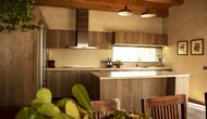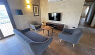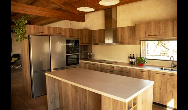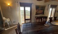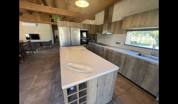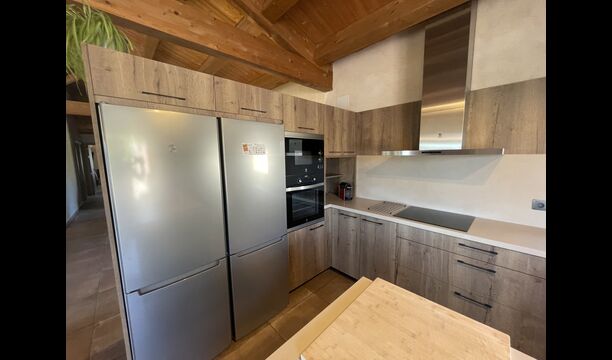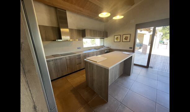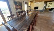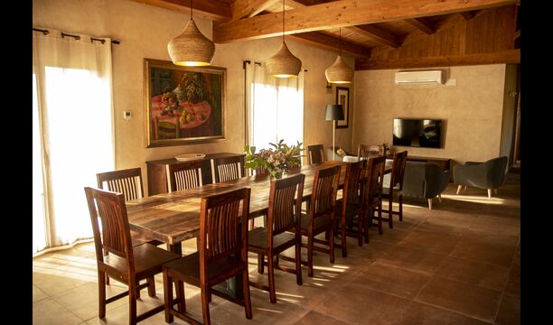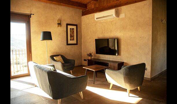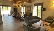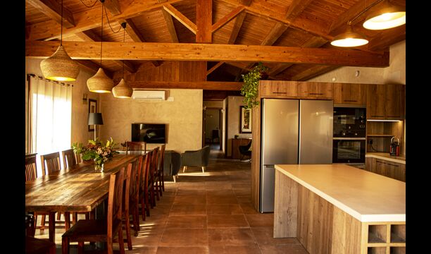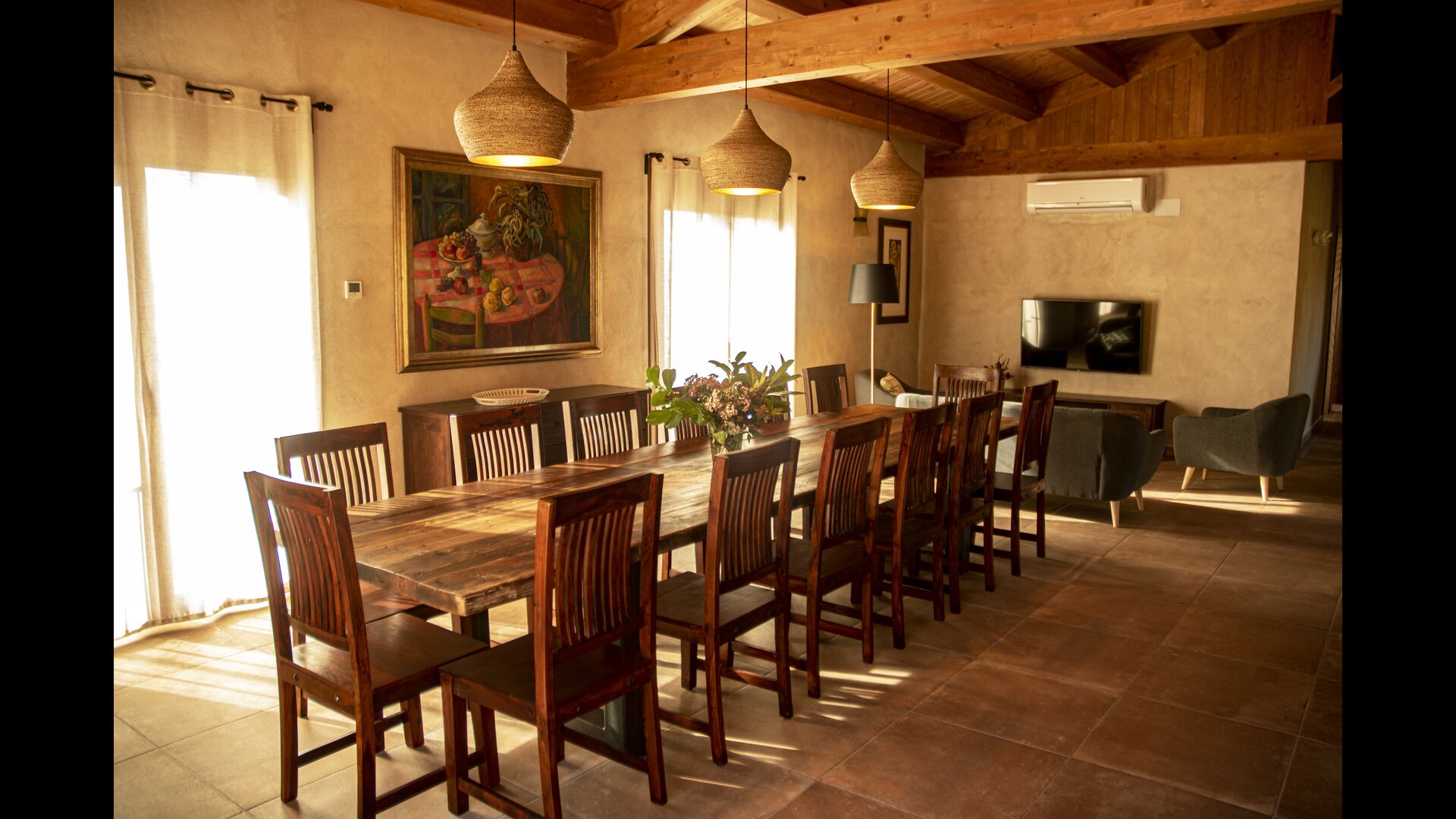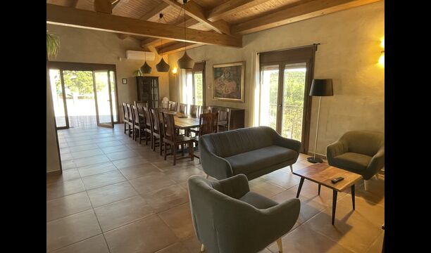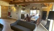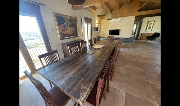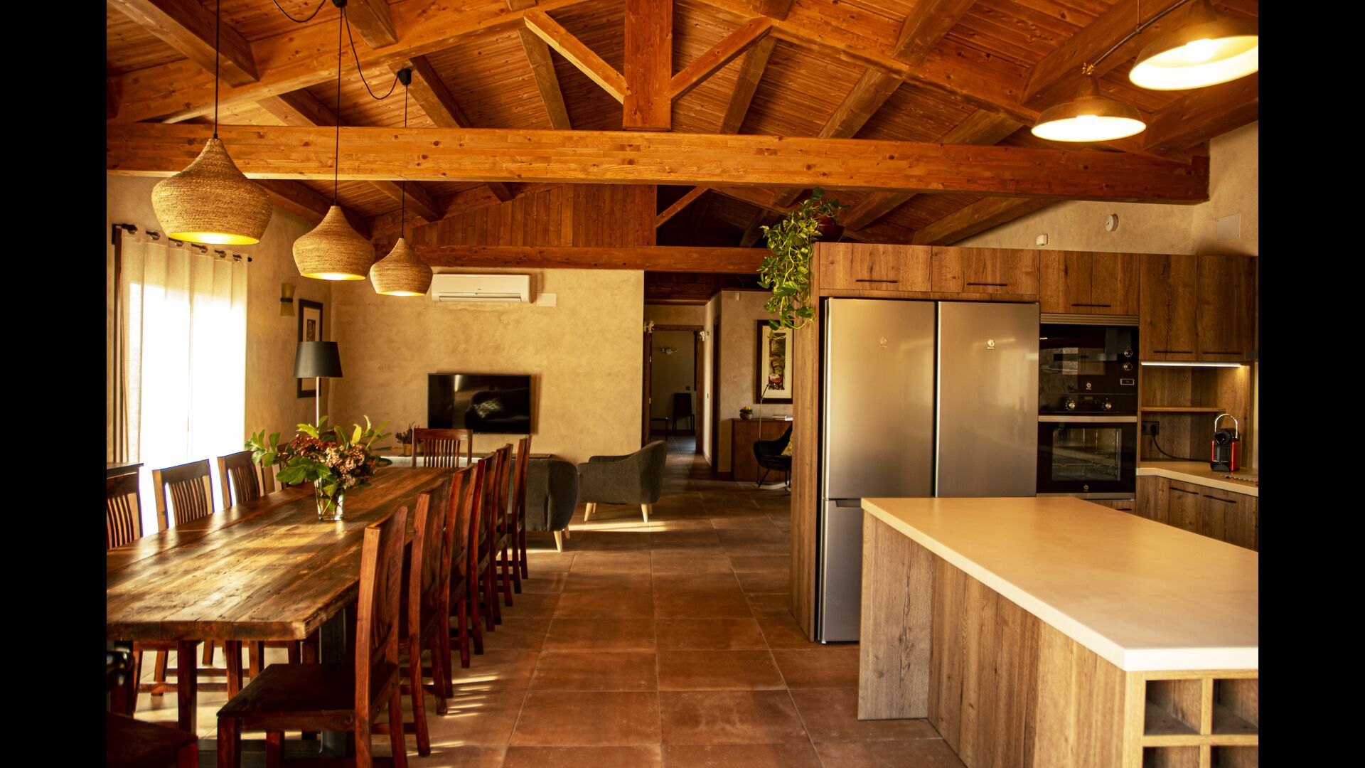 El salón/sala de estar principal, hermoso y tranquilo contiene una mesa de comedor grande, larga y de madera y – directamente unido a esta área: es la cocina modernizada y de alta calidad con 2 frigoríficos (con congeladores), un horno y todo lo necesario utensilios de cocina. Ambas zonas están bañadas por los cálidos rayos del sol, lo que la convierte en una zona hermosa y tentadora para desayunar, comer y cenar. Detrás del comedor se encuentra la sala de estar conjunta, equipada con una chimenea, cómodos sofás, una mesa de café y un TV. . La habitación también tiene aire acondicionado, por lo que si te molesta el calor, es un lugar perfecto para recostarte durante las horas más cálidas del día.