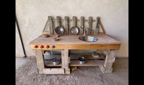 Justo al lado de la piscina En esta zona hay una mesa de jardín con sillas, por si los padres desean sentarse un poco lejos de la zona, pero todavía tienen los niños. a la vista y cerca.