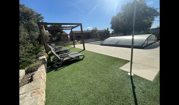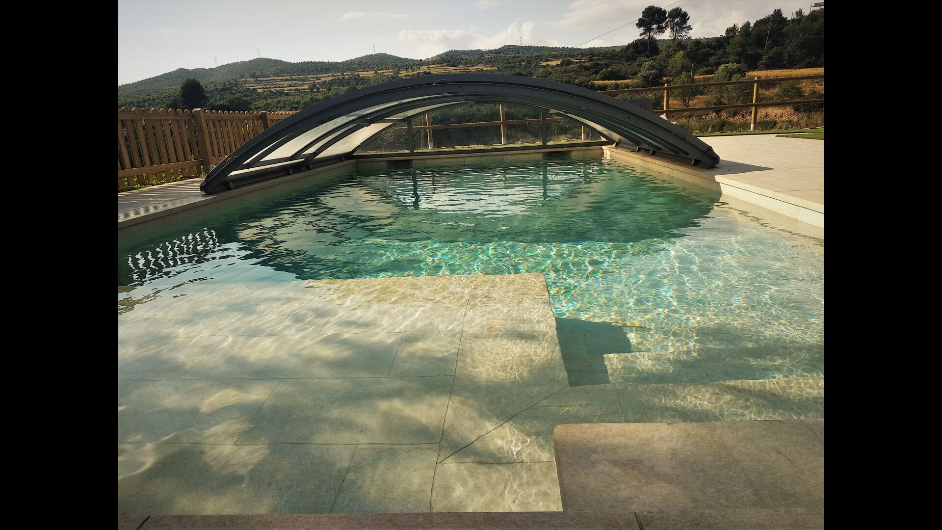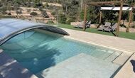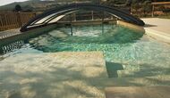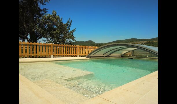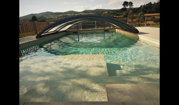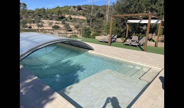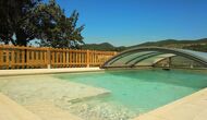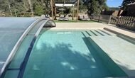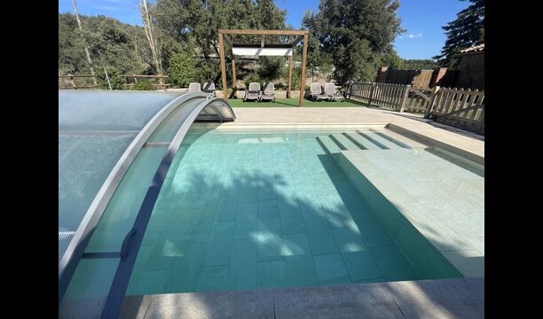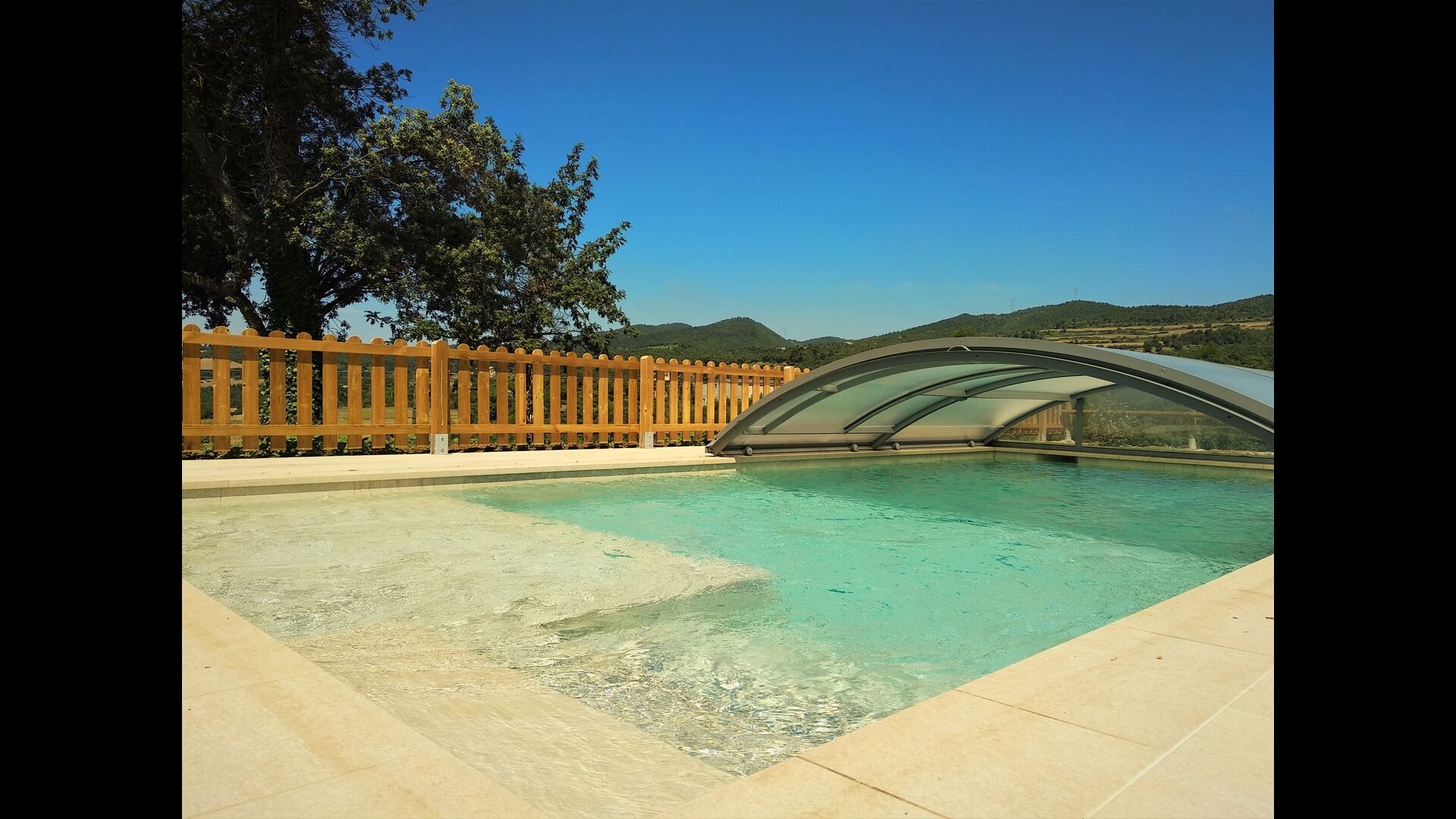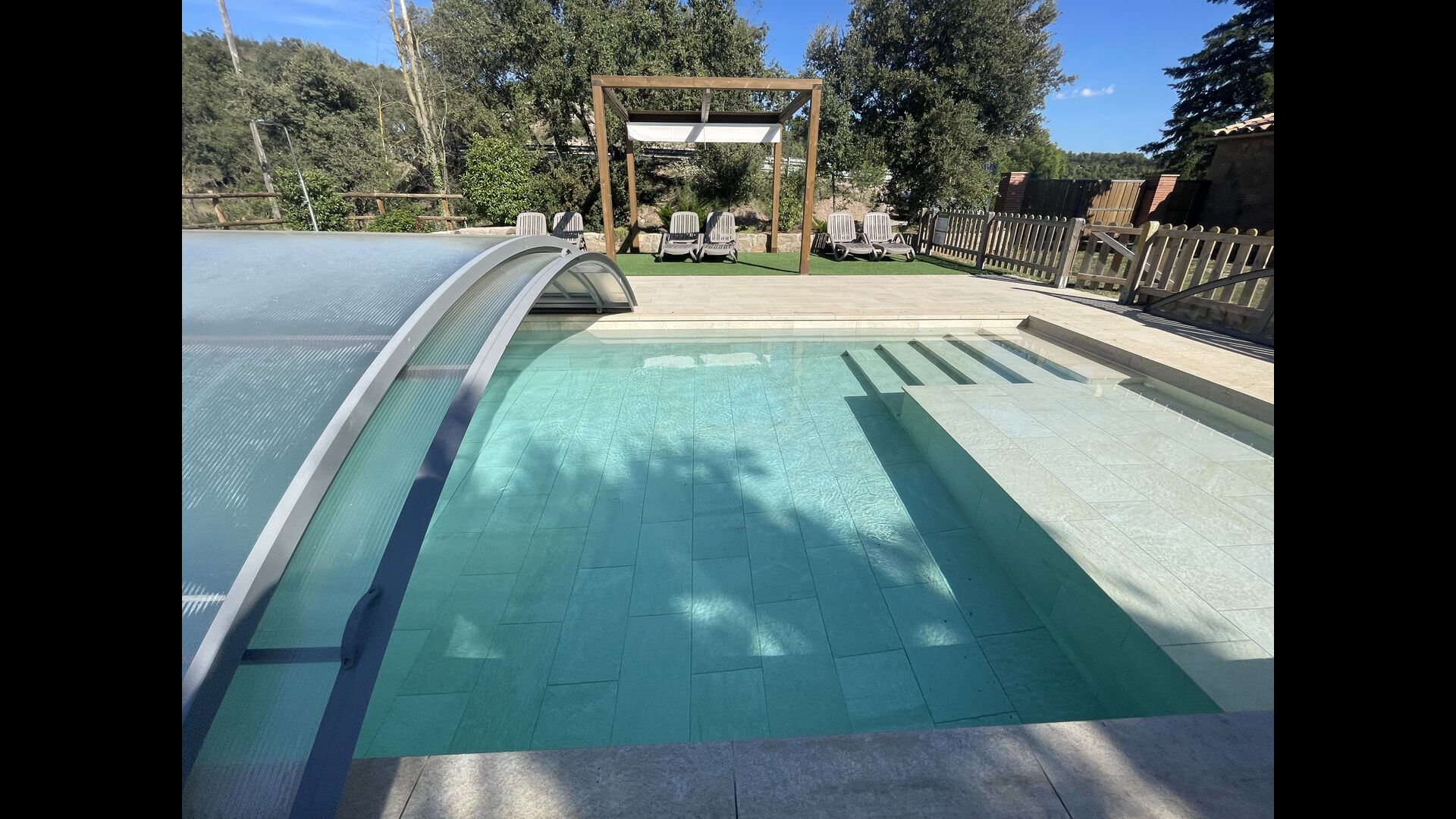 La maravillosa zona de la piscina vallada tiene muchas sillas reclinables, un minipatio de techo abierto (que puedes cubrir para dar sombra) para relajarse a la sombra. La piscina en sí es grande y espaciosa; con escalones que llegan hasta el fondo de la piscina, haciéndola más segura para niños y personas mayores, y además cuenta con una zona cubierta y transparente en un lado.