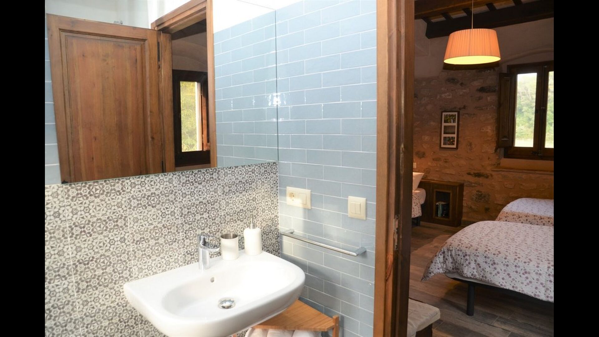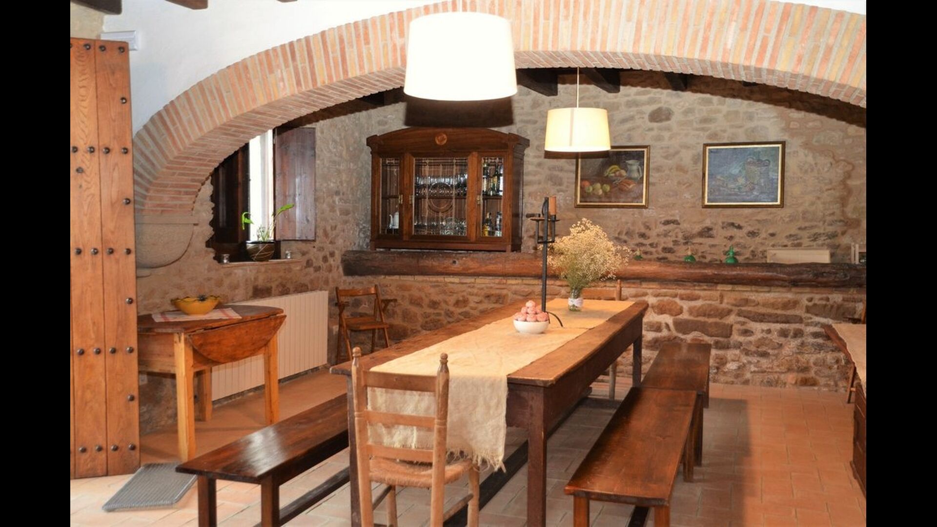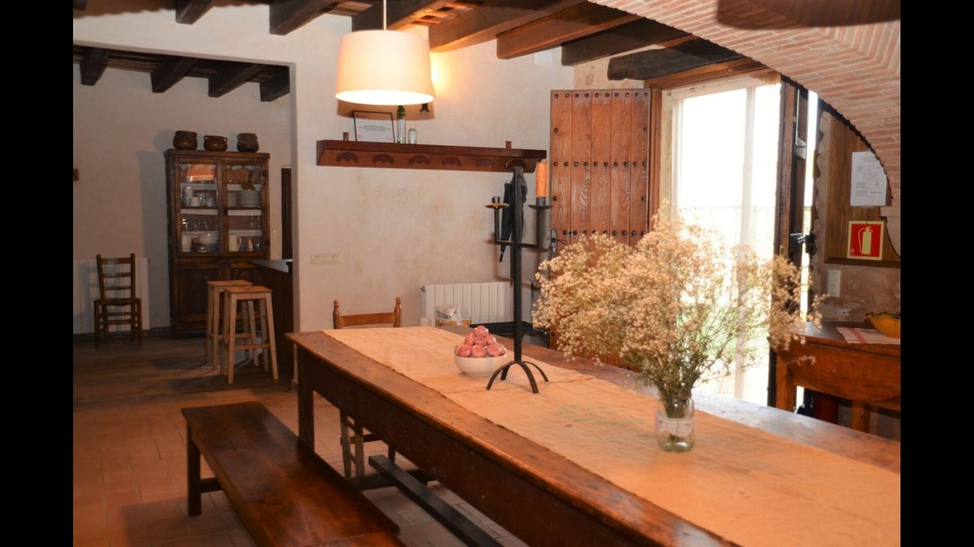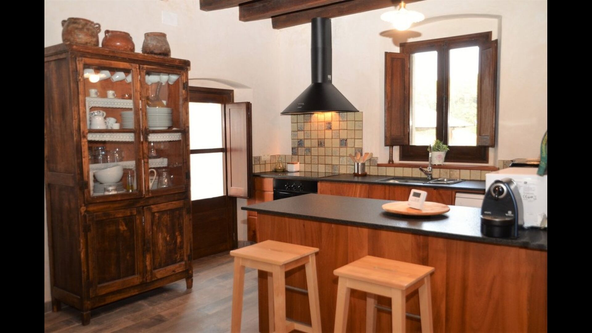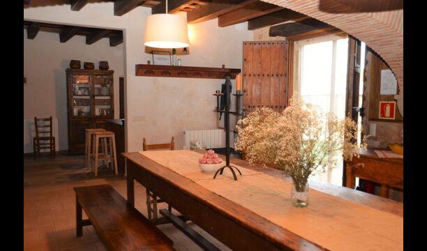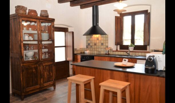 Cuando ingreses a la planta baja desde el área de la piscina, serás conducido a la gran cocina abierta y comedor. El interior y el estilo de la cocina es muy auténtico y de buen gusto, con un gran armario de madera, sillas de madera y una acogedora chimenea. Tiene una barra de mostrador en un lado, con dos taburetes y está muy bien equipado con todo lo que pueda necesitar, incluidos; nevera, congelador, lavavajillas, microondas e incluso una cafetera Nespresso. El comedor también es increíblemente acogedor con un techo arqueado y paredes de piedra caliza auténticas. Tiene una larga mesa de comedor de madera con bancos de madera. En la siguiente habitación se encuentra el salón con cómodos sofás y sillas. Hay un televisor y una máquina de DVD, y la casa también cuenta con Wi-Fi, por lo que podrá descansar y relajarse aquí, si lo desea. También hay un pequeño baño con inodoro en este piso, por lo que no tiene que subir las escaleras si es necesario. Al final de esta parte de la casa, encontrará una salida que lo lleva a una terraza cubierta con una mesa grande. El lugar perfecto para cenar o disfrutar de una bebida fría por la noche, en las hermosas temperaturas catalanas.