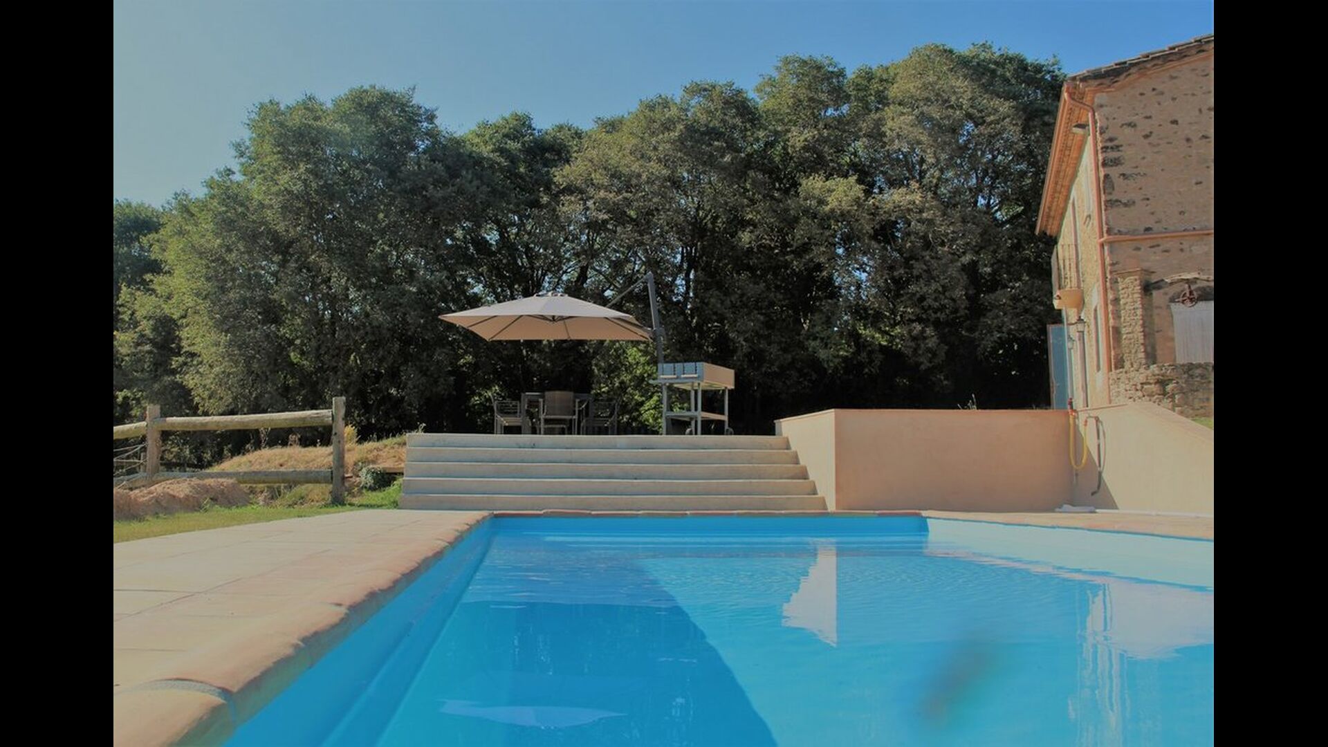 Gran casa de vacaciones con excelentes instalaciones al aire libre que incluyen dos terrazas cubiertas y una gran área de piscina.