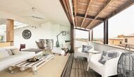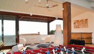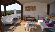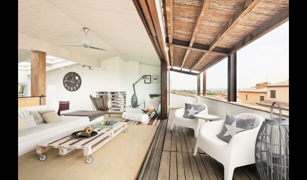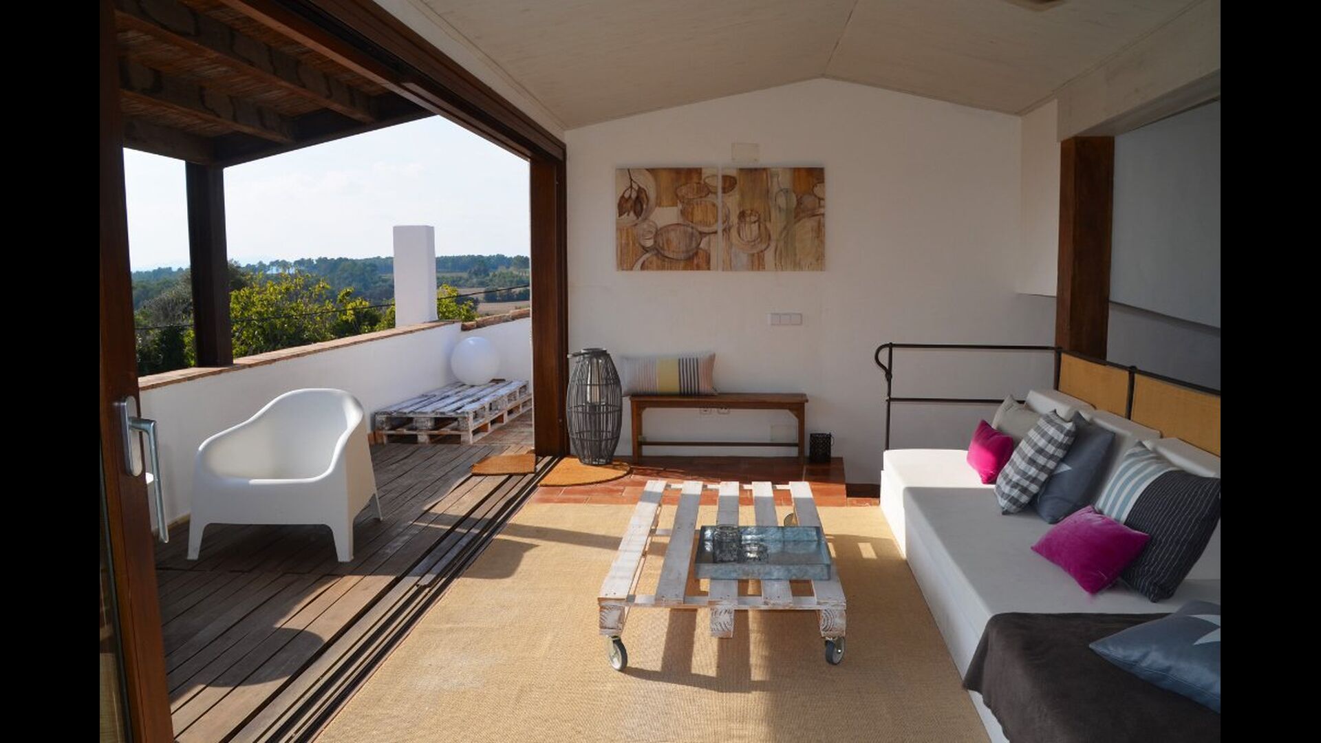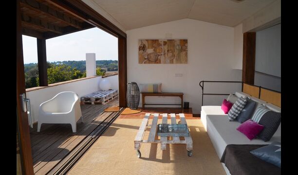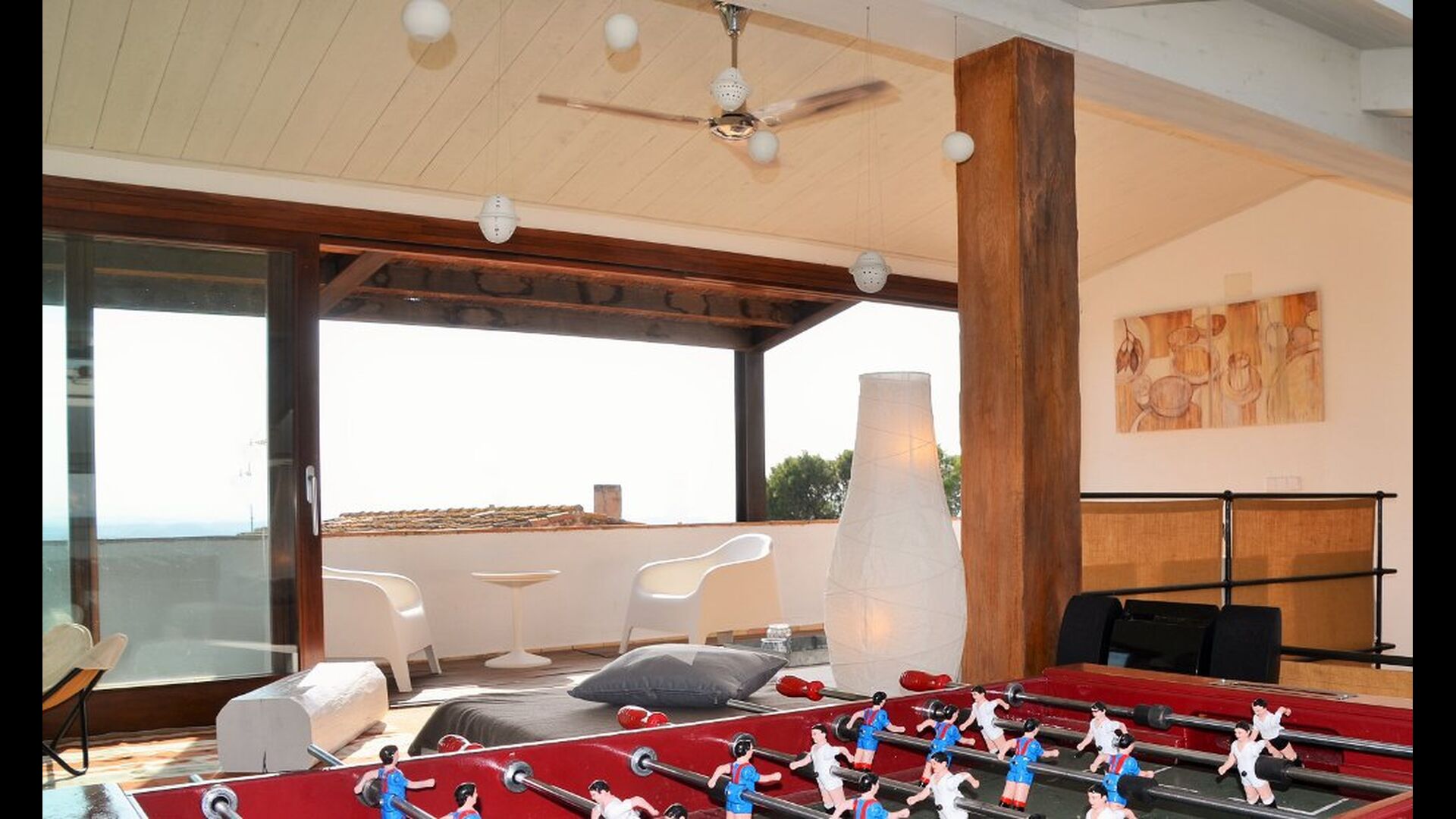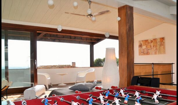 El tercer piso no hace más que aumentar la racha de excelente calidad. El área abierta está iluminada por la luz solar a través de las ventanas panorámicas que se pueden abrir y cerrar. Las instalaciones, como futbolín, bar, sistema de música, varias sillas y, por supuesto, el gran sofá, contribuyen a crear el ambiente perfecto para relajarse. Sin mencionar la espectacular vista desde la gran terraza en conexión con la habitación. Toma un vaso, llénalo con lo que quieras, recuéstate en el sofá y disfruta de la puesta de sol catalana detrás de las montañas en la distancia. Esta habitación no es diferente de las otras en términos de decoración; Está decorado de una manera muy moderna e impresionante. El propietario de la casa es un profesional de la decoración, organización y decoración para marcas reconocidas, esto se refleja en gran medida en el hogar de buen gusto.