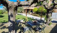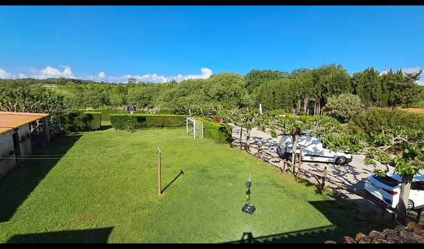 También está la terraza cubierta, con sillas, una mesa pequeña y – más atrás: un sofá de piedra adosado a la pared. En el jardín también encontrará una instalación de ping-pong y un pequeño campo de fútbol.