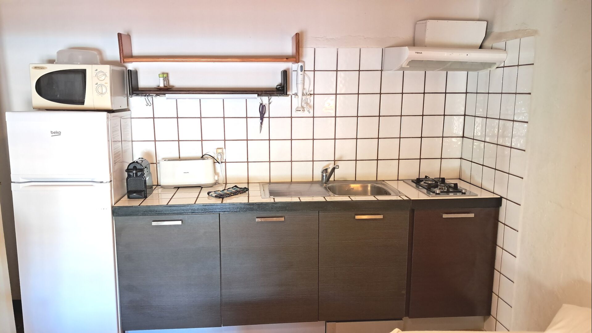La cocina está integrada con la sala común. Estábien equipada con lavavajillas, frigorífico-congelador, tostadora, cafetera de cápsulas Nespresso, microondas y vitrocerámica.