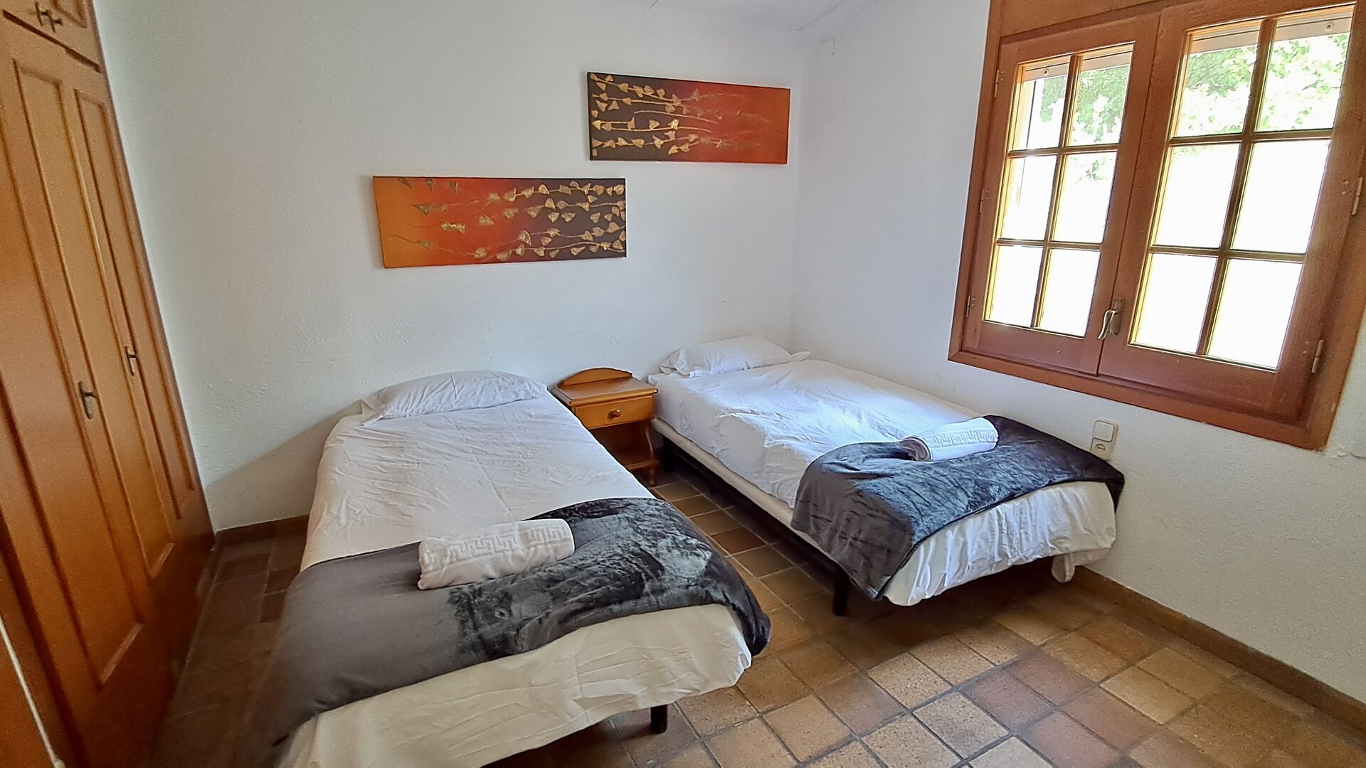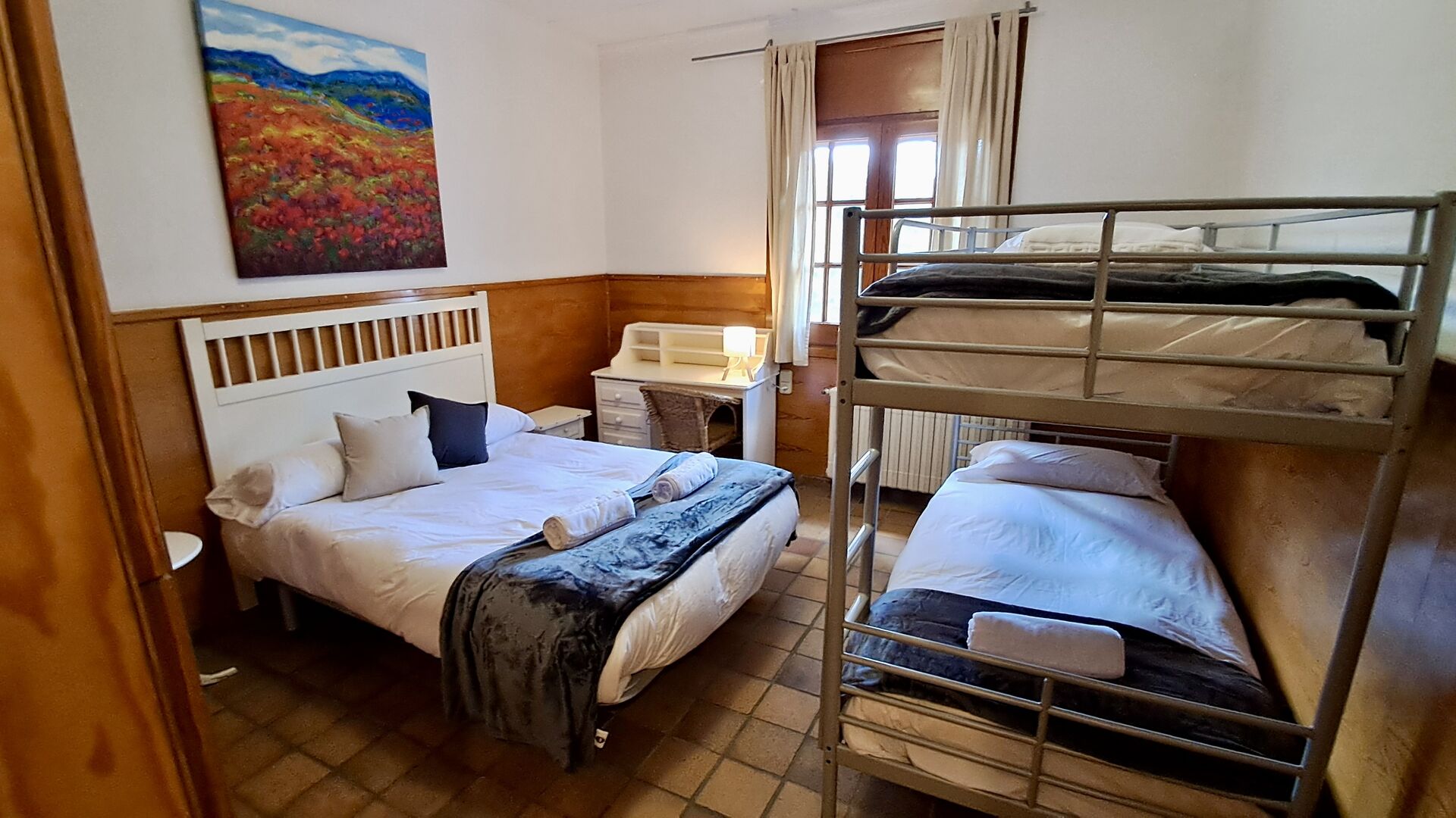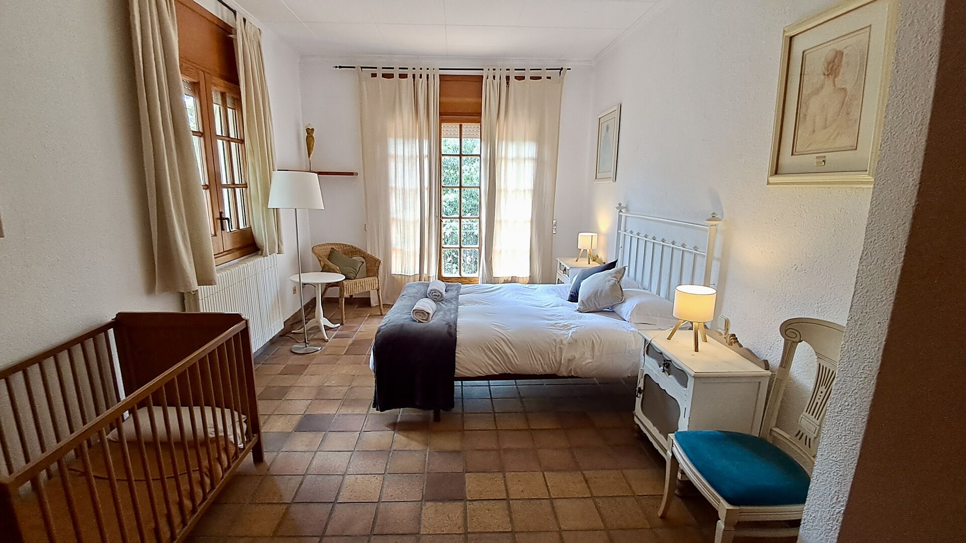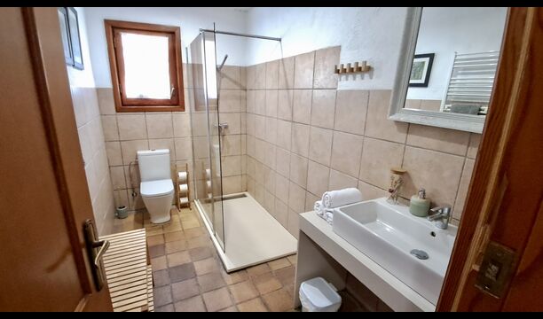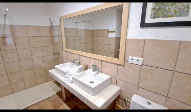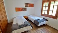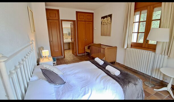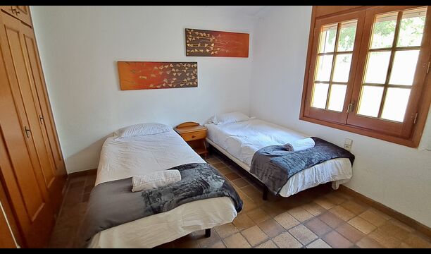 El otro pasillo se encuentra a lo largo de la casa y los dormitorios tienen vista al campo de golf. Aquí encontrará una habitación doble con cama de matrimonio, una habitación doble con dos camas individuales (dispuestas como cama de matrimonio), luego una habitación con cama de matrimonio y una litera (ideal para una familia). Estas habitaciones comparten un baño con ducha. Al final hay una habitación tipo suite con cama de matrimonio, baño privado y acceso directo a la terraza. Hay una cama de bebé en la habitación y también espacio para una cama supletoria si es necesario.