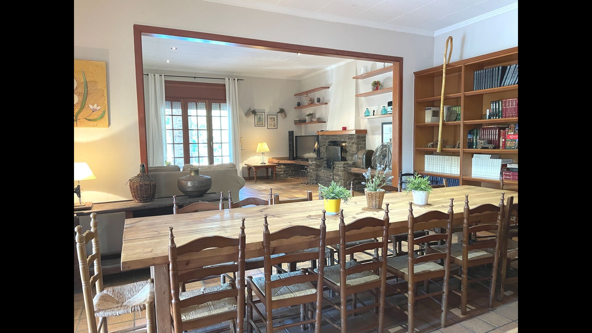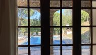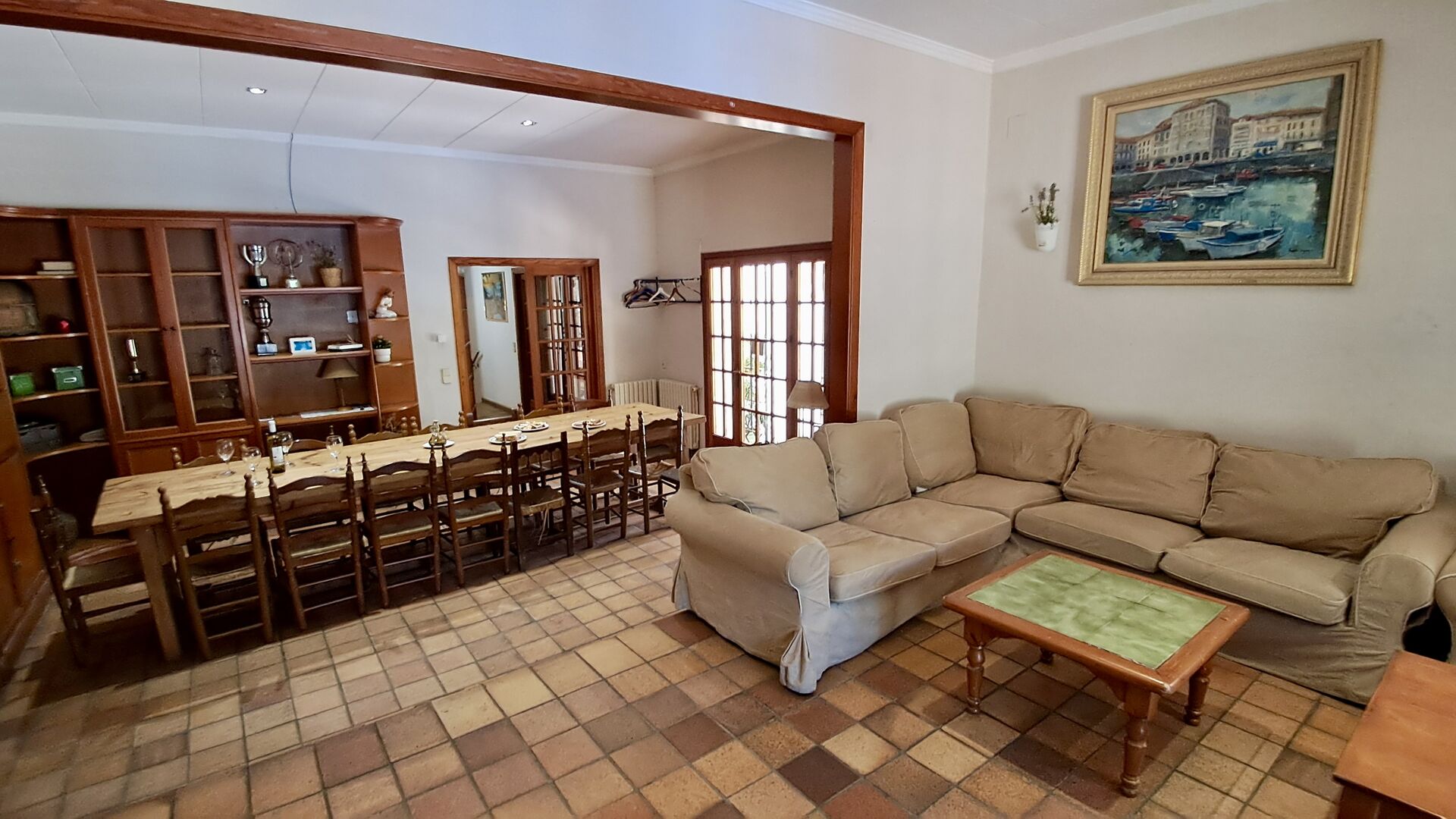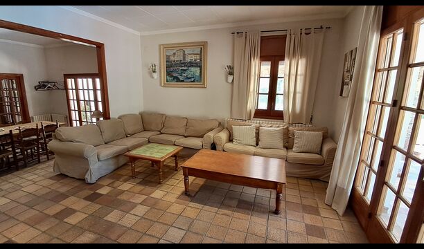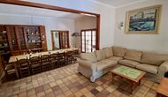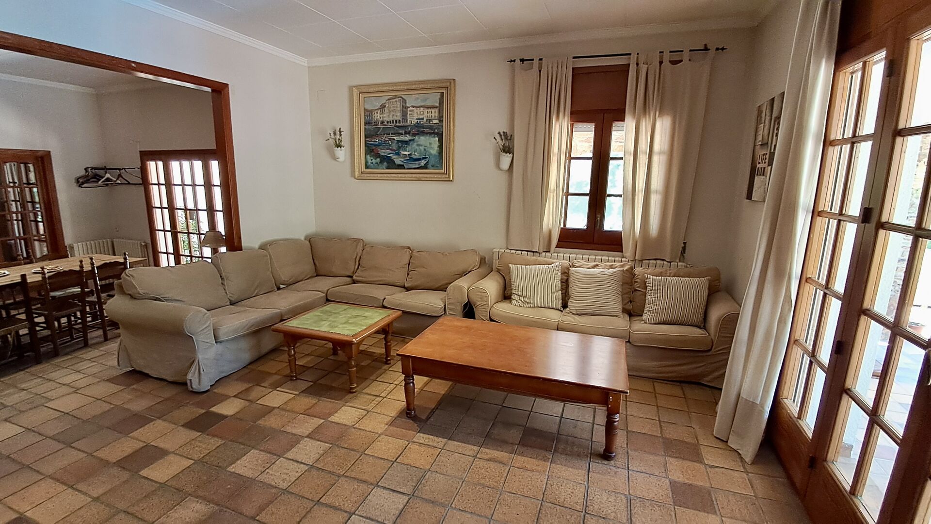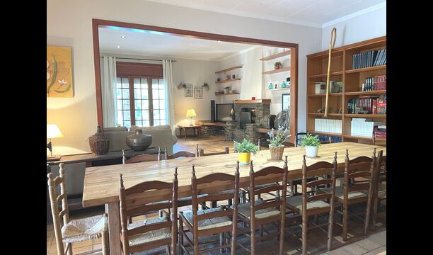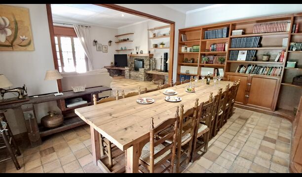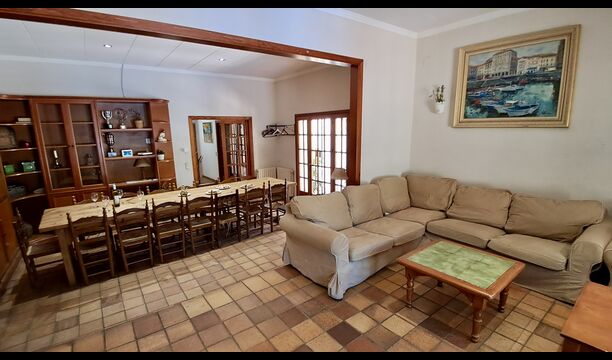 La casa tiene una sala común muy agradable y muy grande con una larga mesa de comedor en un extremo y luego un gran sofá en la esquina. Las grandes puertas dobles brindan vista y acceso al área de la piscina.