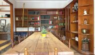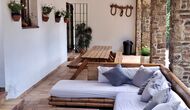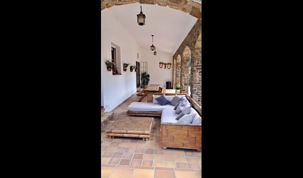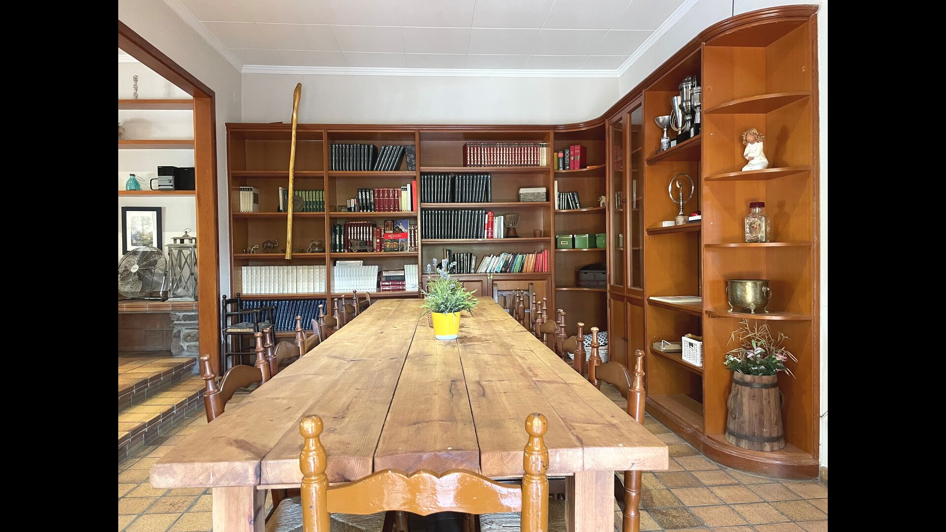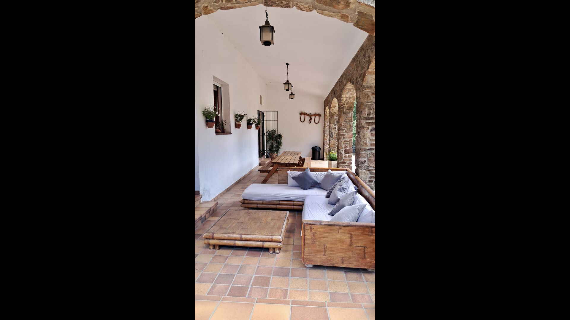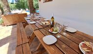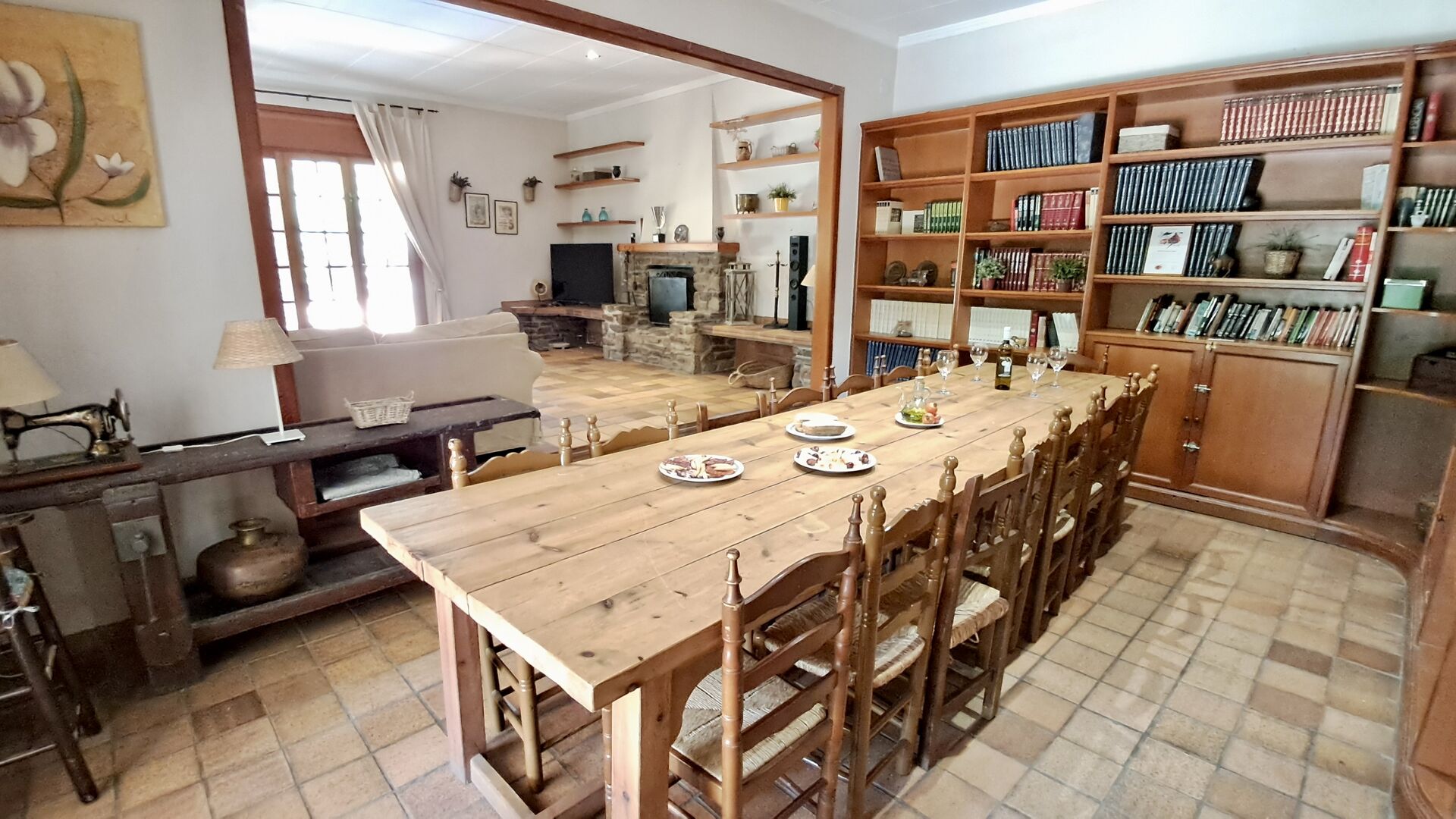 La casa tiene una sala común muy agradable y muy grande con una larga mesa de comedor en un extremo y luego un gran sofá en la esquina. Las grandes puertas dobles brindan vista y acceso al área de la piscina.