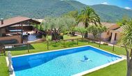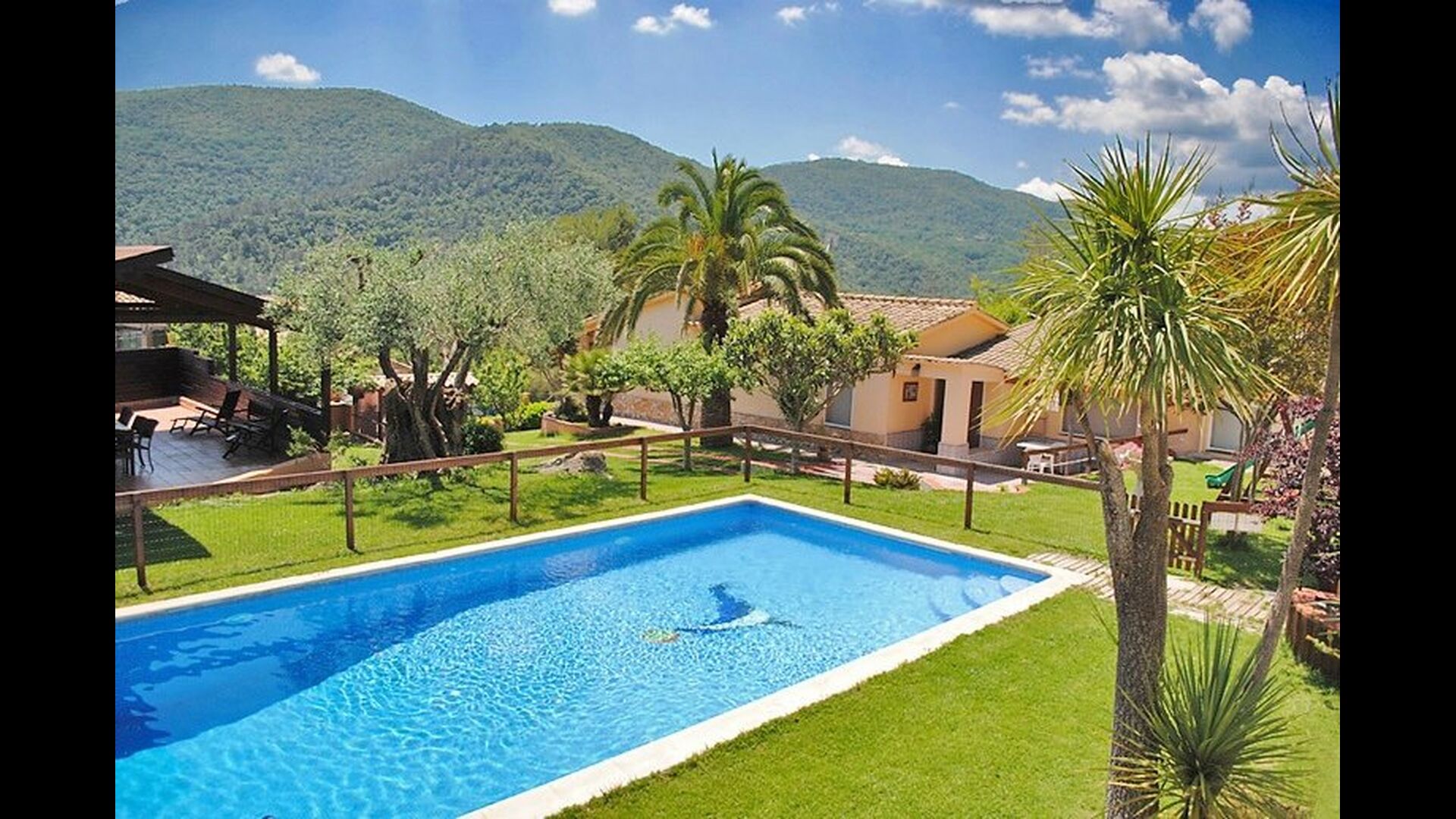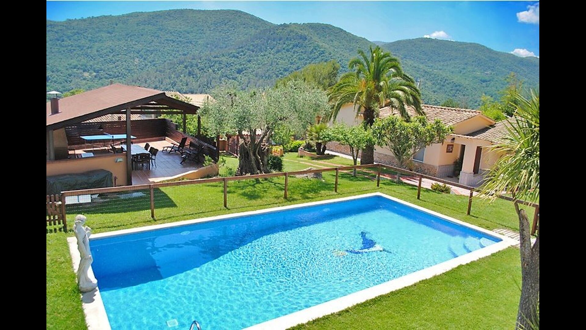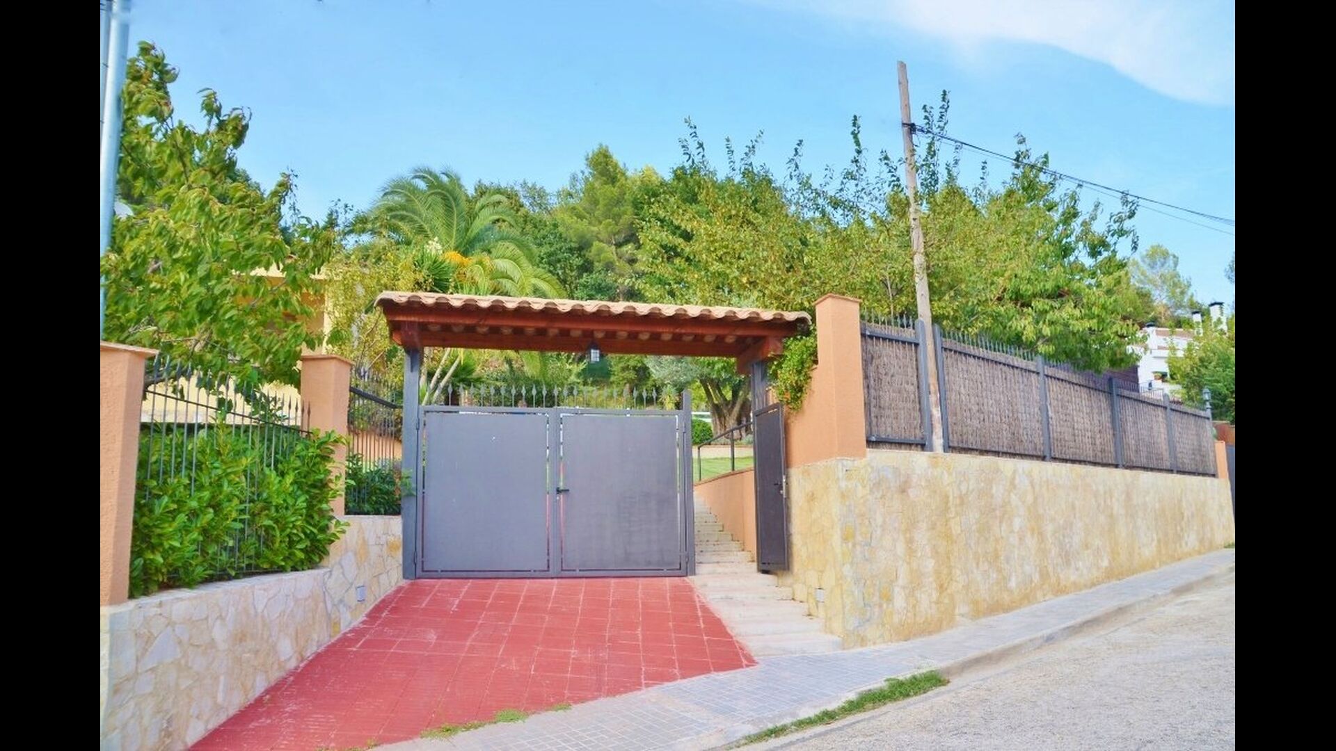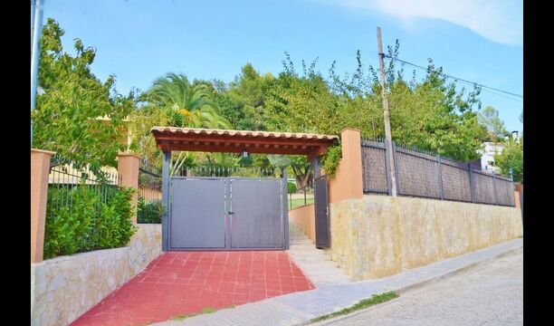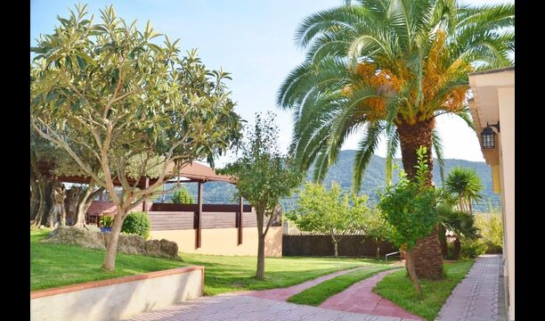 La casa está en una calle tranquila y está protegida por una pared y una puerta cerrada, por lo que se garantiza el 100% de privacidad. El jardín está plantado de palmeras y olivos centenarios y hermosos, creando un acogedor ambiente exótico mediterráneo. Las montañas catalanas se acumulan en el fondo y enmarcan todo el lugar en una atmósfera única.