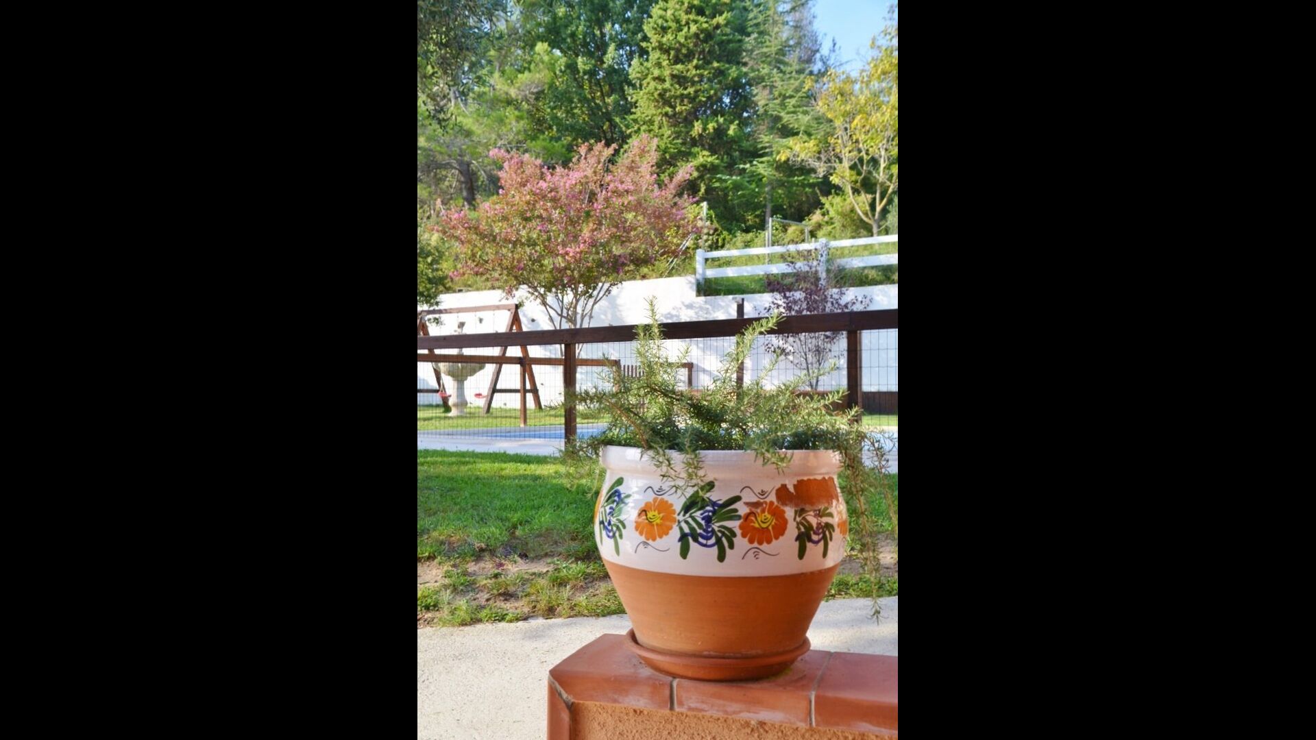 La piscina está cercada, lo que puede ser agradable si viaja con niños pequeños, y al final de la piscina hay un pequeño parque infantil con columpios, tobogán y una cancha de baloncesto, donde puede practicar la perfección de su tiro.