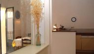 En la otra parte del piso, hay una sala de estar con sofás, un comedor con una gran mesa de comedor y una cocina abierta con productos como lavavajillas, lavadora, microondas, cafetera y tostadora. El comedor y la sala de estar tienen balcón a la calle. Además, hay un baño moderno con ducha y bañera.