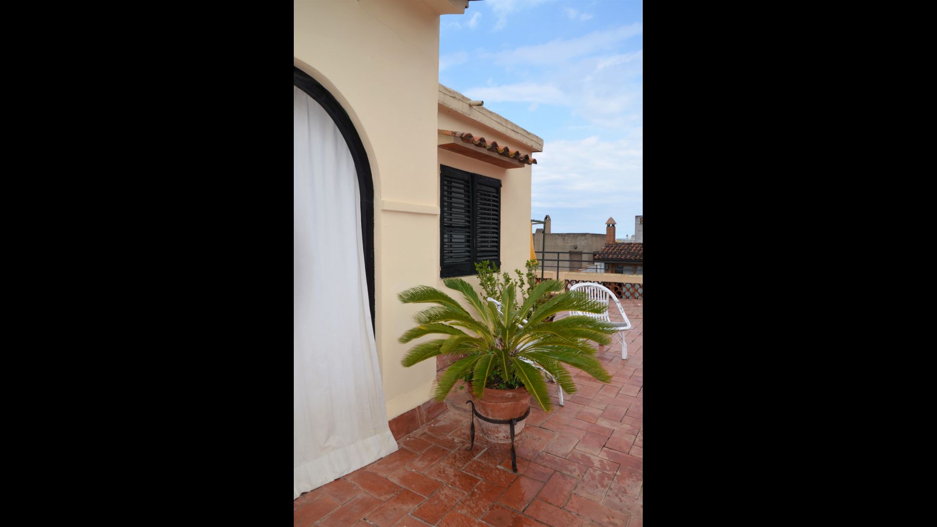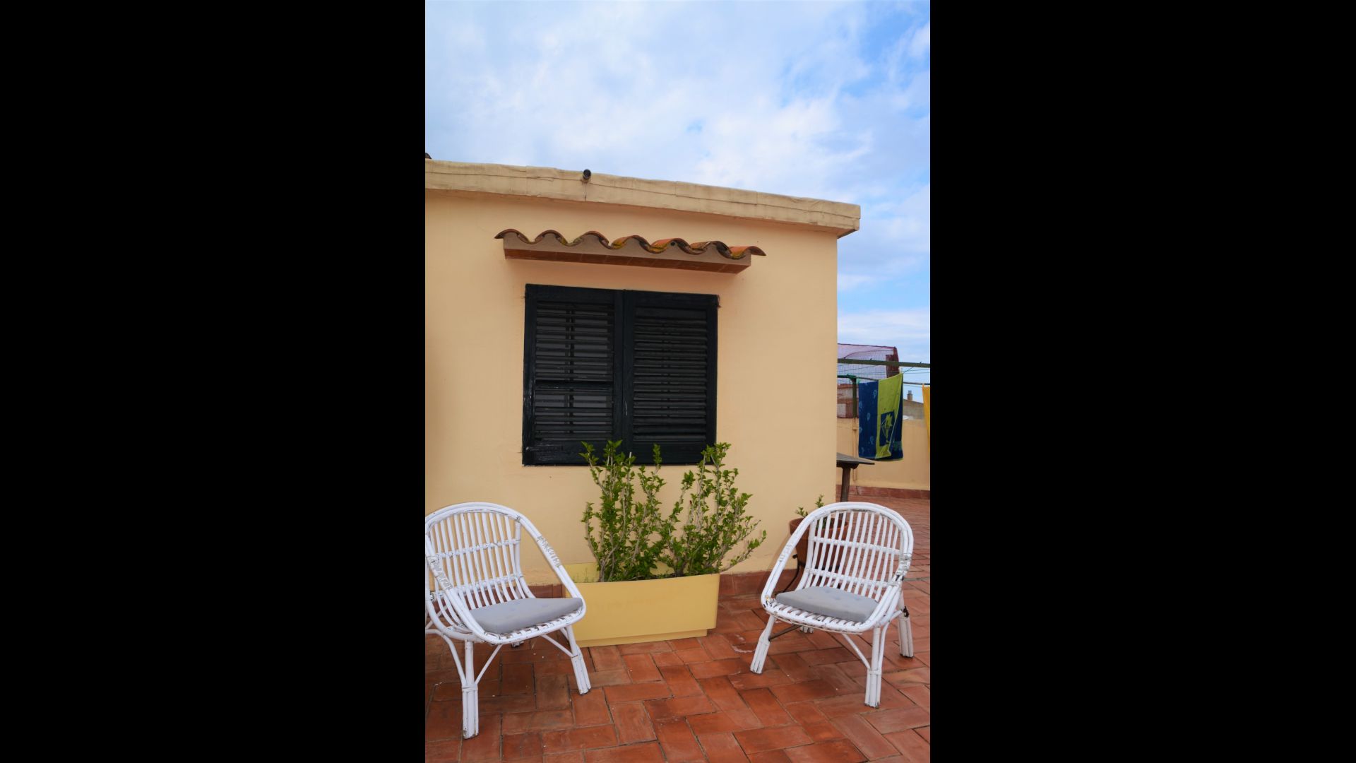 En la parte superior de la casa, hay una gran terraza en la azotea para su uso exclusivo. Aquí, puede disfrutar del sol, comer al aire libre o aprovechar la barbacoa. A la vuelta de la esquina, hay líneas para la lavandería. Para el verano habrá una sombra haciendo marquesa.
