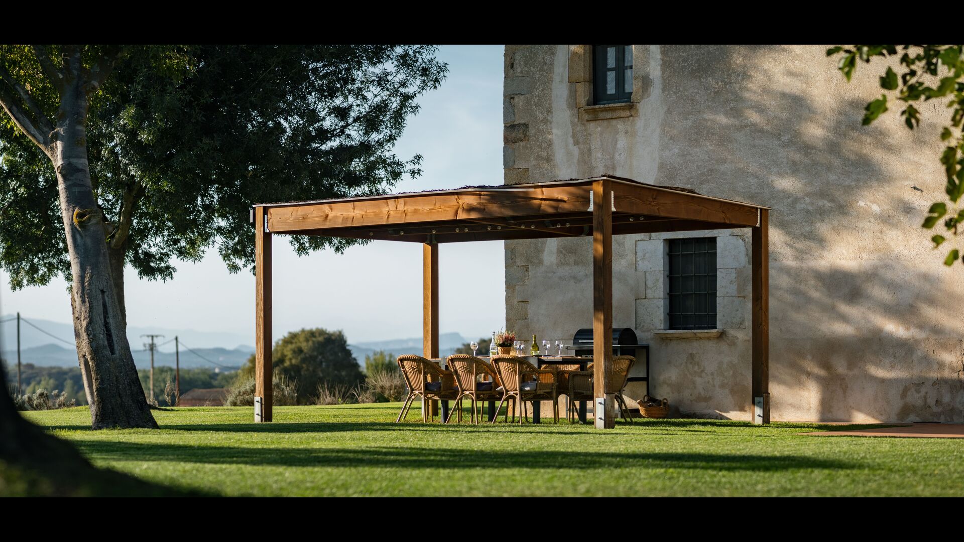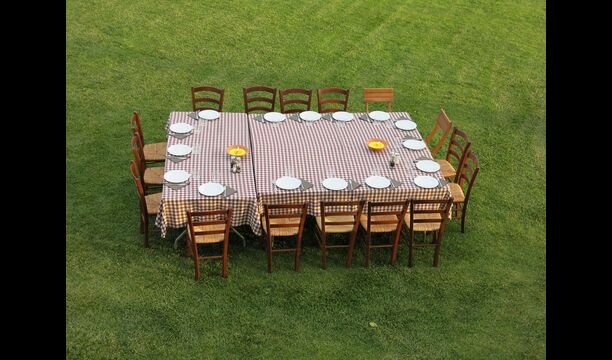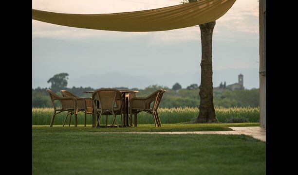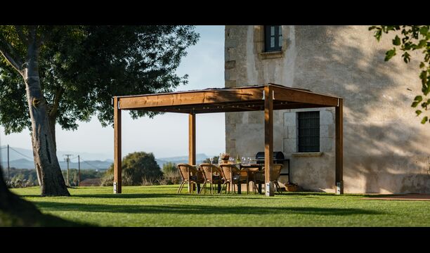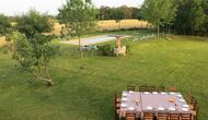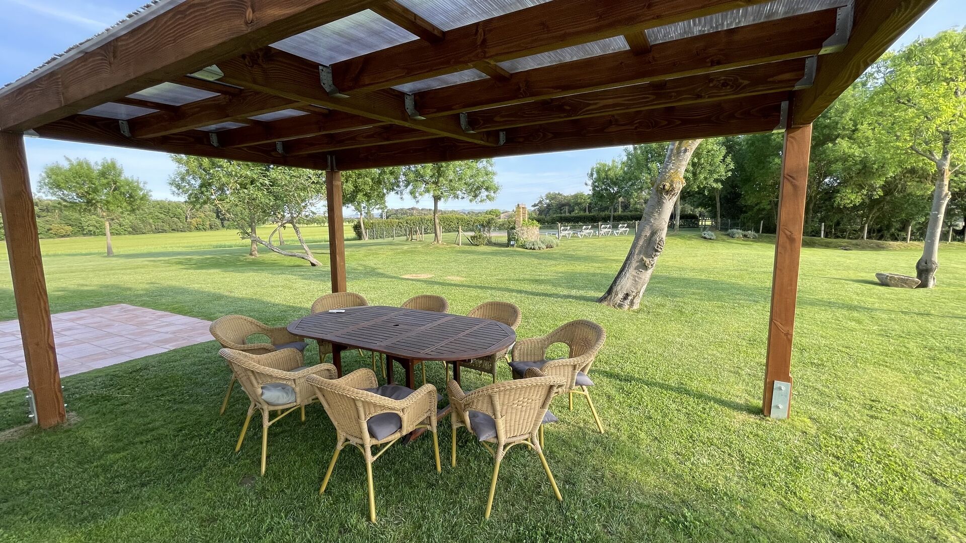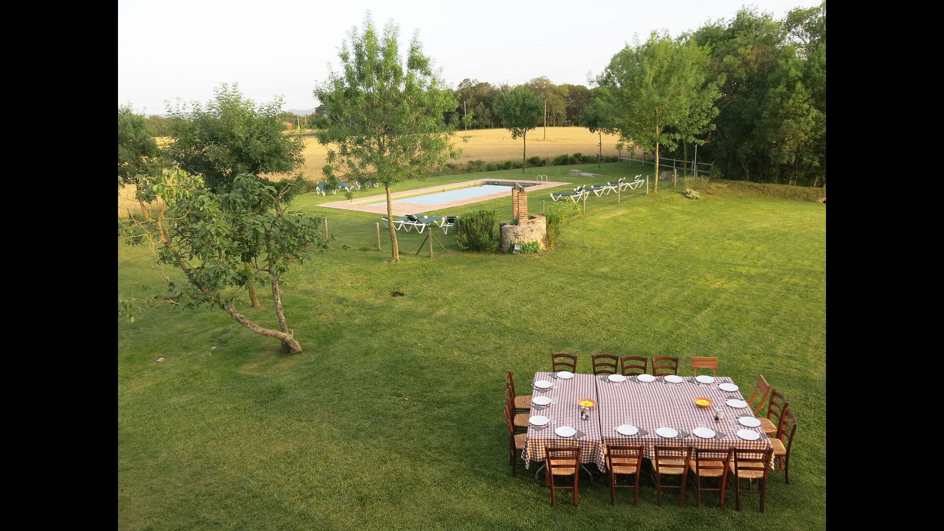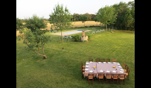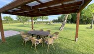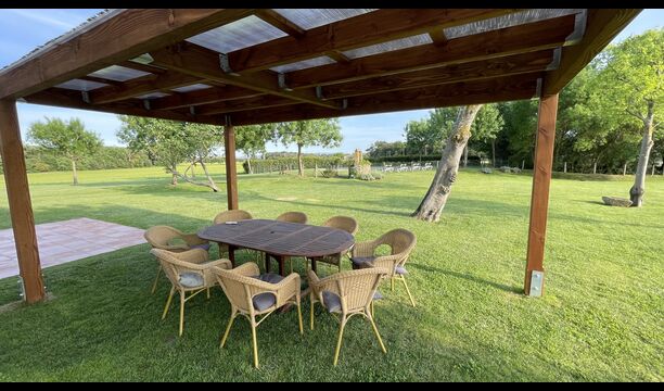 La casa de vacaciones tiene su propia gran piscina y un gran césped para jugar y tomar el sol. También hay una terraza al aire libre y muebles de exterior para que todos puedan disfrutar de su cena en grupo.