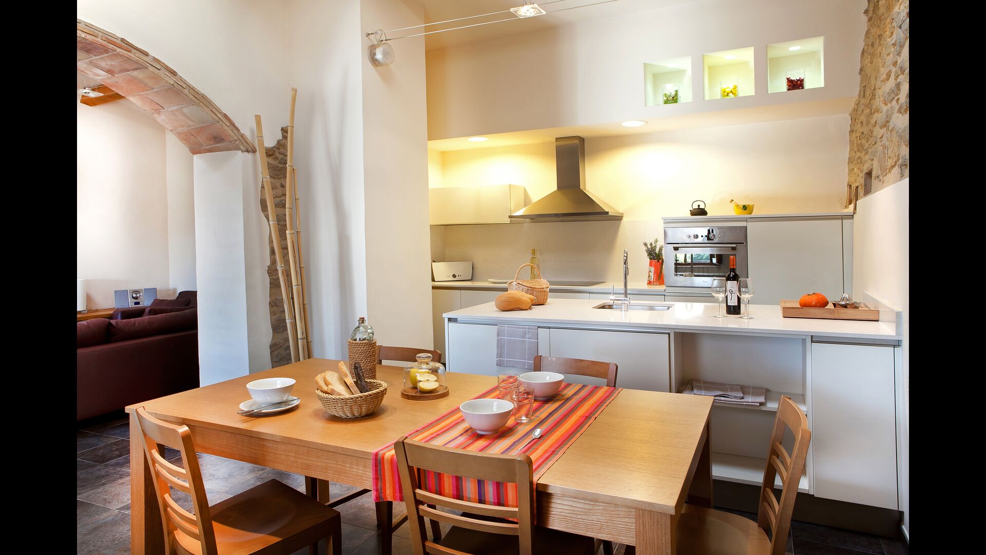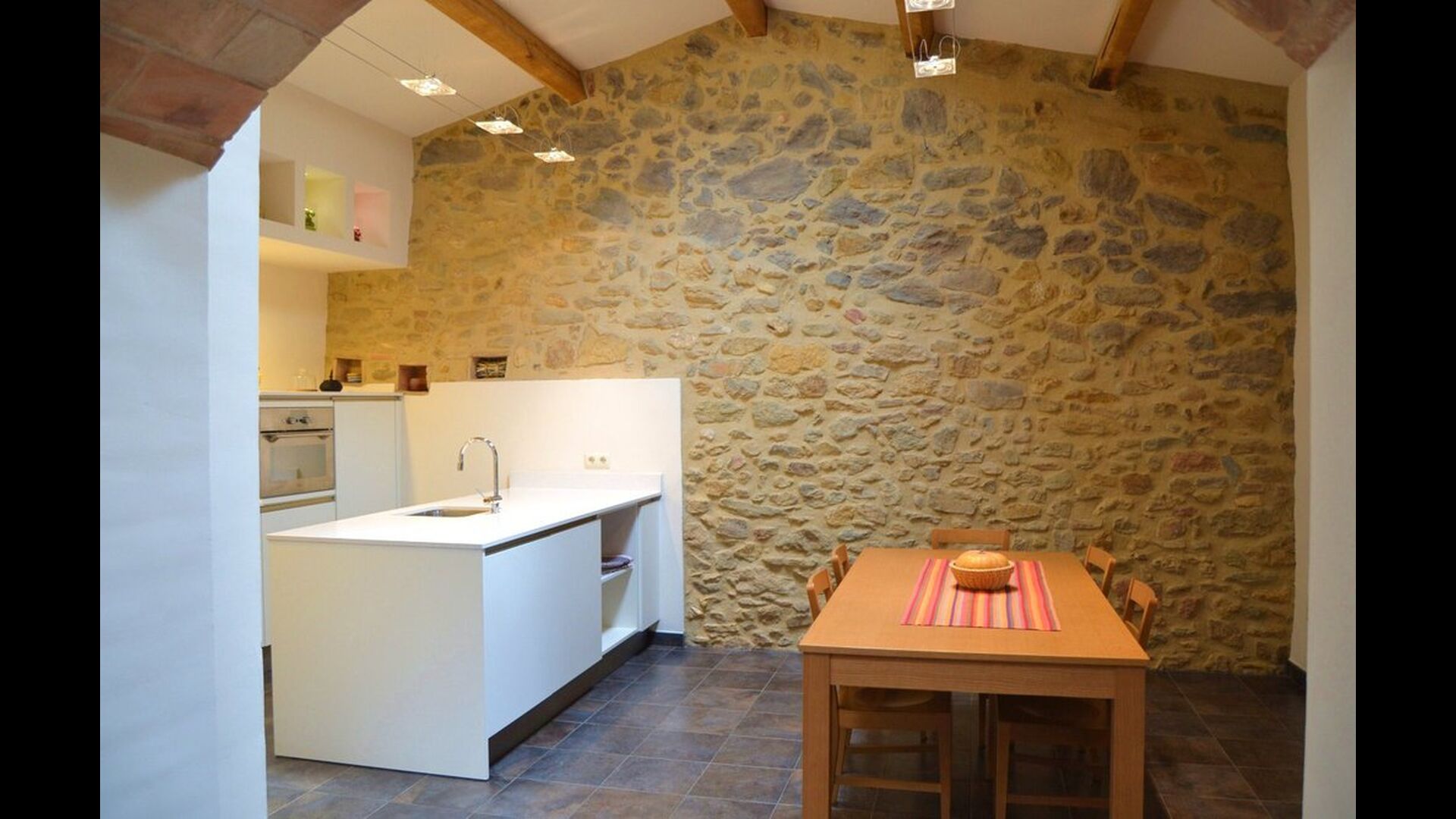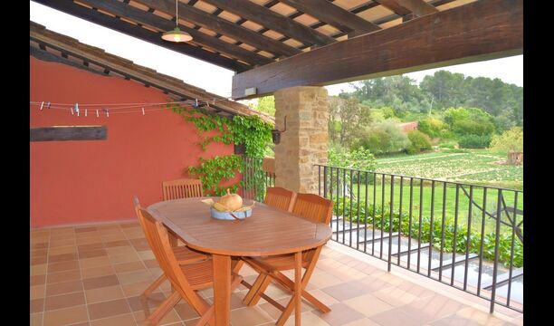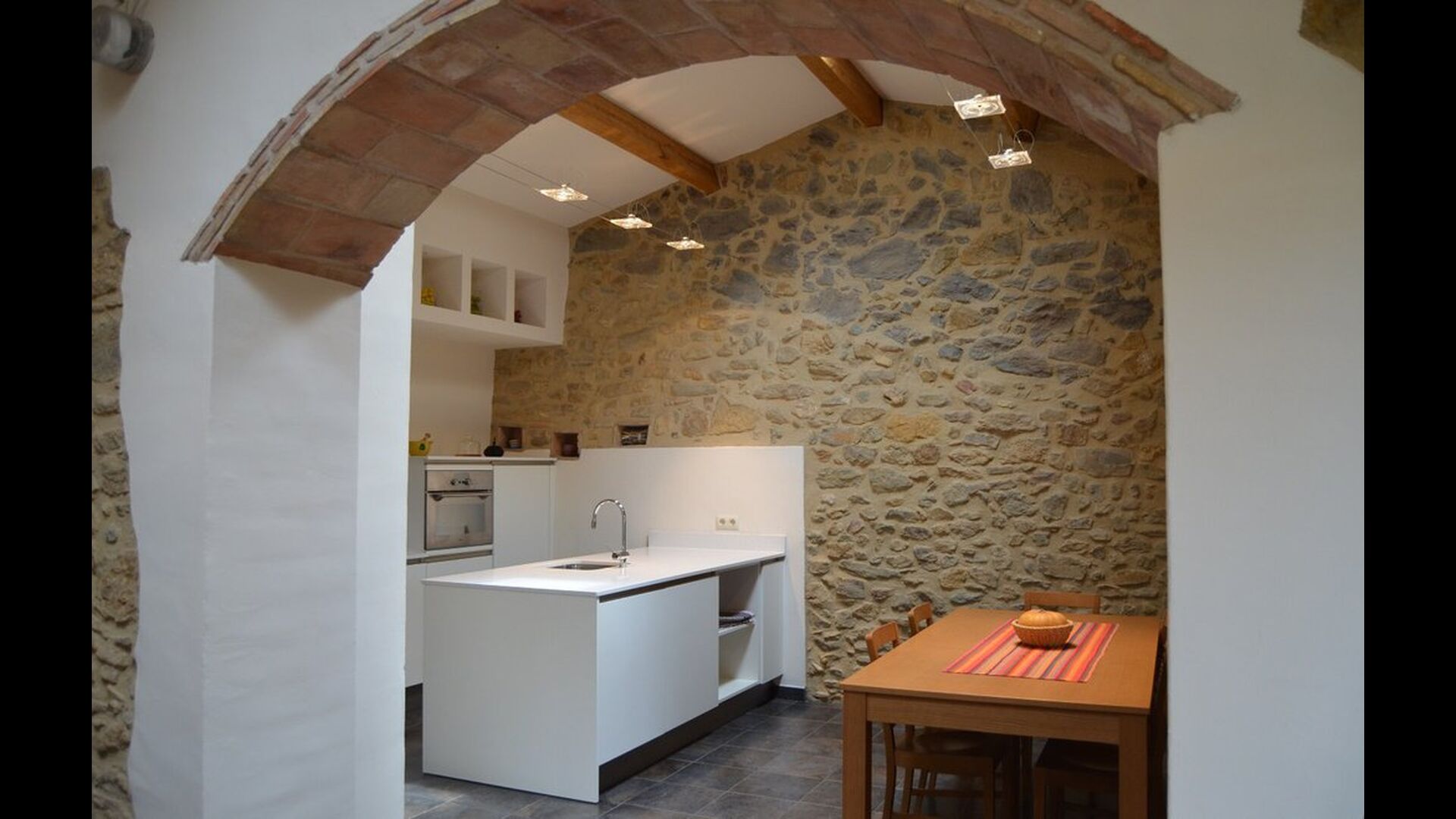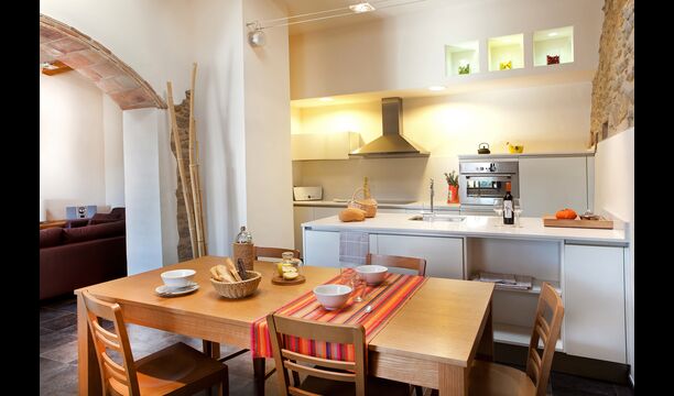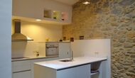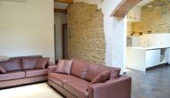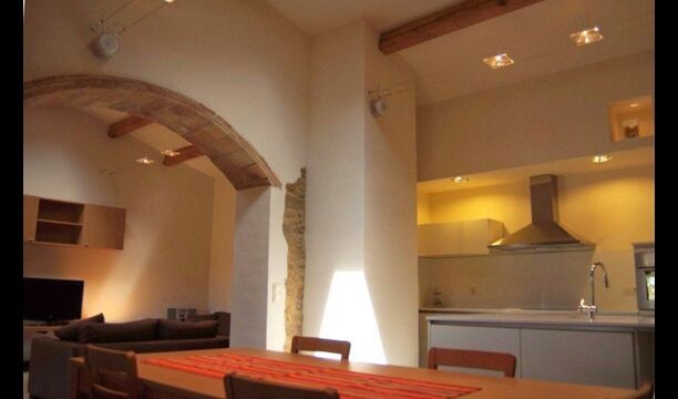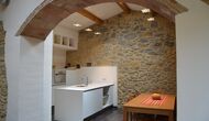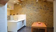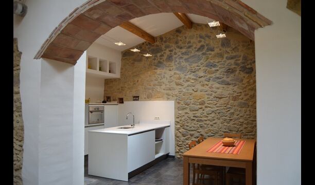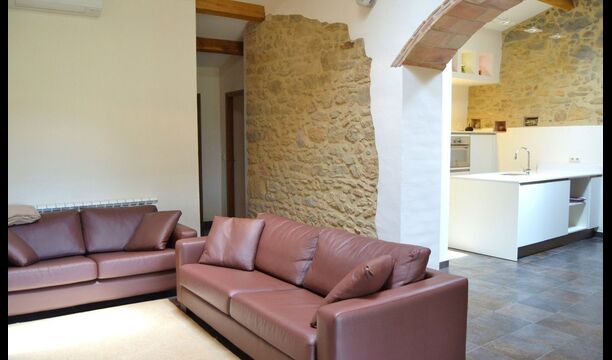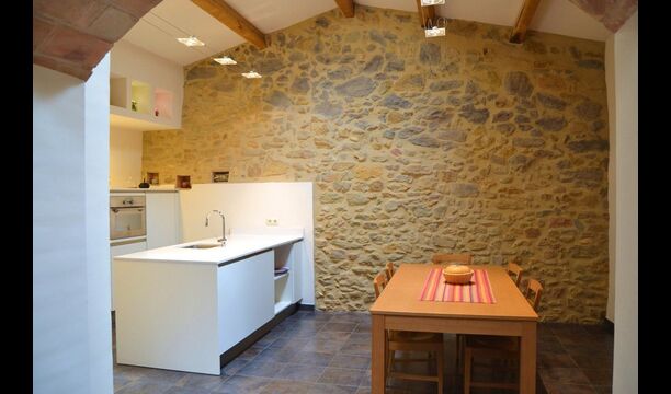 La sala de estar muy hermosa y moderna tiene un sofá en la esquina con un televisor, así como una cocina abierta y bien equipada y una bonita mesa de comedor. Las paredes de piedra en esta sala combinadas con las paredes blancas proporcionan un ambiente auténtico pero nuevo. El apartamento tiene una terraza privada con vistas al jardín y al hermoso entorno, y aquí también hay una mesa de comedor donde se puede disfrutar de la comida casera en las cálidas noches catalanas.