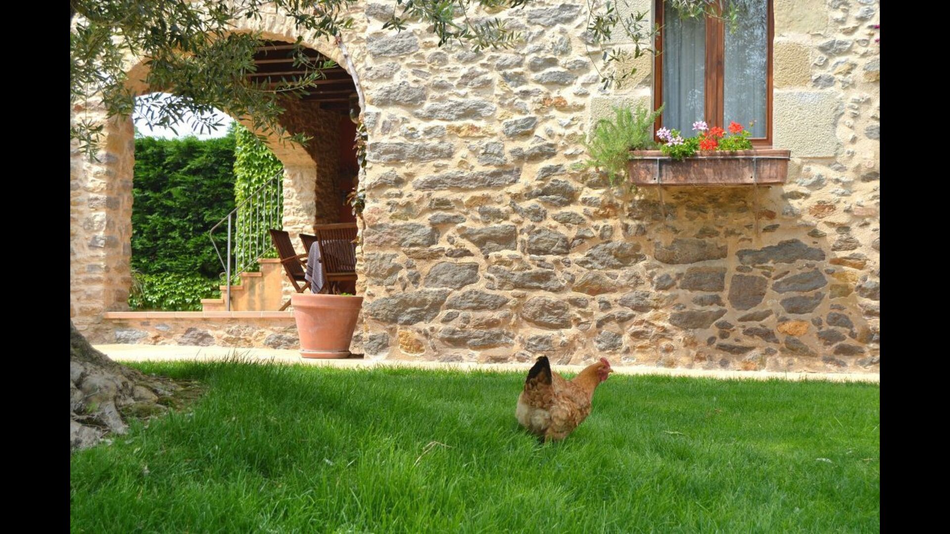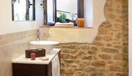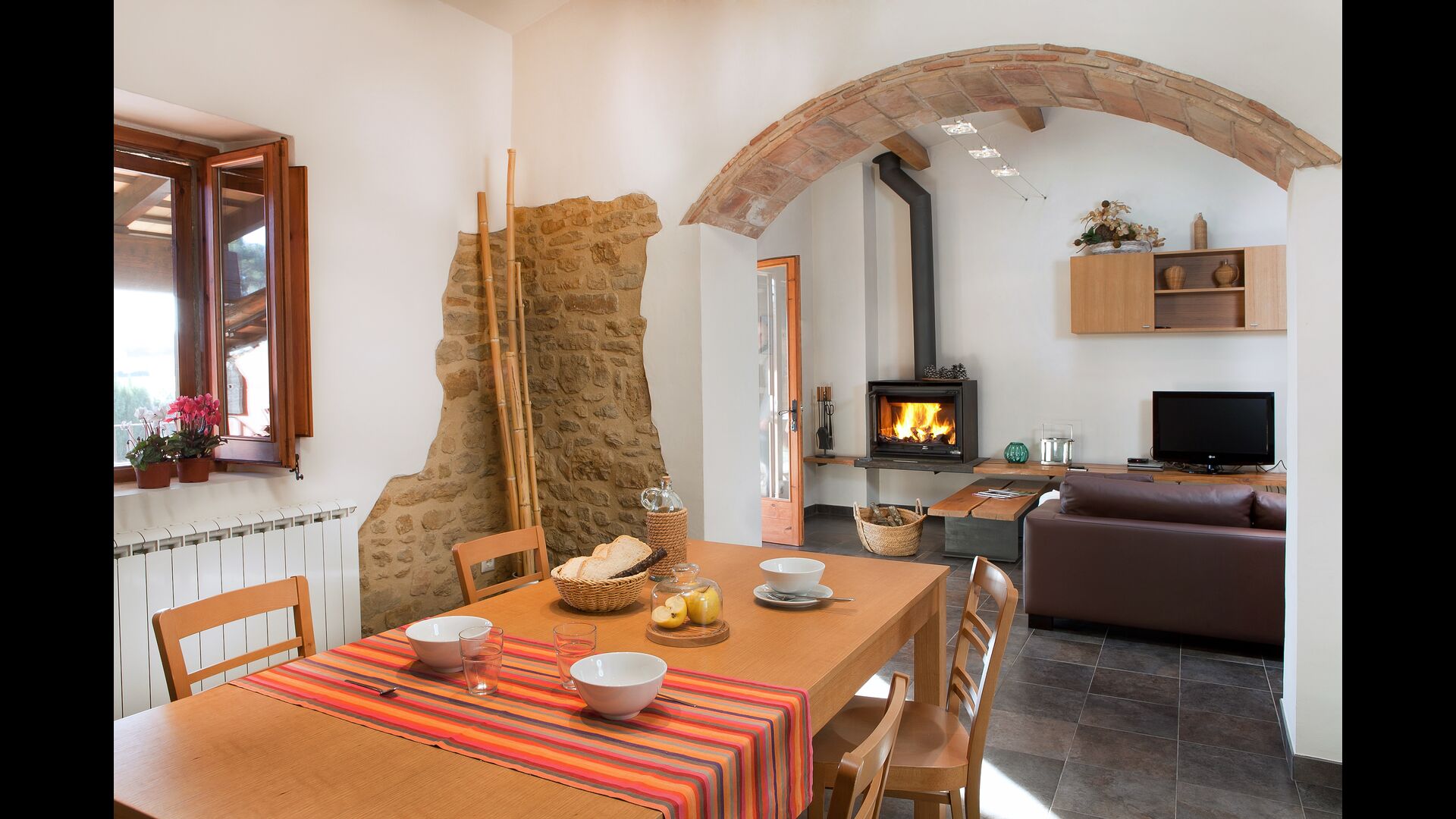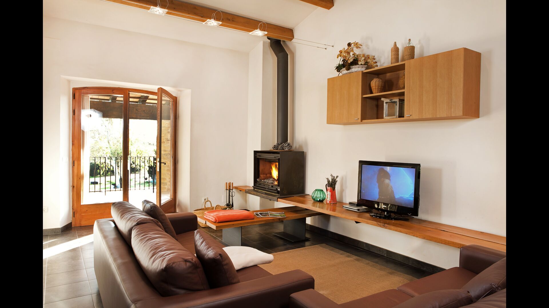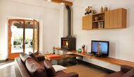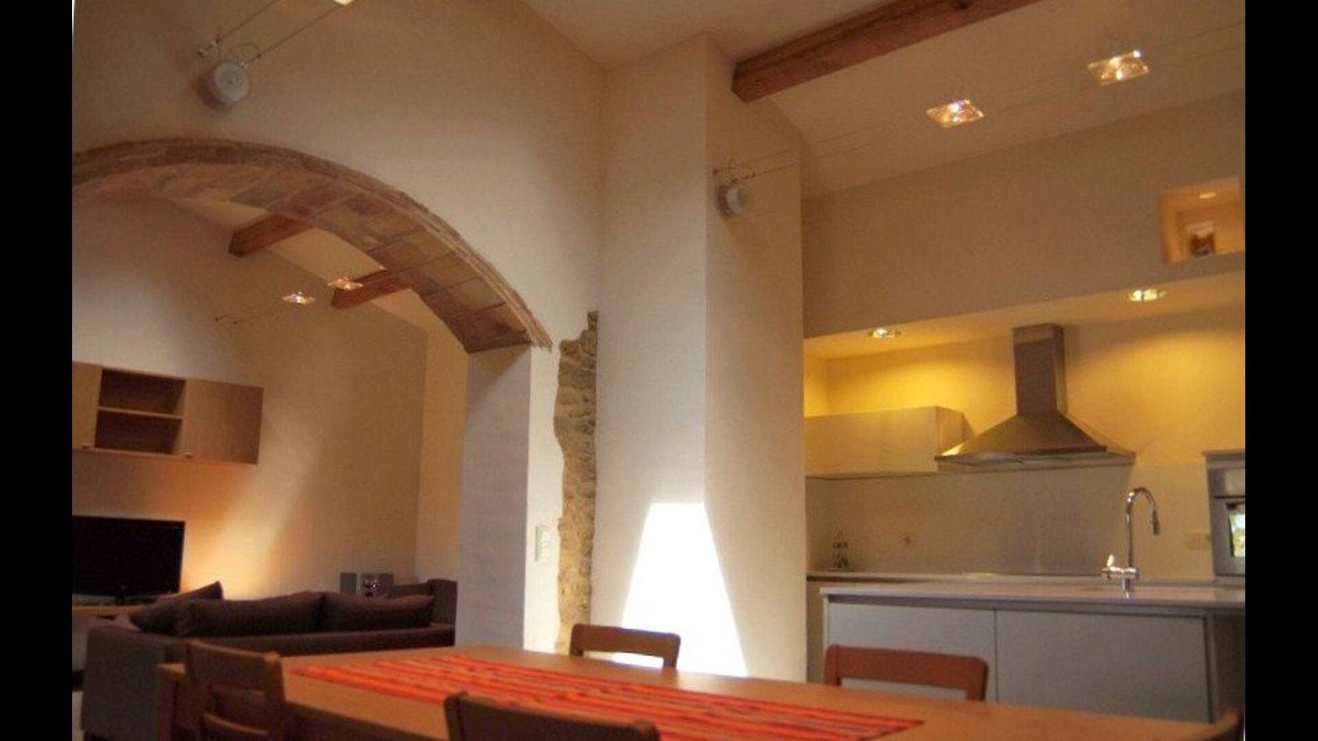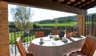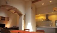 La sala de estar muy hermosa y moderna tiene un sofá en la esquina con un televisor, así como una cocina abierta y bien equipada y una bonita mesa de comedor. Las paredes de piedra en esta sala combinadas con las paredes blancas proporcionan un ambiente auténtico pero nuevo. El apartamento tiene una terraza privada con vistas al jardín y al hermoso entorno, y aquí también hay una mesa de comedor donde se puede disfrutar de la comida casera en las cálidas noches catalanas.