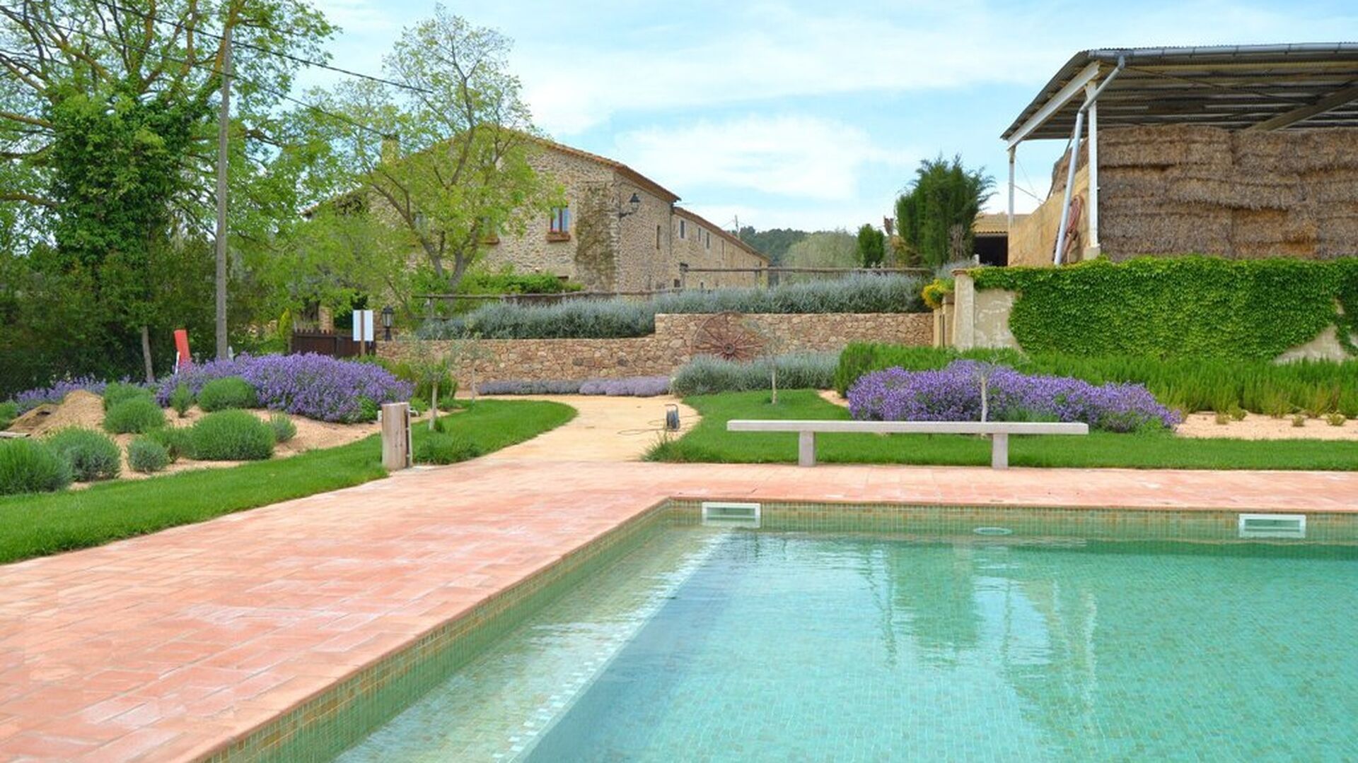 Amplia zona de piscina con terraza cubierta y aseos.
