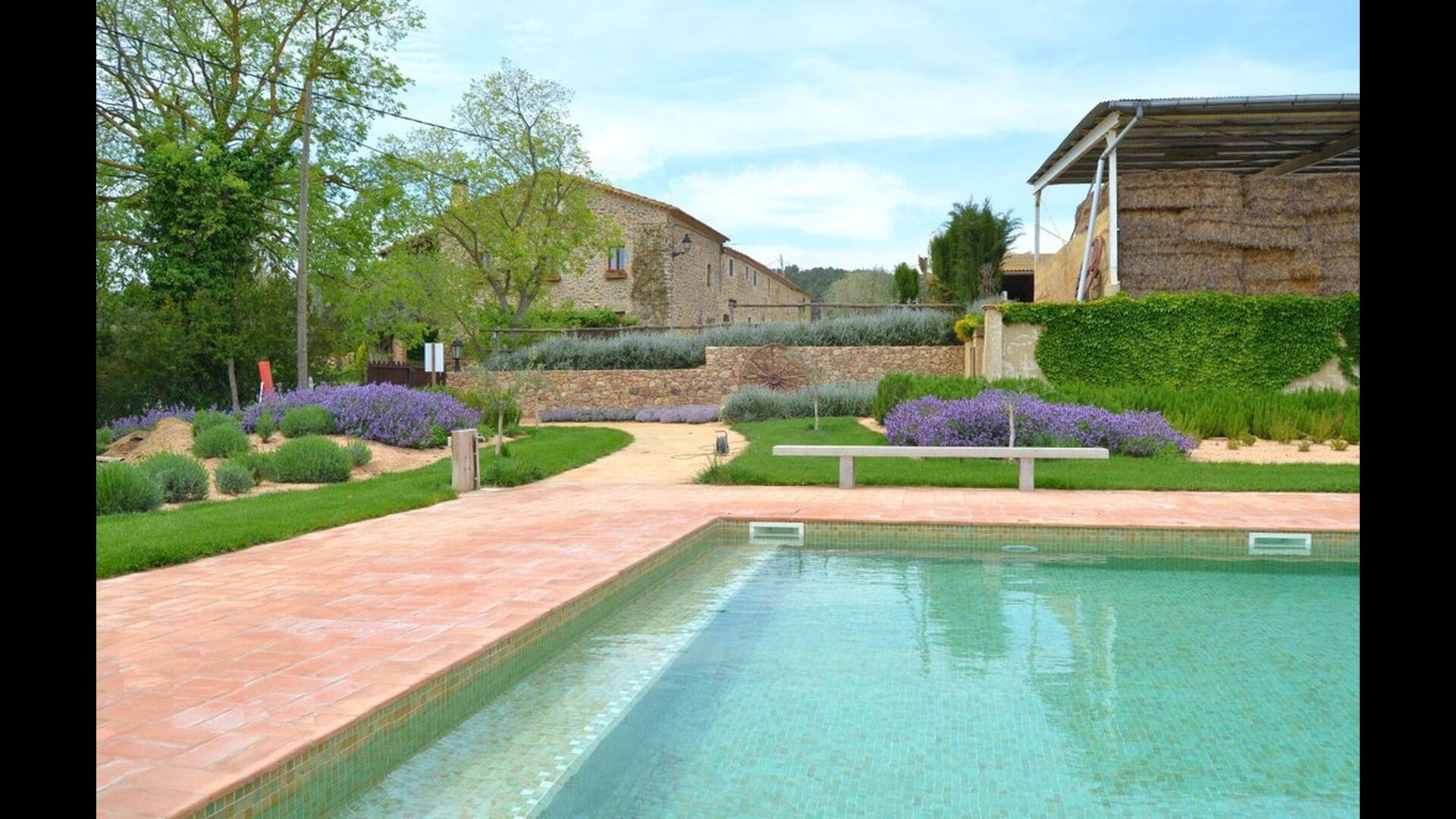 Gran piscina de 14 x 7 metros con escalera romana.