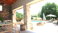 Comedor abierto con sofás y acceso directo a la zona de la piscina.