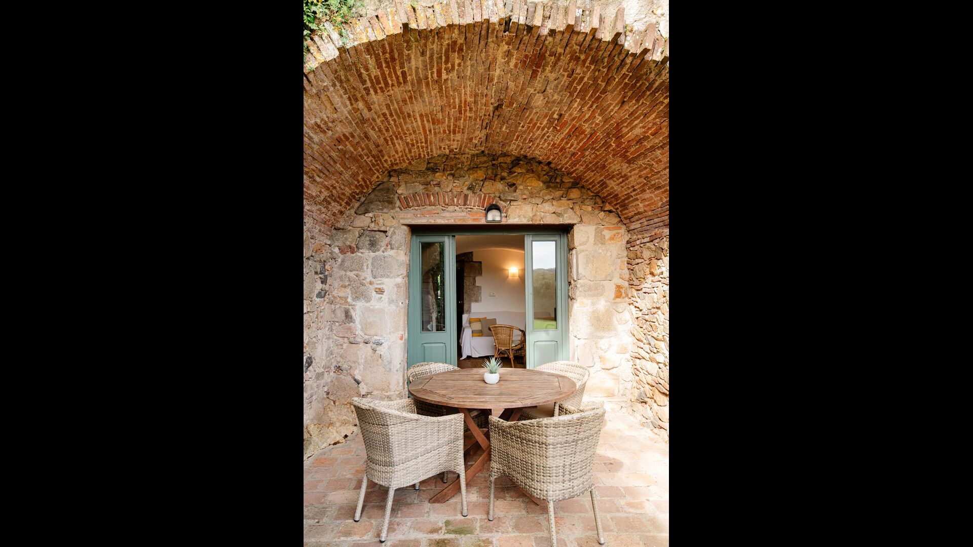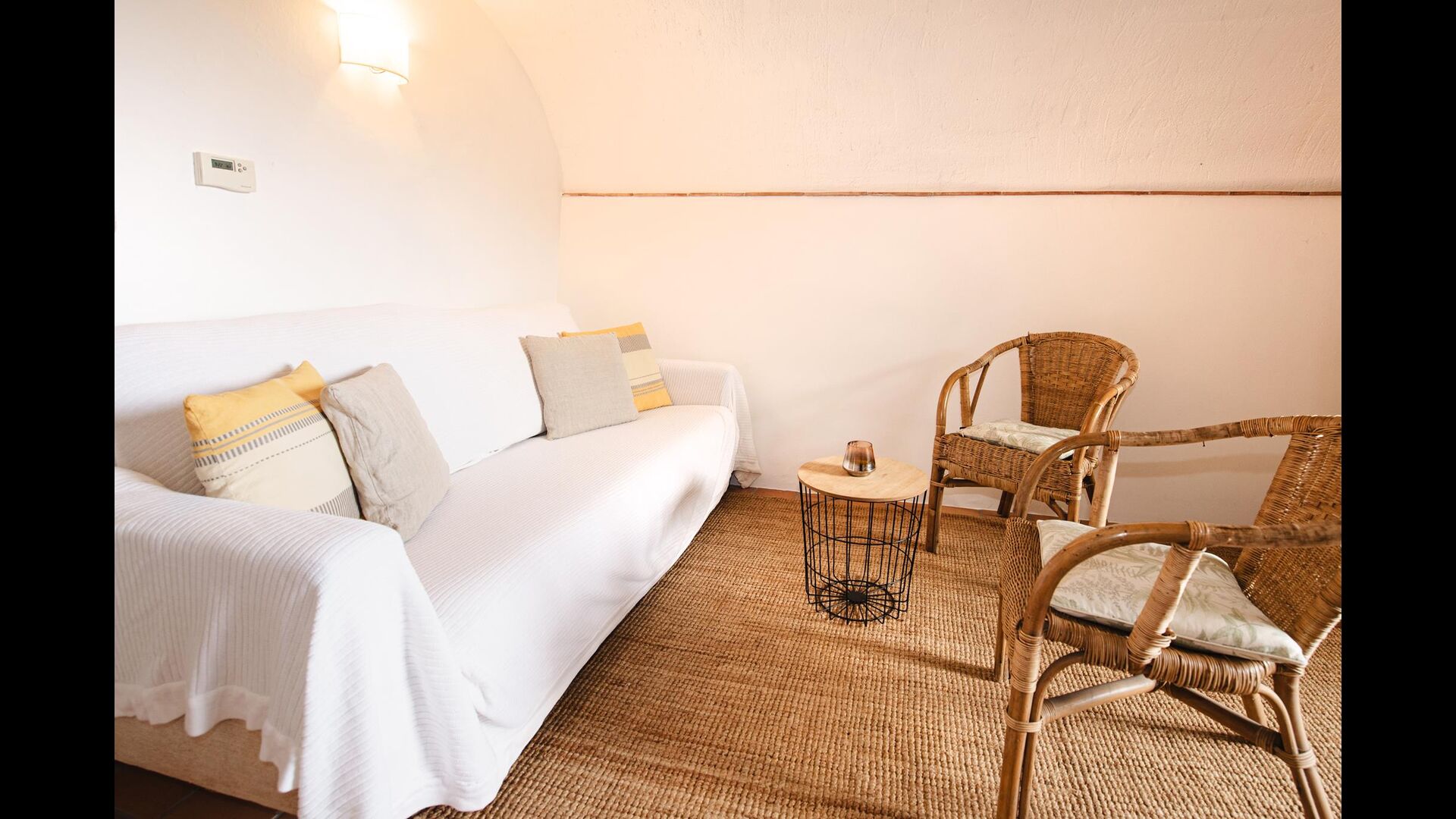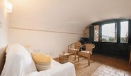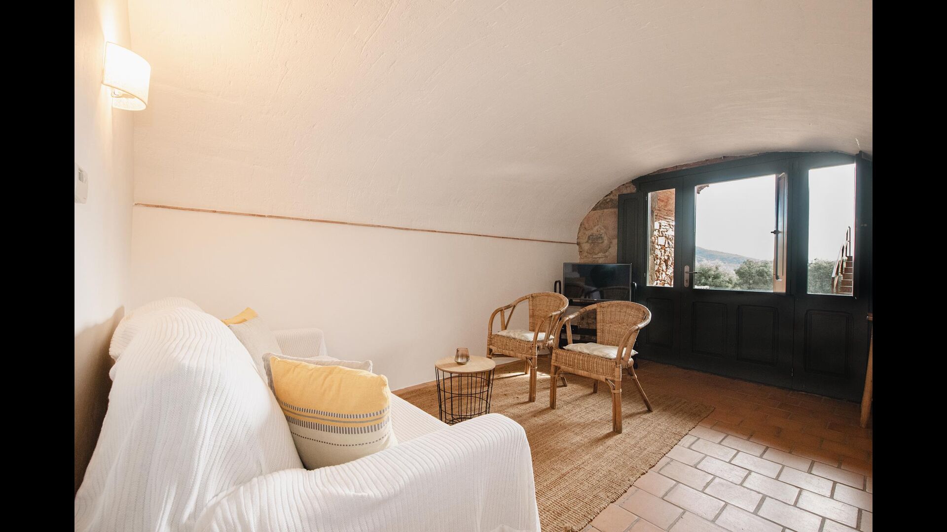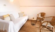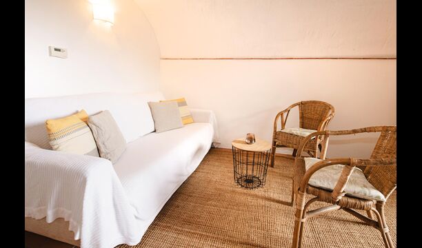 En la entrada a La Cort hay una terraza privada con una disposición de asientos que consiste en sillas y mesa de madera. Justo dentro de la puerta se encuentra la acogedora sala de estar con sofá y televisión vía satélite.