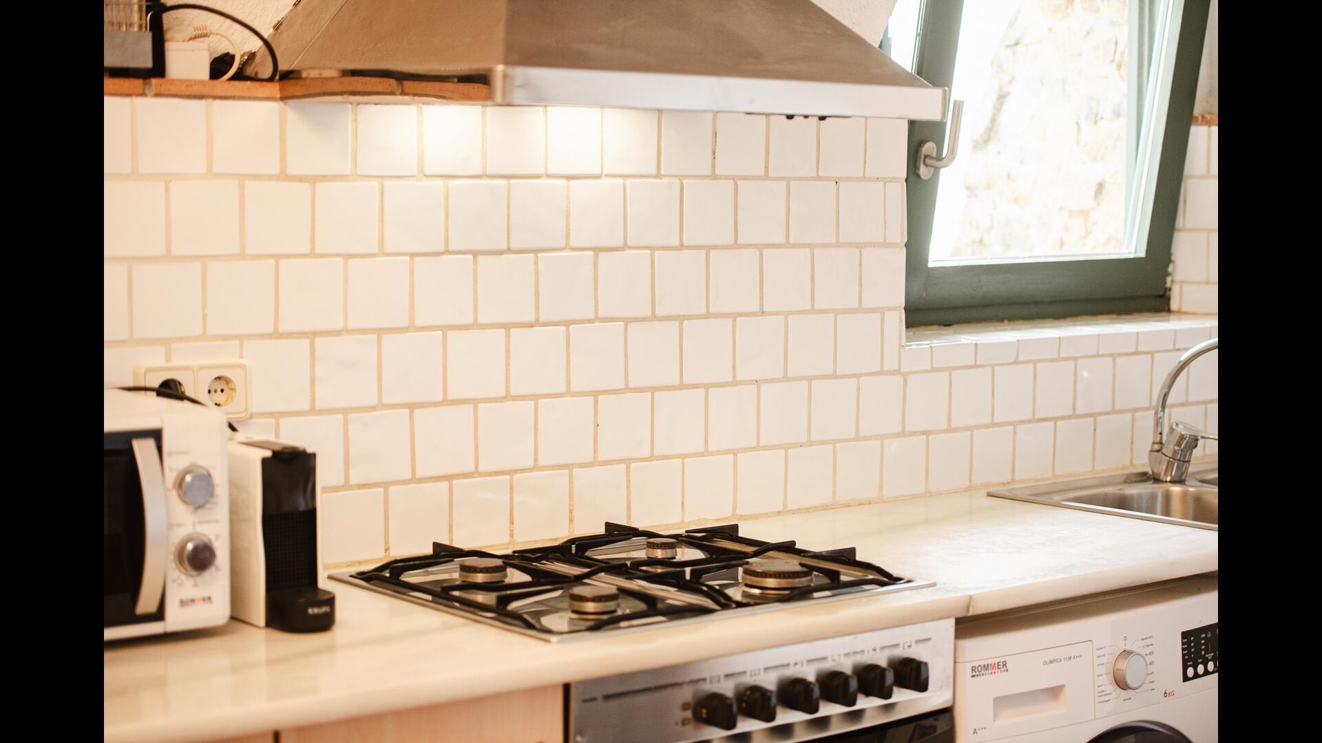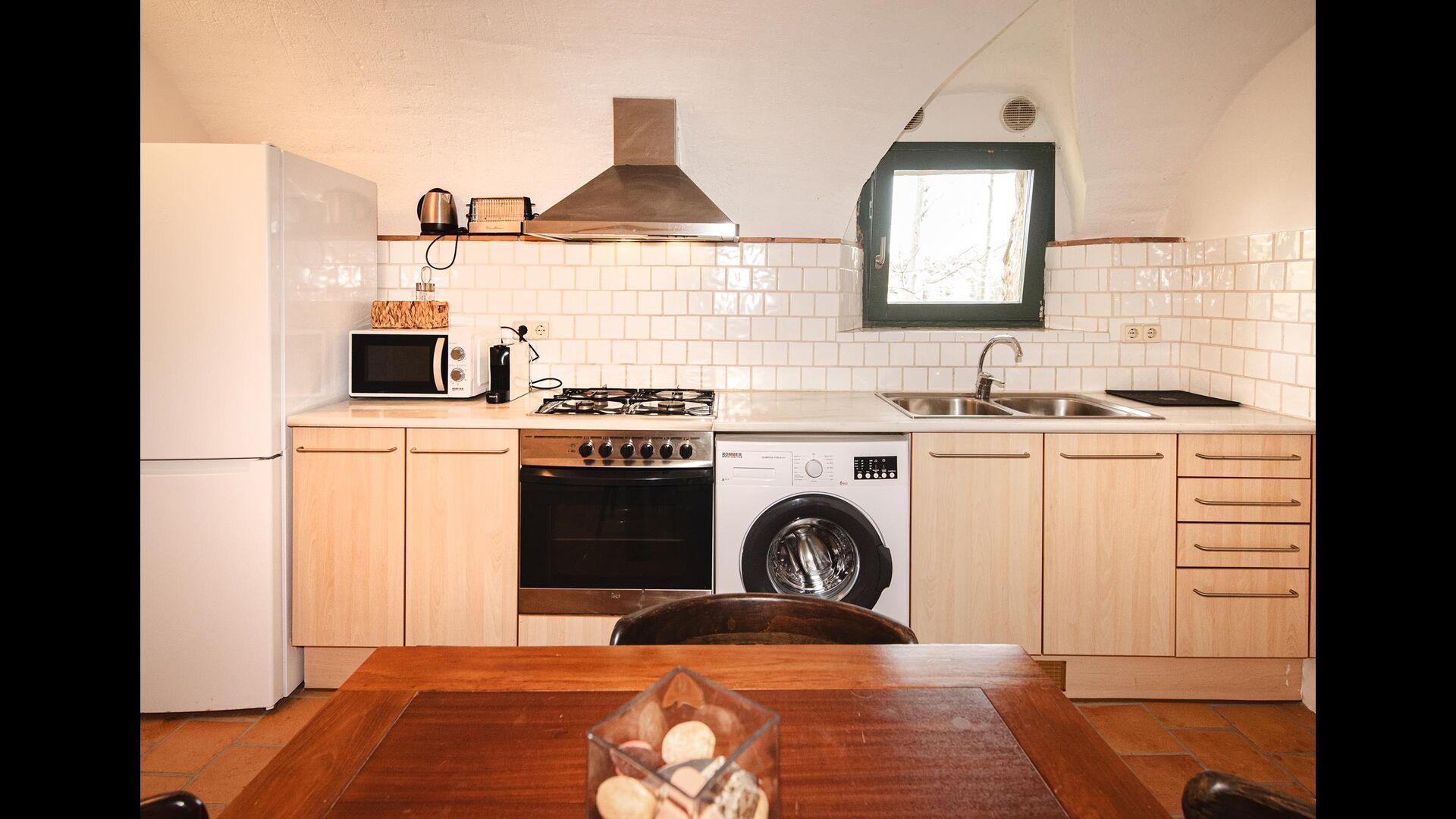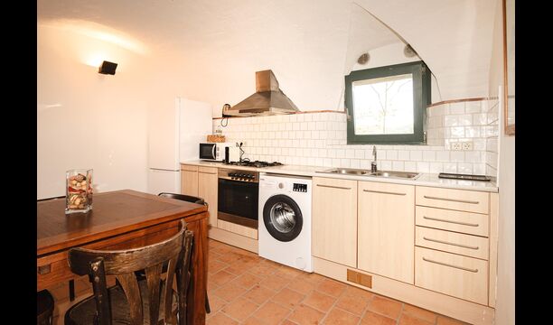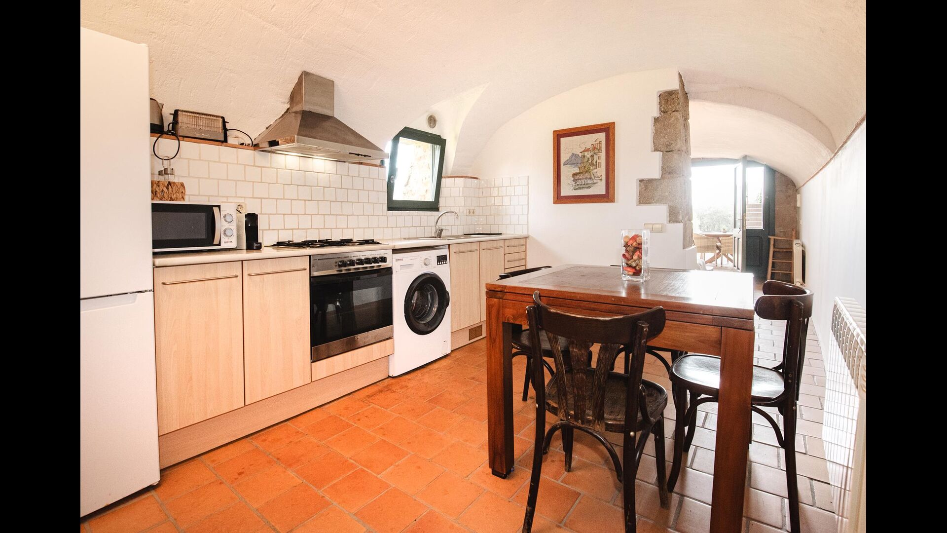 La cocina está muy bien equipada. Aquí hay una lavadora, horno, estufa, refrigerador, congelador, microondas, tostadora y mesa de comedor, útil si el clima es demasiado malo para cenar en la terraza, aunque esto es muy poco probable, ya que Cataluña tiene un número inusualmente alto de días soleados por año. .