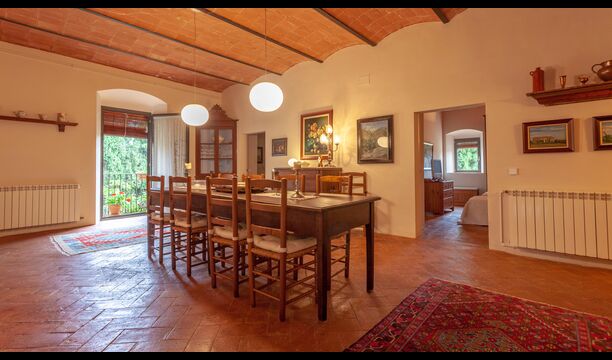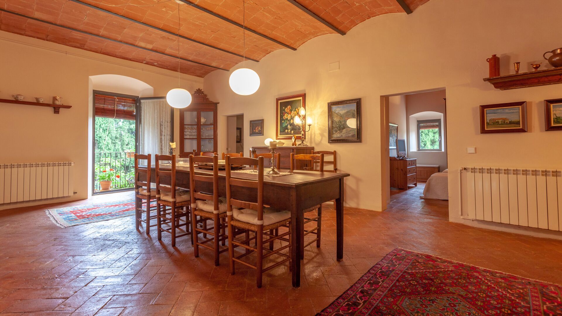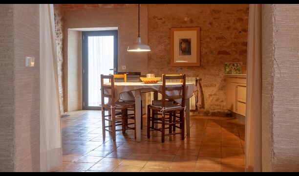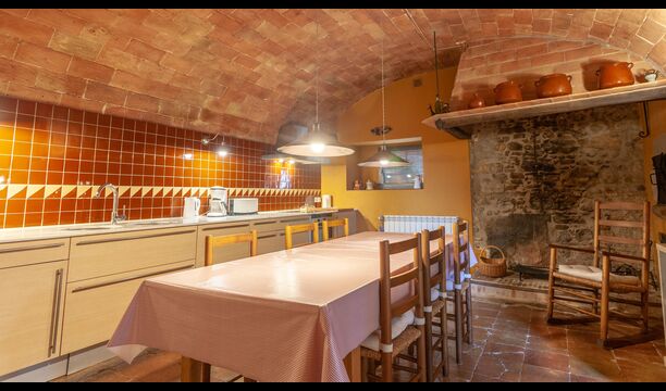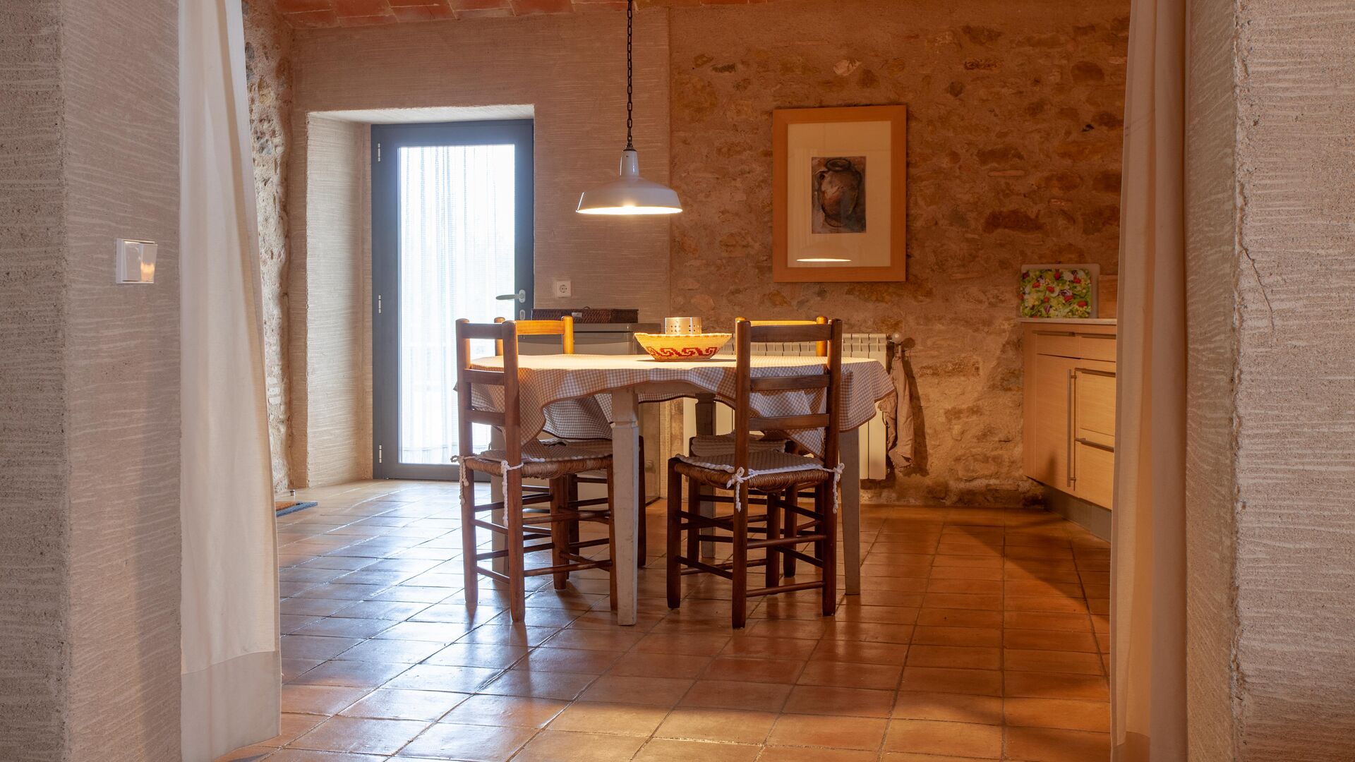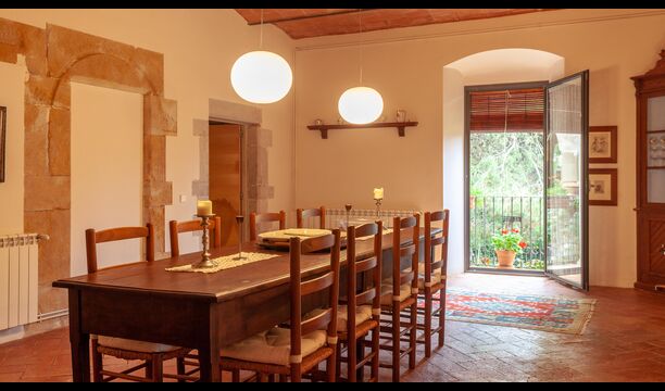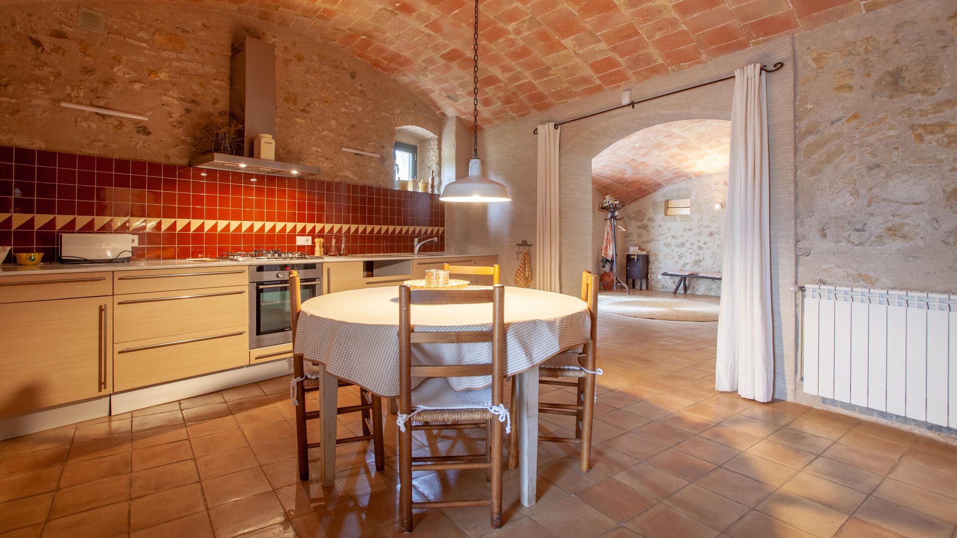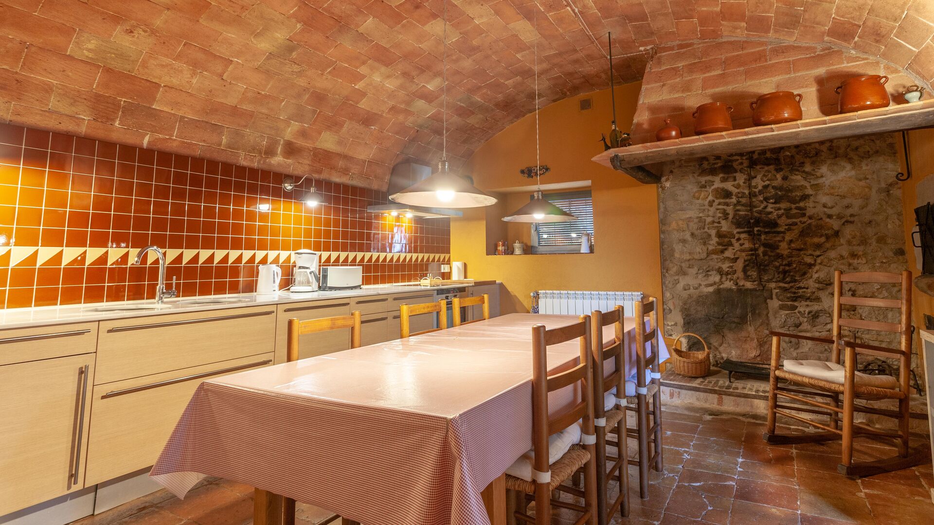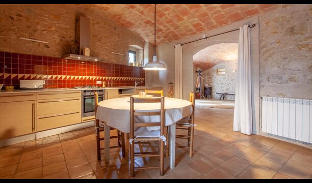 Gran espacio abierto de salón y comedor que conecta todas las estancias de esta planta. La cocina original de la masía ha sido renovada y totalmente equipada y se abre a una terraza cubierta con hermosas vistas a toda la propiedad.