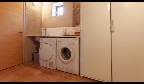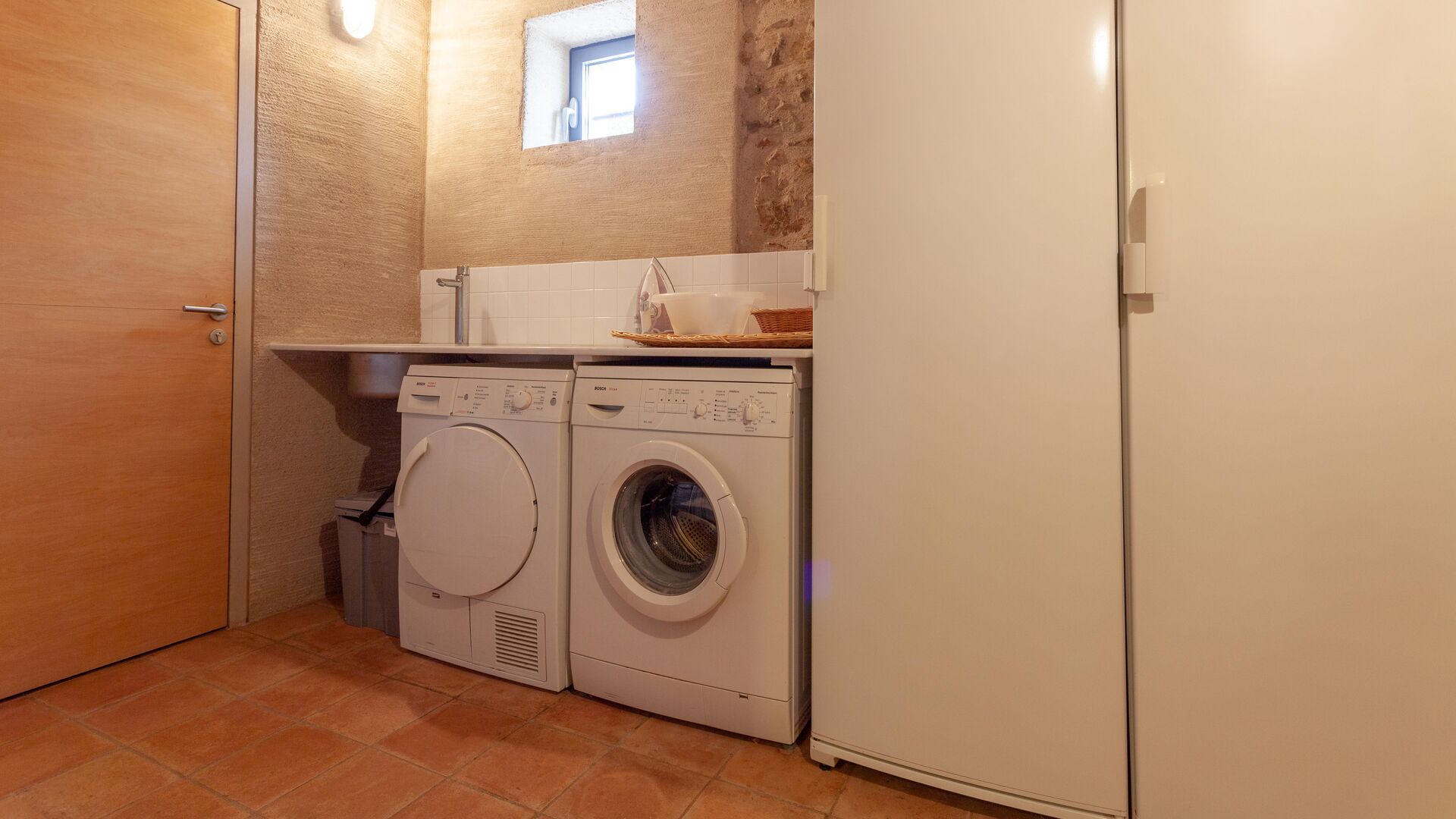 Recibidor con bóveda catalana, amplio salón con chimenea y acceso a una terraza cubierta, cocina independiente totalmente equipada con acceso a la terraza, aseo de cortesía, cuarto de lavandería con lavadora, secadora y tendedero, y una sala polivalente o de juegos con acceso a un porche exterior amueblado.