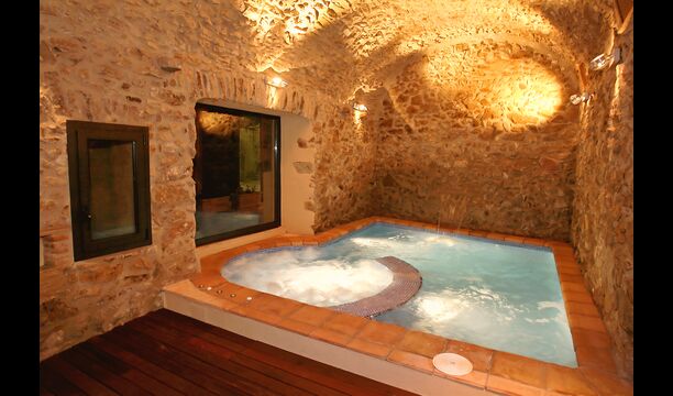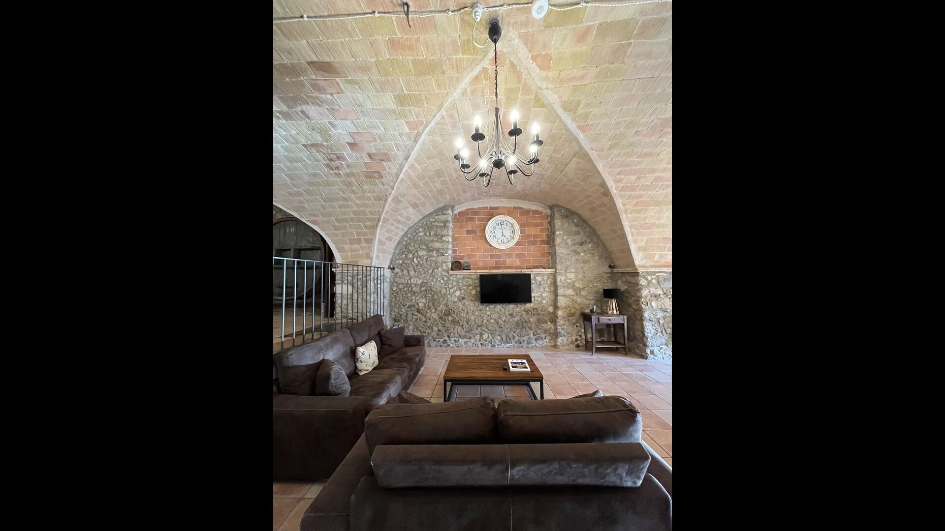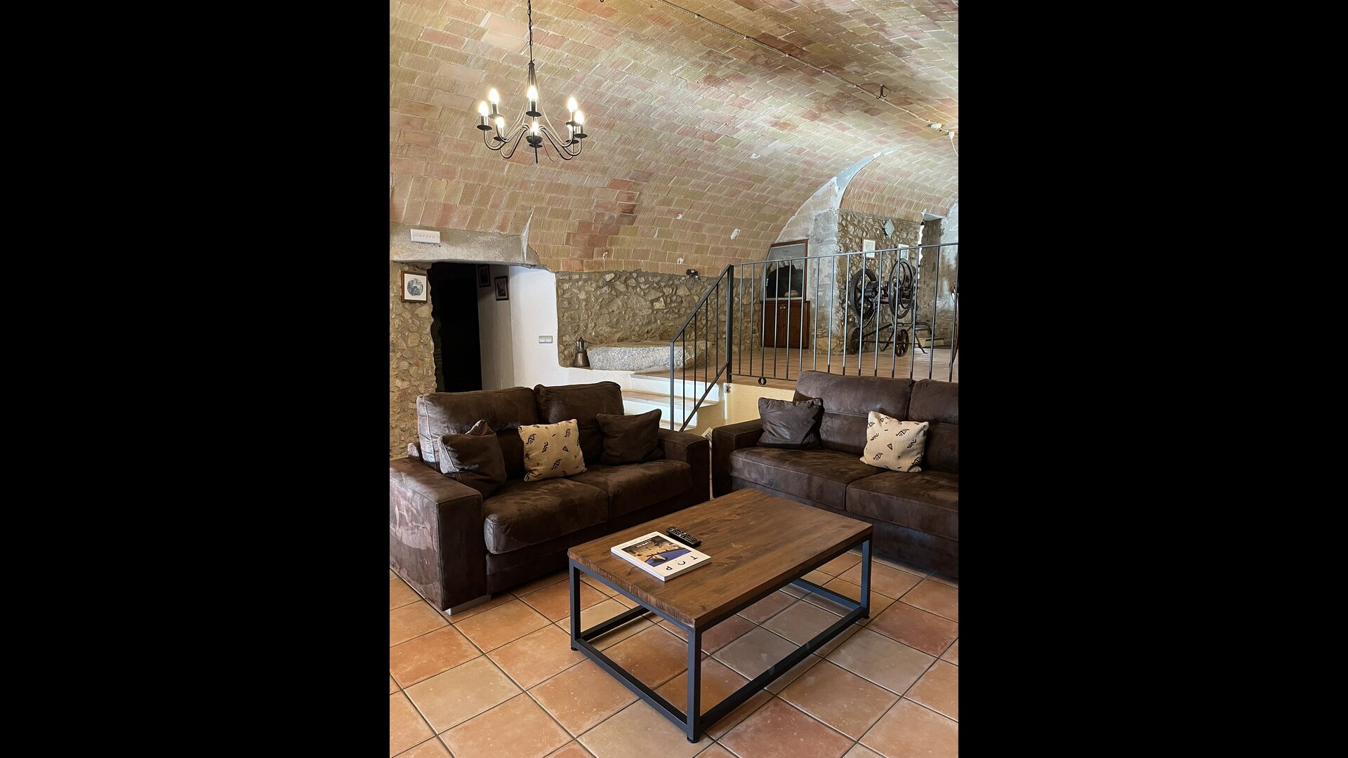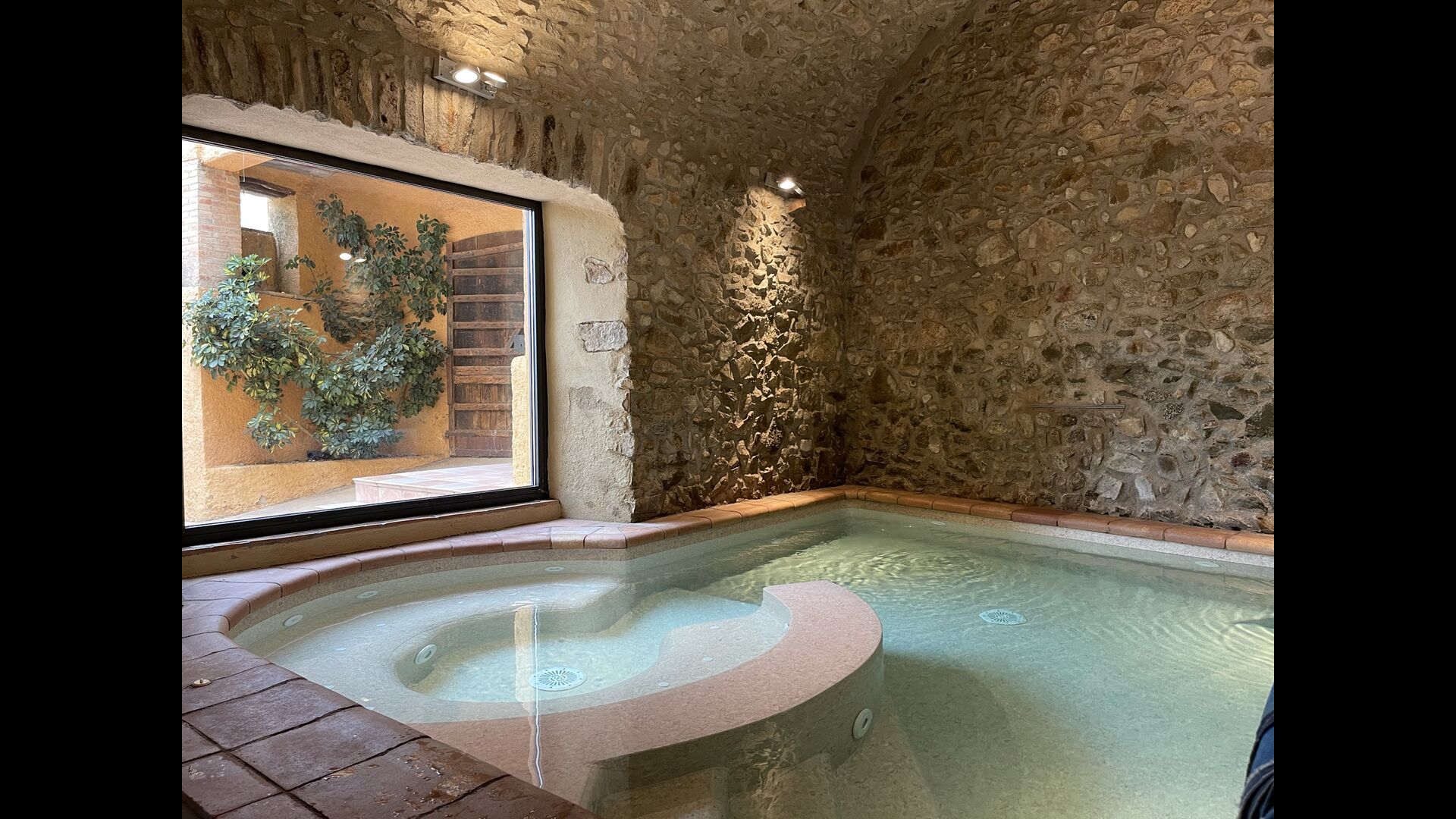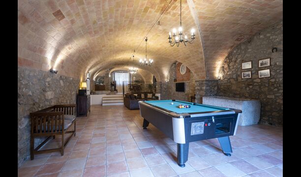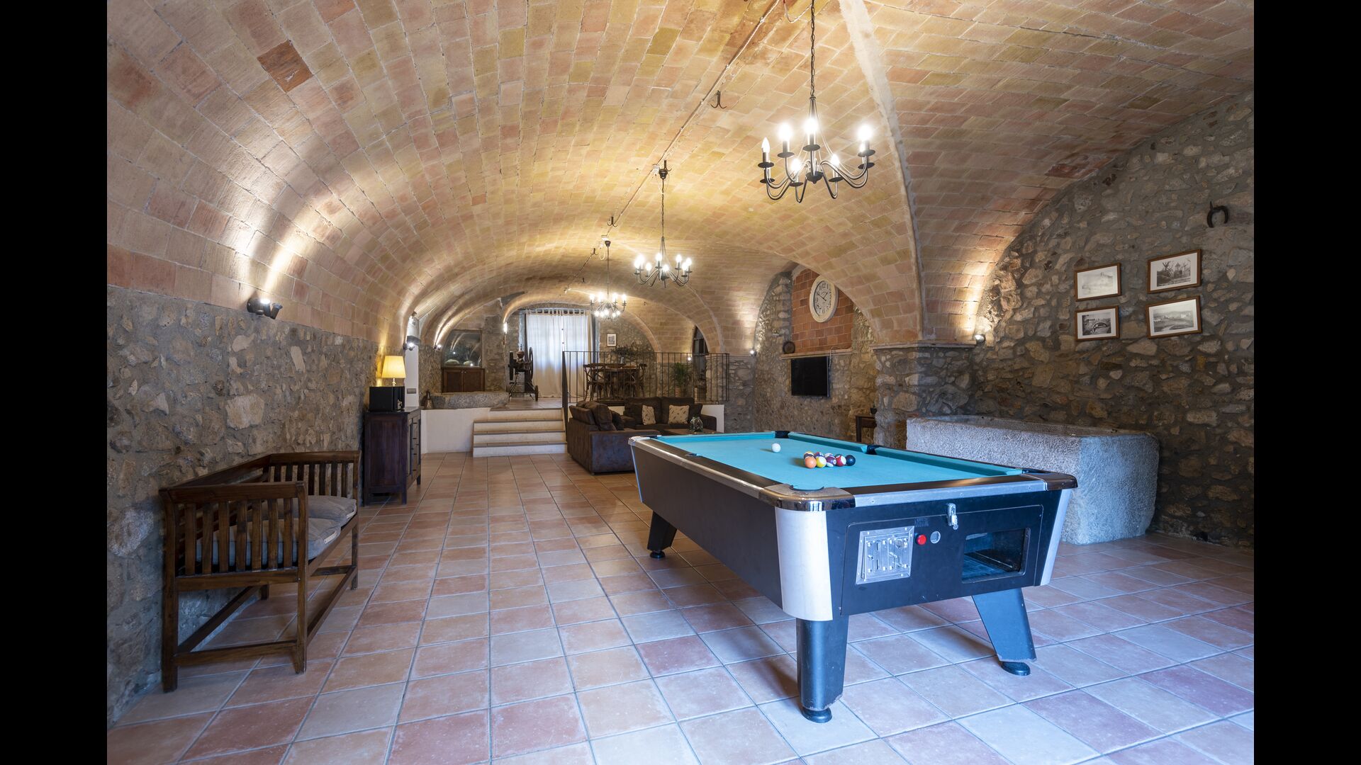 En la planta baja, puedes disfrutar de amplias áreas comunes con techos abovedados catalanes y paredes de piedra. Las comodidades incluyen una gran sala de estar con zona de TV, sistema de sonido estéreo y mesa de billar. En la parte trasera, hay acceso a un jardín vallado con zona de barbacoa, una piscina exterior de agua salada, una mesa de ping-pong y una zona de juegos para niños. Además, hay una piscina climatizada cubierta con jacuzzi disponible para relajarse.