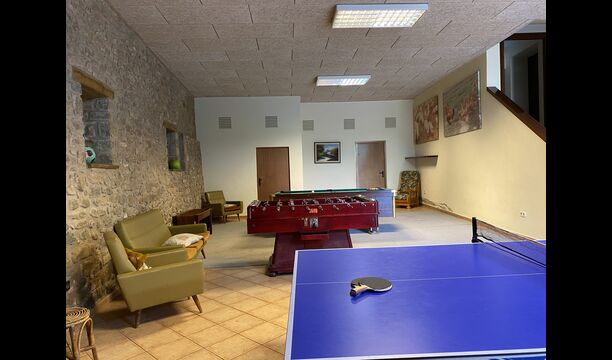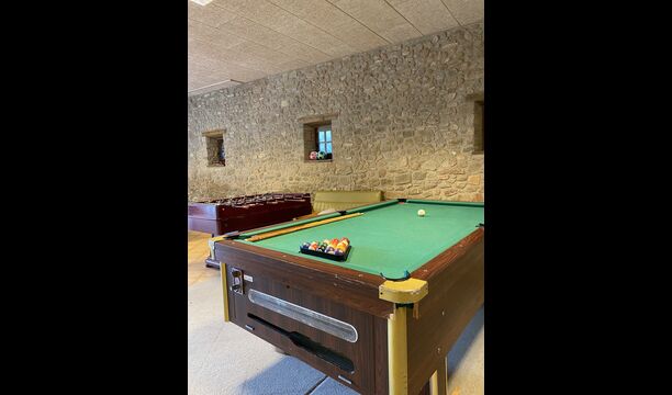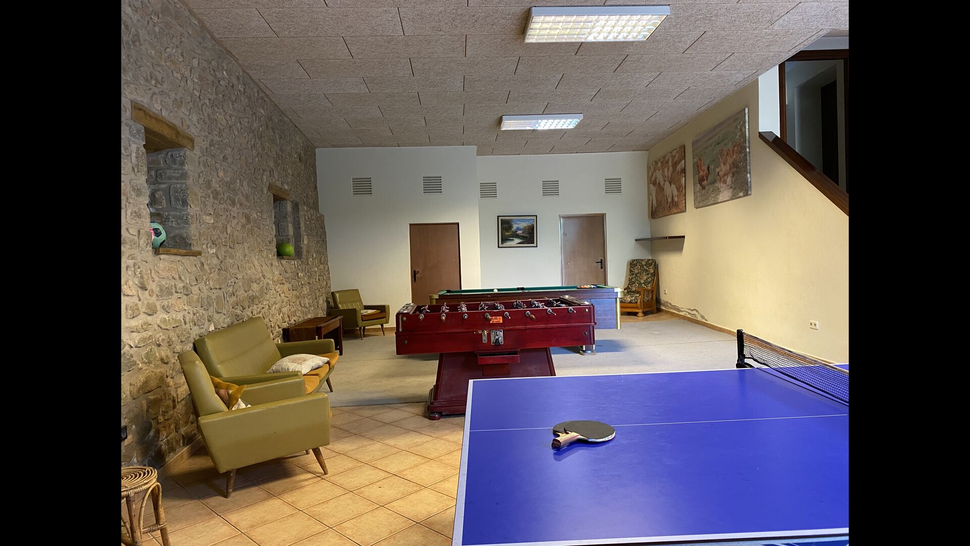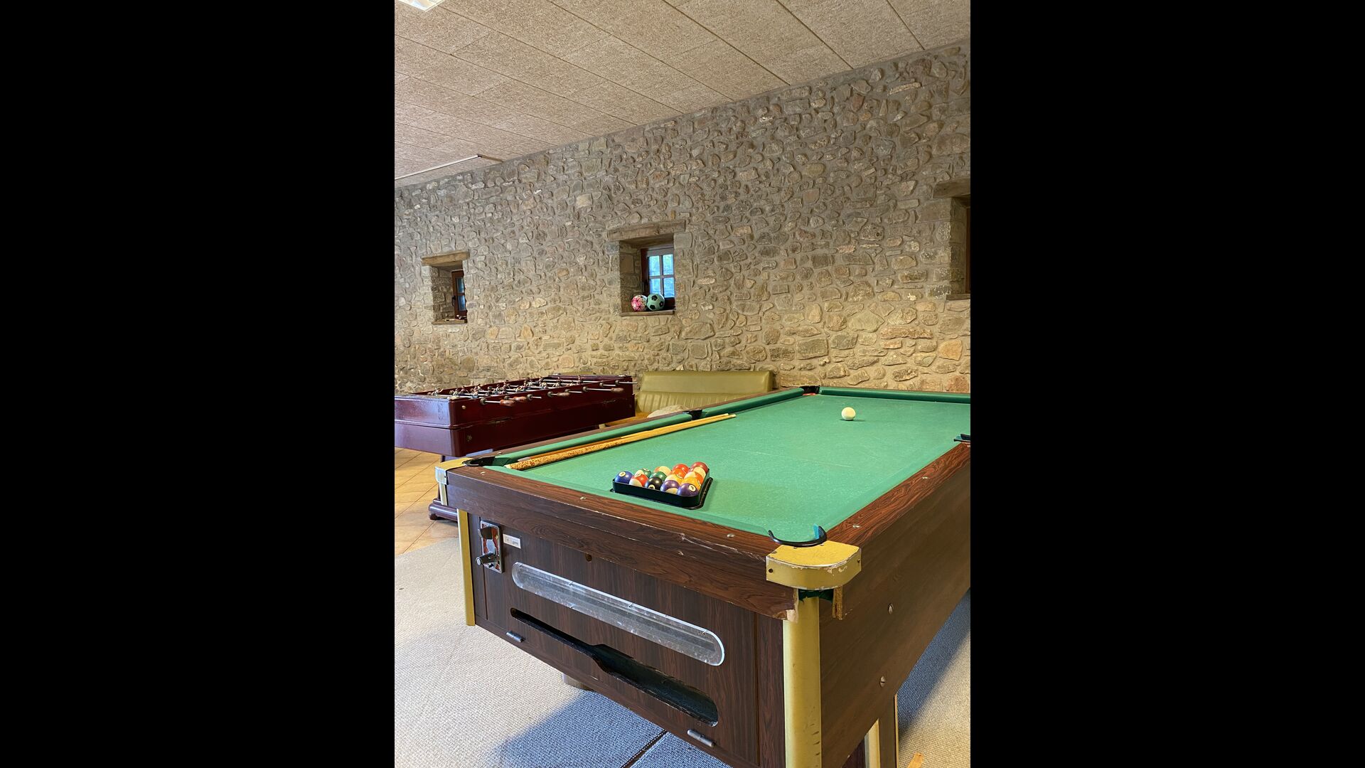 En la planta baja, hay una sala de actividades con ping-pong, billar y futbolín y una sala de depósito con 3 lavadoras y 3 cunas y una silla alta, que se puede configurar si es necesario.