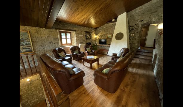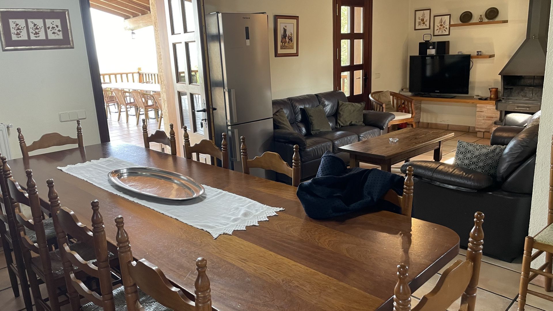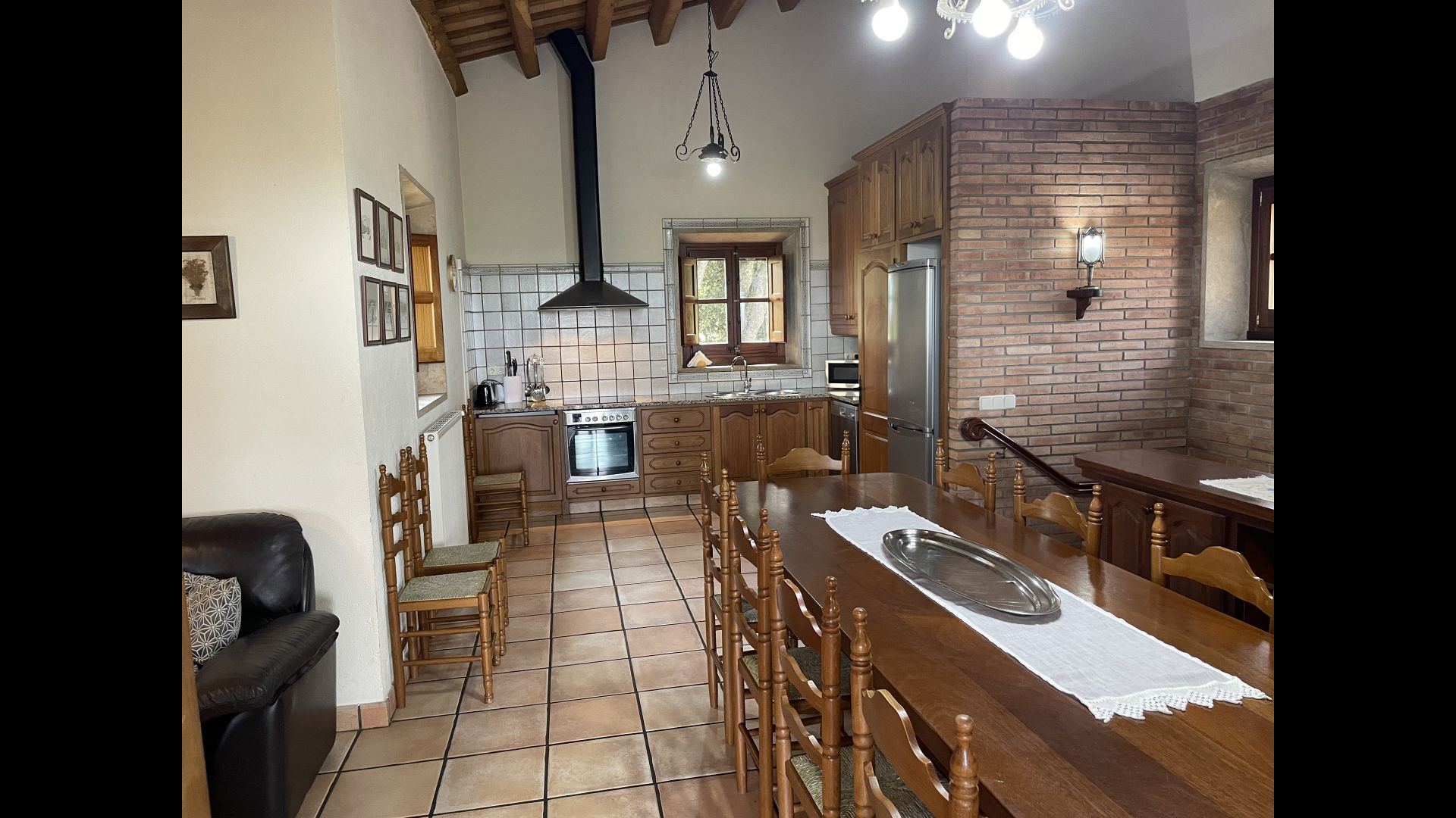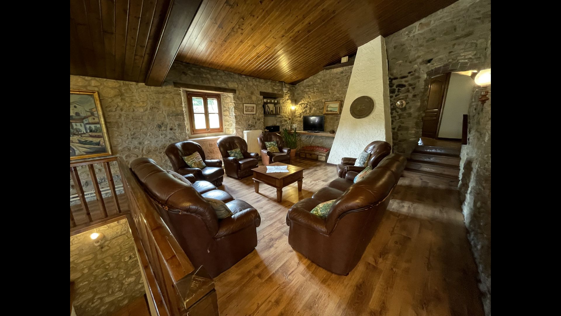Usted tiene acceso al edificio Masover directamente desde la terraza a una gran sala común con comedor con una gran mesa de comedor, cocina abierta con fogones, horno, microondas, lavavajillas, nevera y congelador. Luego hay una sala de estar con TV y chimenea, y hay un baño para usar arriba y desde la terraza.