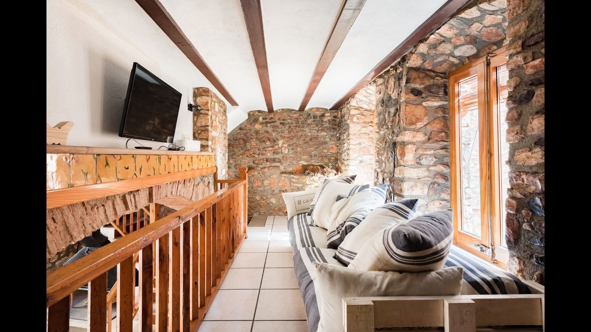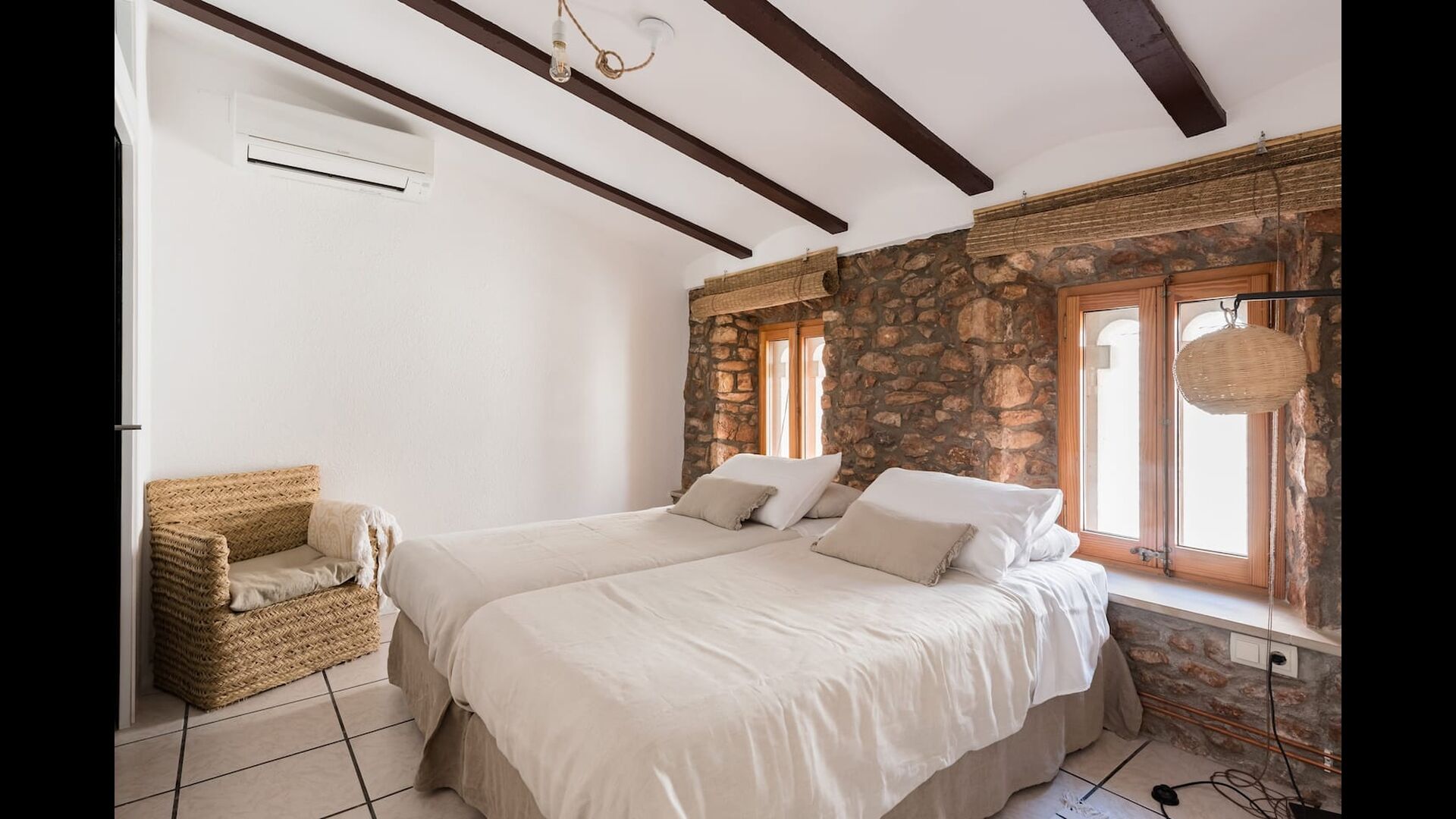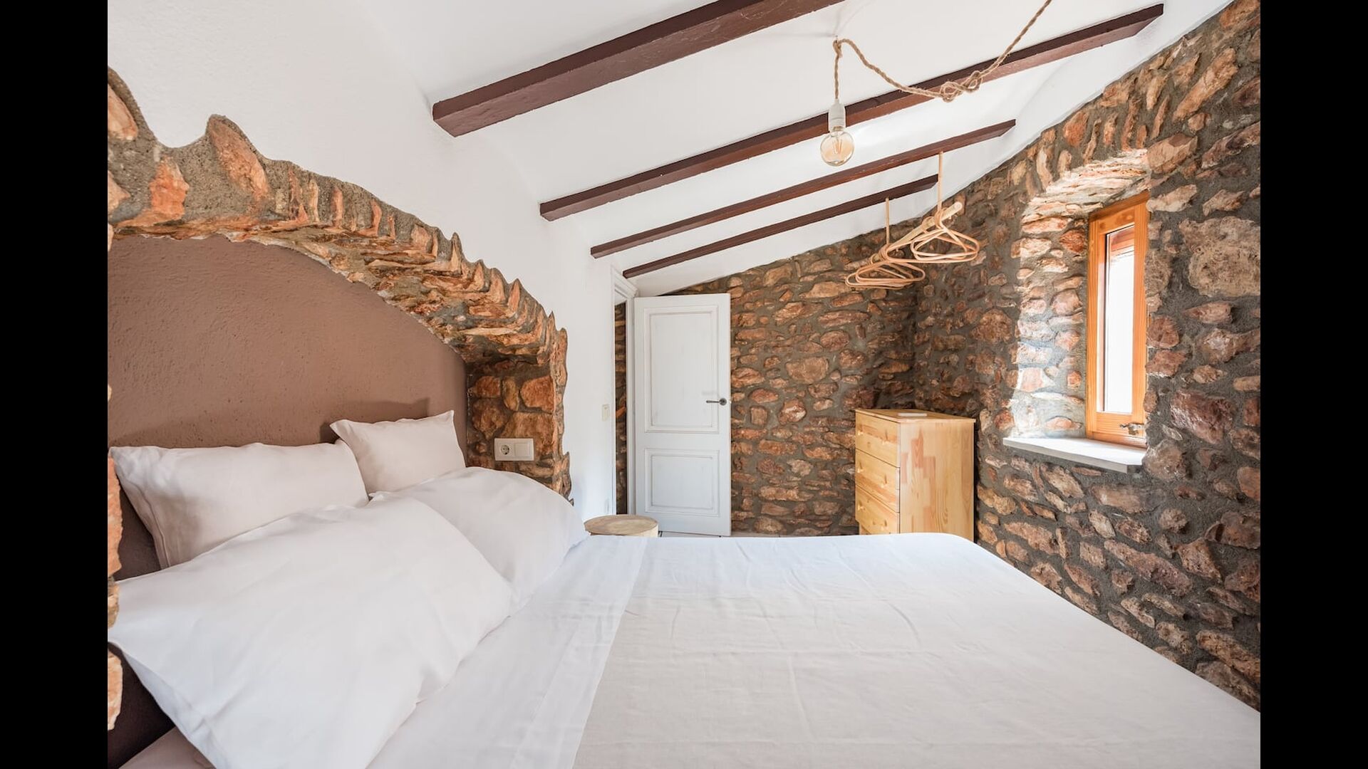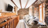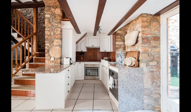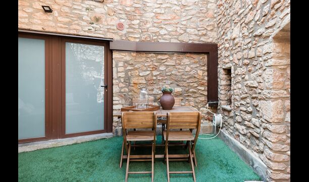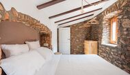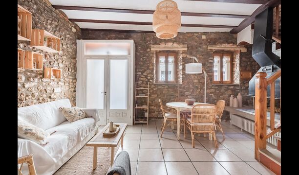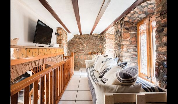 Las paredes del apartamento están construidas íntegramente con piedra. En la planta baja se encuentra el salón comedor con cocina abierta. Desde la planta baja, hay puertas que dan al patio del apartamento. También encontrarás un pequeño lavabo y un entrepiso acondicionado como sala de televisión. Arriba, en la planta superior, hay dos dormitorios dobles; uno con cama doble, y otro con 1 litera. Ambas habitaciones poseen su propio baño. A menos de 100 metros del apartamento hay una zona de aparcamiento para tu coche.