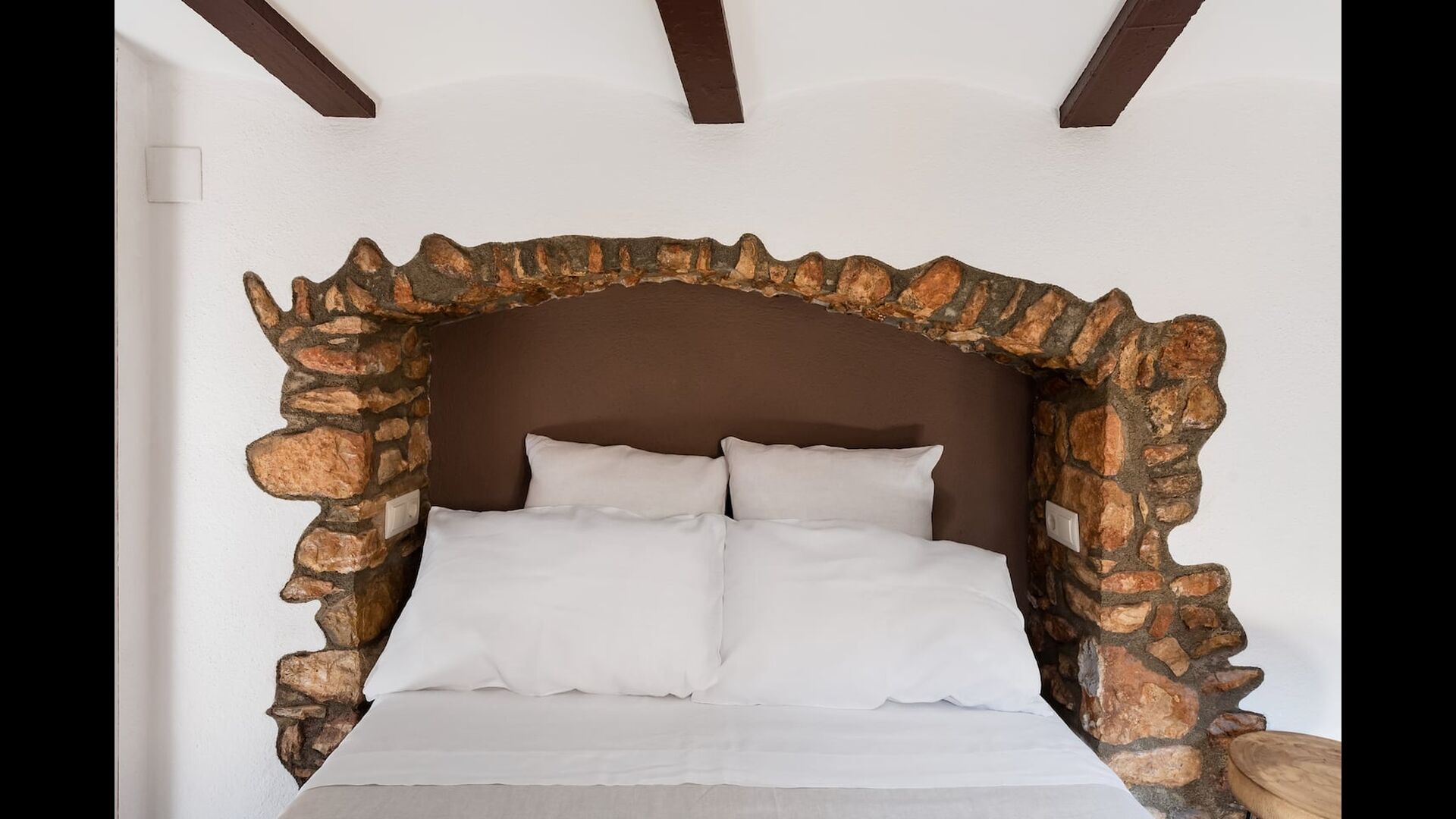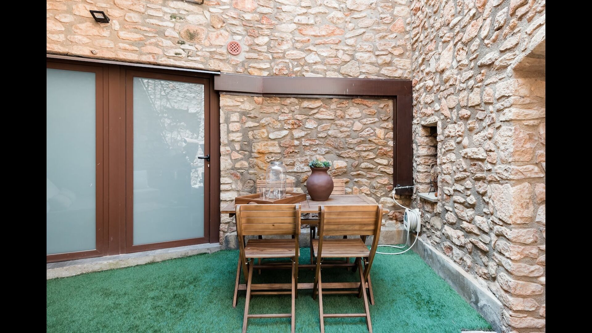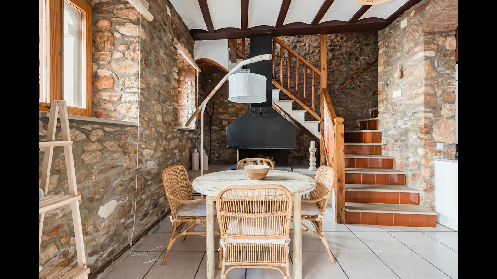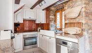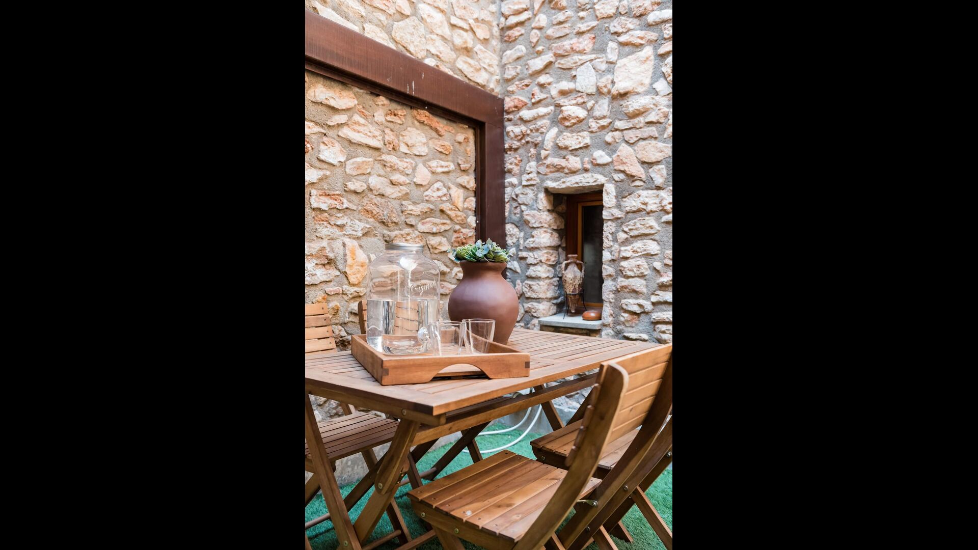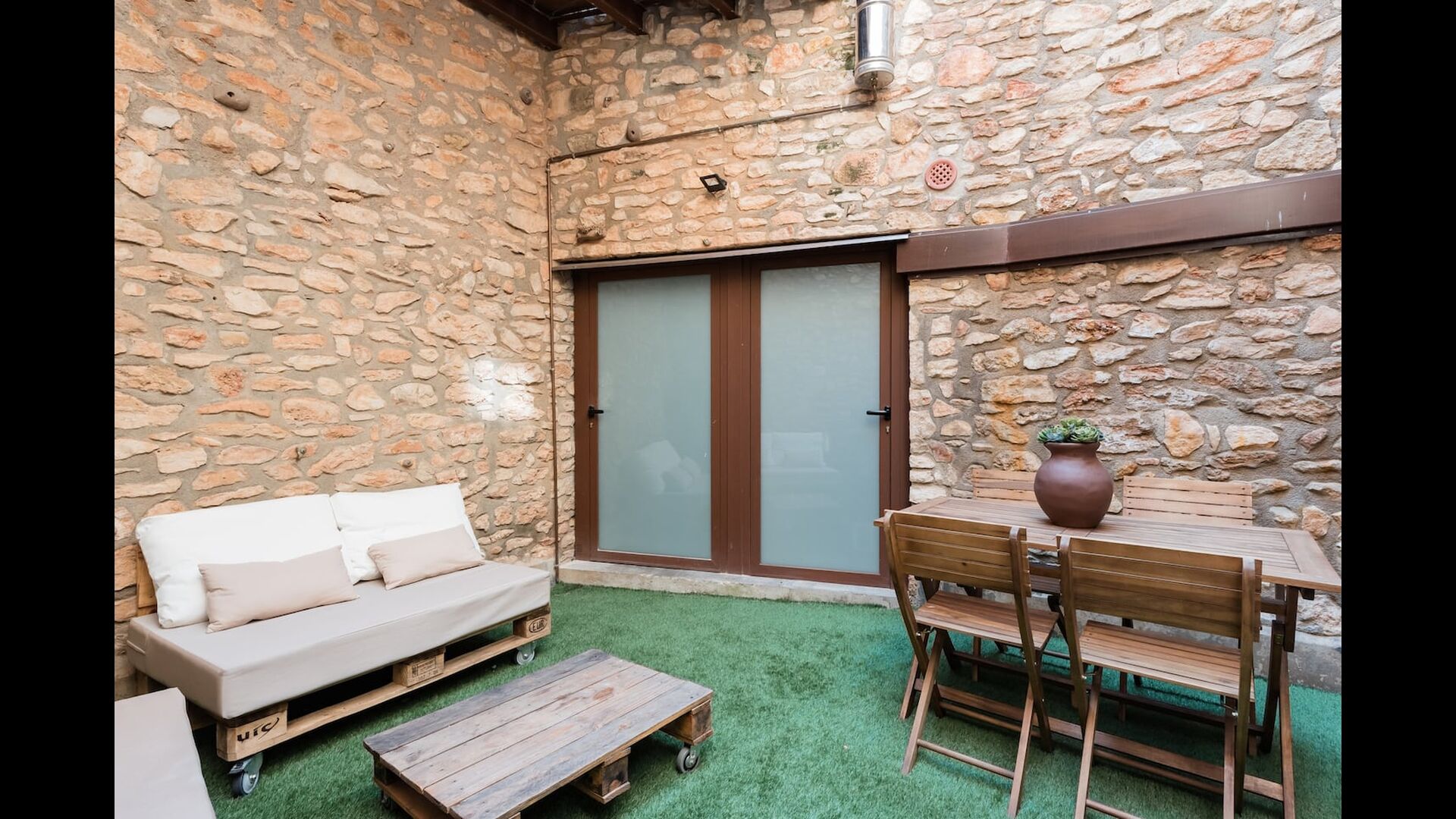 Las paredes del apartamento están construidas íntegramente con piedra. En la planta baja se encuentra el salón comedor con cocina abierta. Desde la planta baja, hay puertas que dan al patio del apartamento. También encontrarás un pequeño lavabo y un entrepiso acondicionado como sala de televisión. Arriba, en la planta superior, hay dos dormitorios dobles; uno con cama doble, y otro con 1 litera. Ambas habitaciones poseen su propio baño. A menos de 100 metros del apartamento hay una zona de aparcamiento para tu coche.