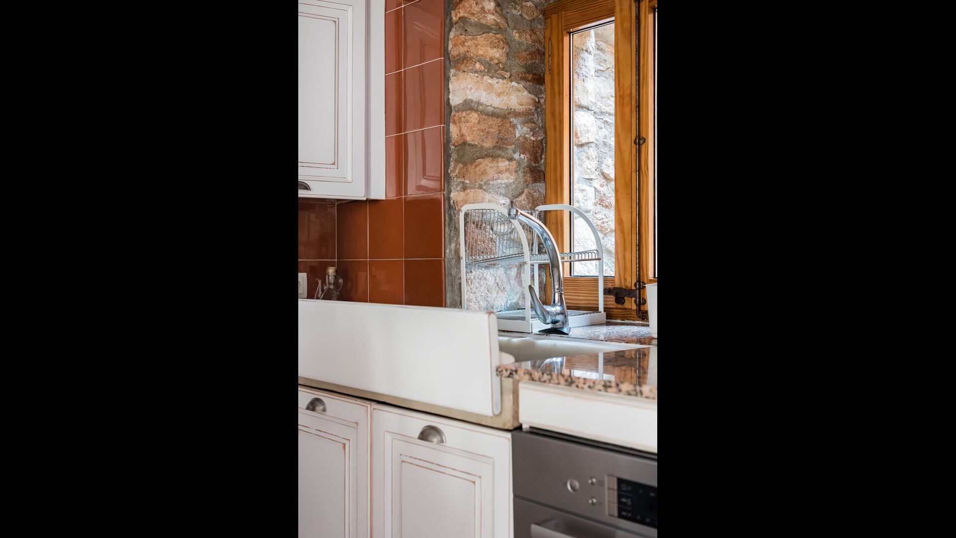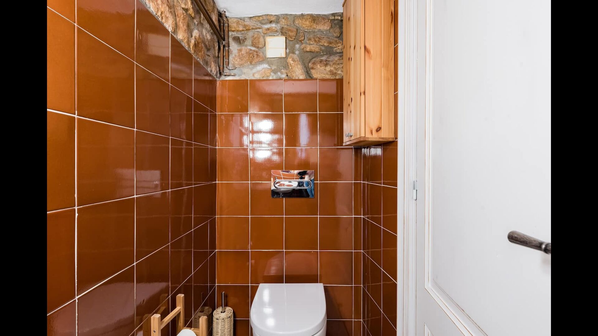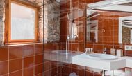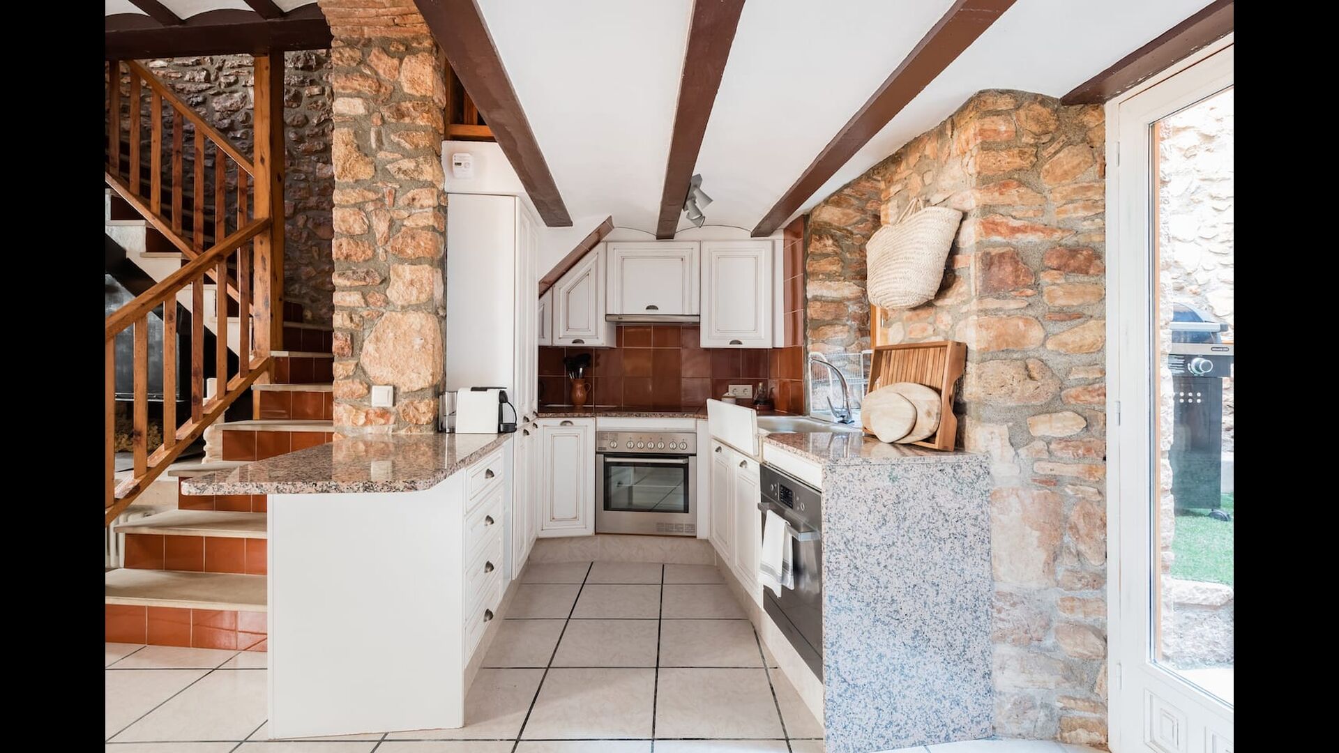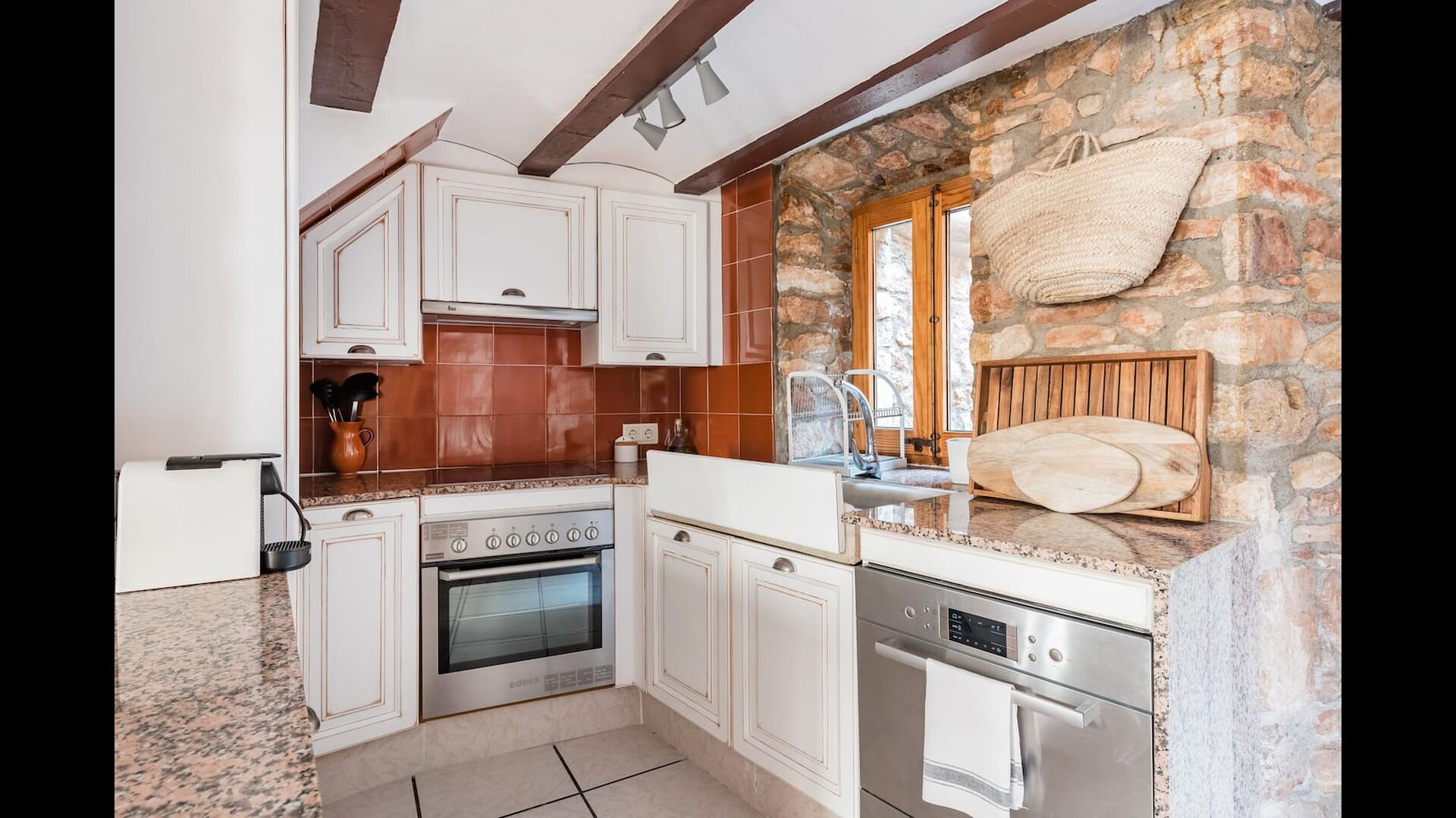 Las paredes del apartamento están construidas íntegramente con piedra. En la planta baja se encuentra el salón comedor con cocina abierta. Desde la planta baja, hay puertas que dan al patio del apartamento. También encontrarás un pequeño lavabo y un entrepiso acondicionado como sala de televisión. Arriba, en la planta superior, hay dos dormitorios dobles; uno con cama doble, y otro con 1 litera. Ambas habitaciones poseen su propio baño. A menos de 100 metros del apartamento hay una zona de aparcamiento para tu coche.