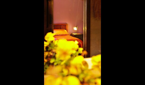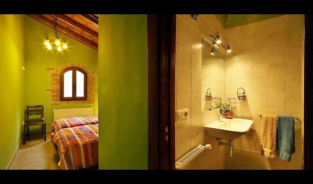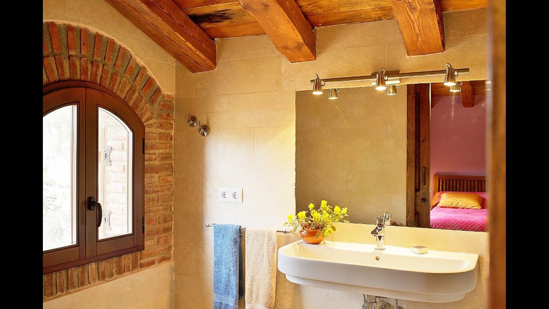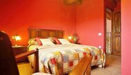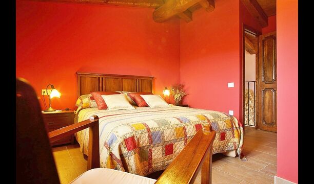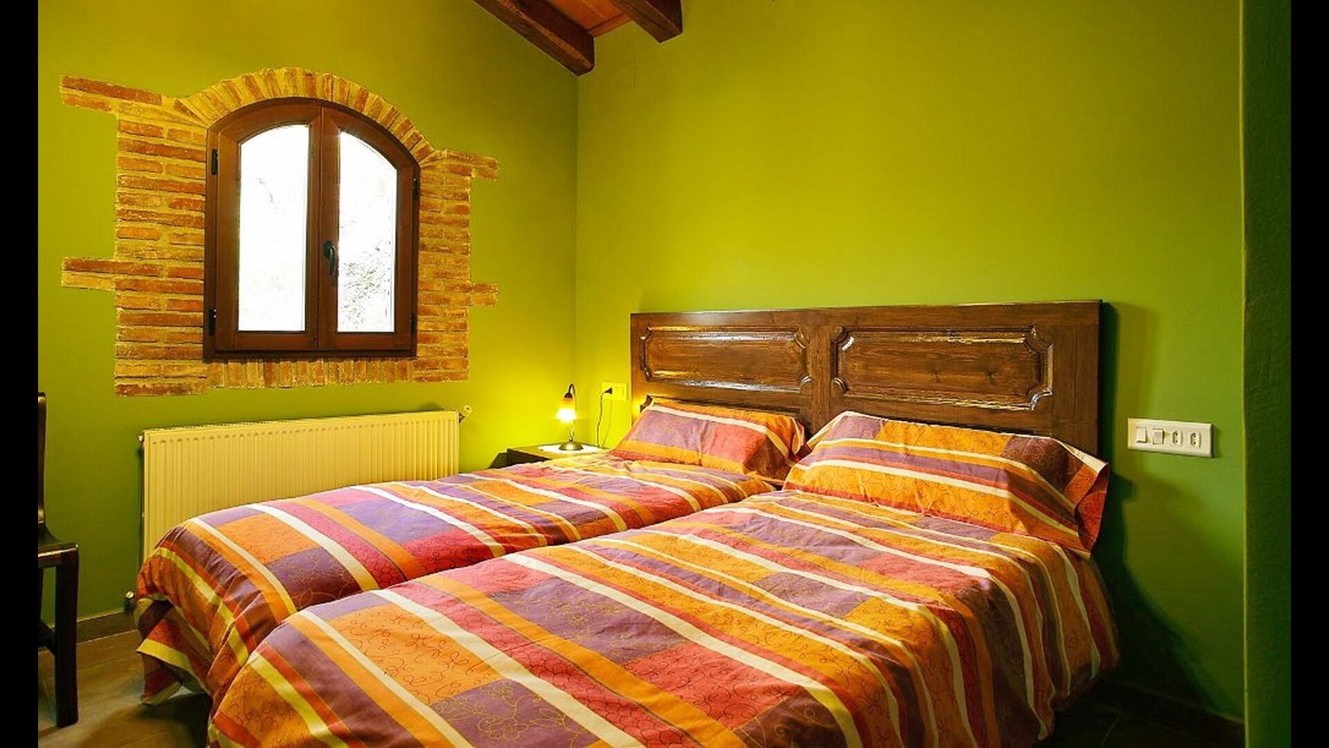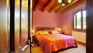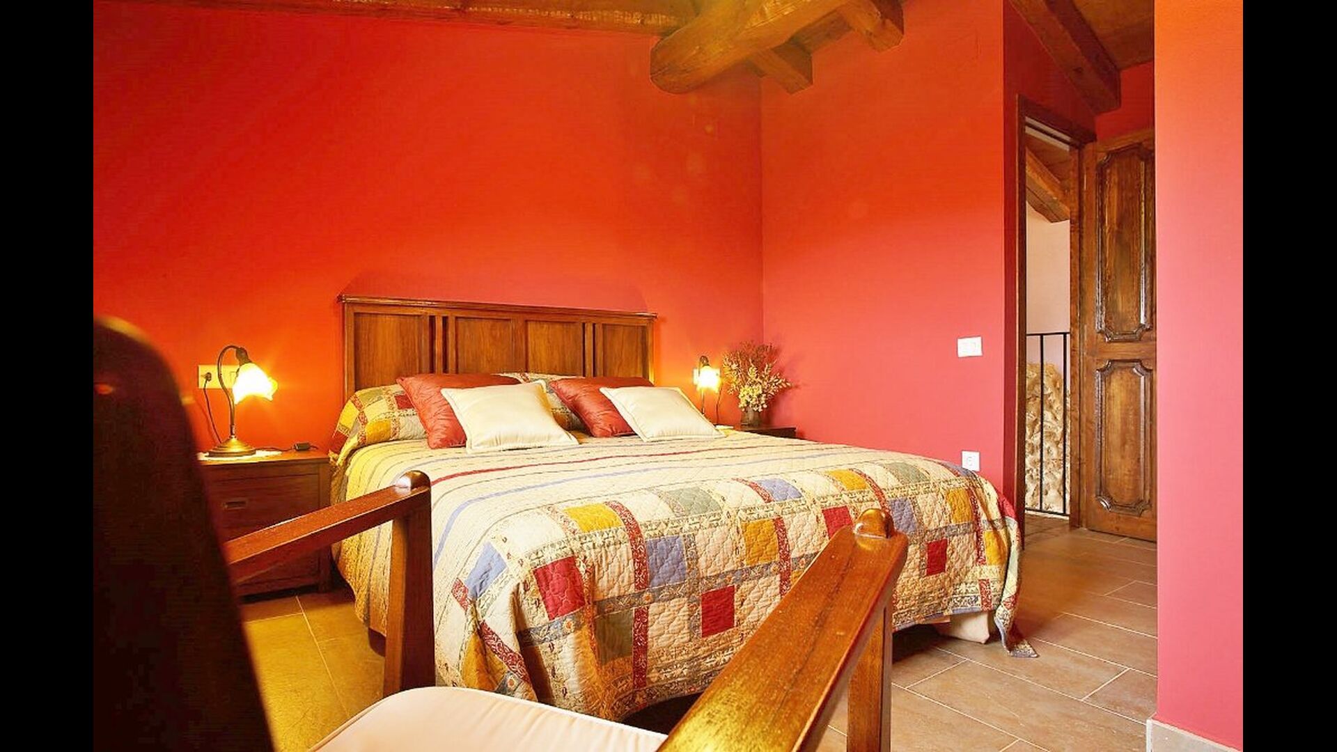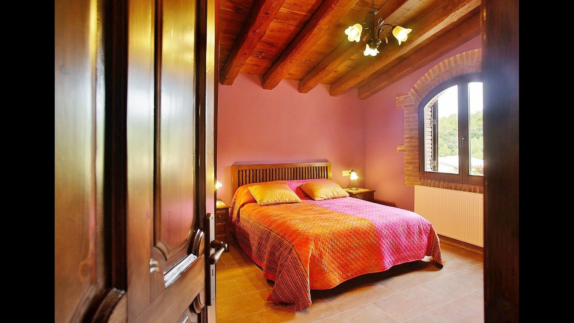 Dormitorio 1: Amplia habitación con vistas a la montaña del Morral y jardín, con baño privado y cama supletoria, techos decorados con antiguas cubas de vino de roble.