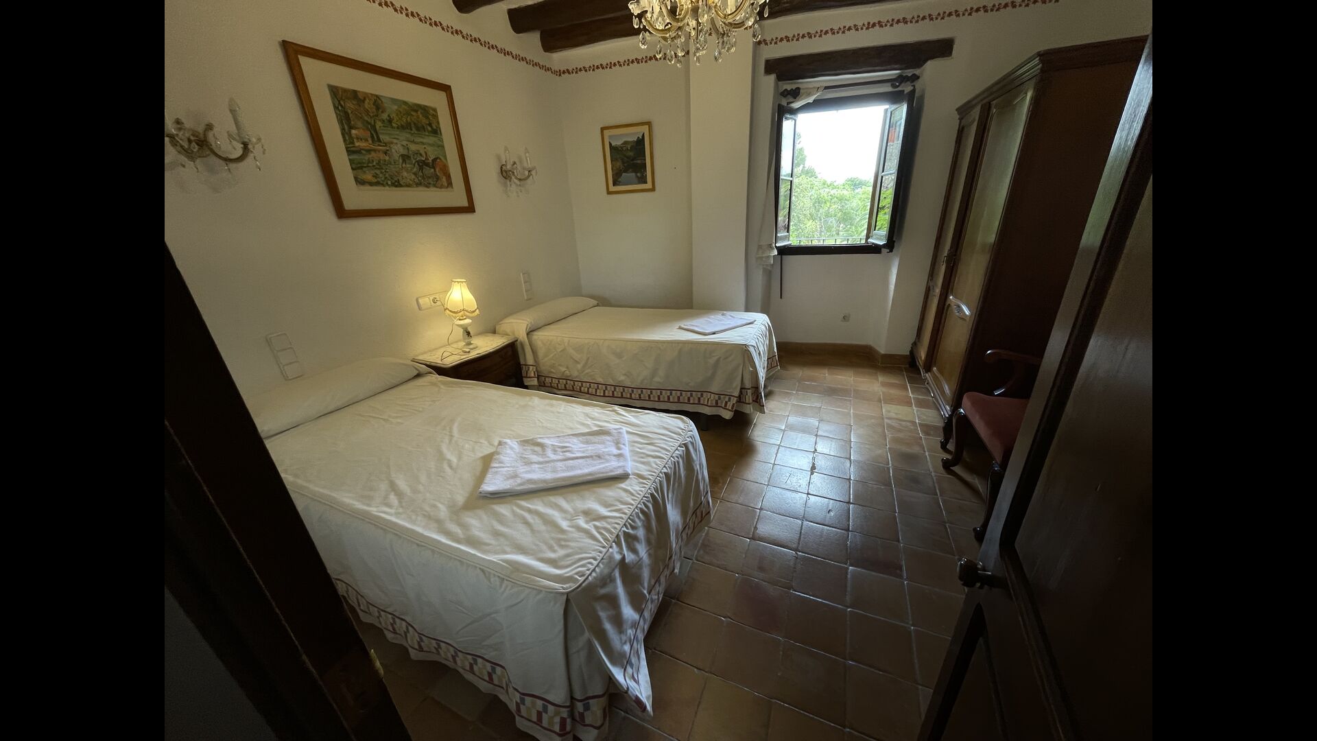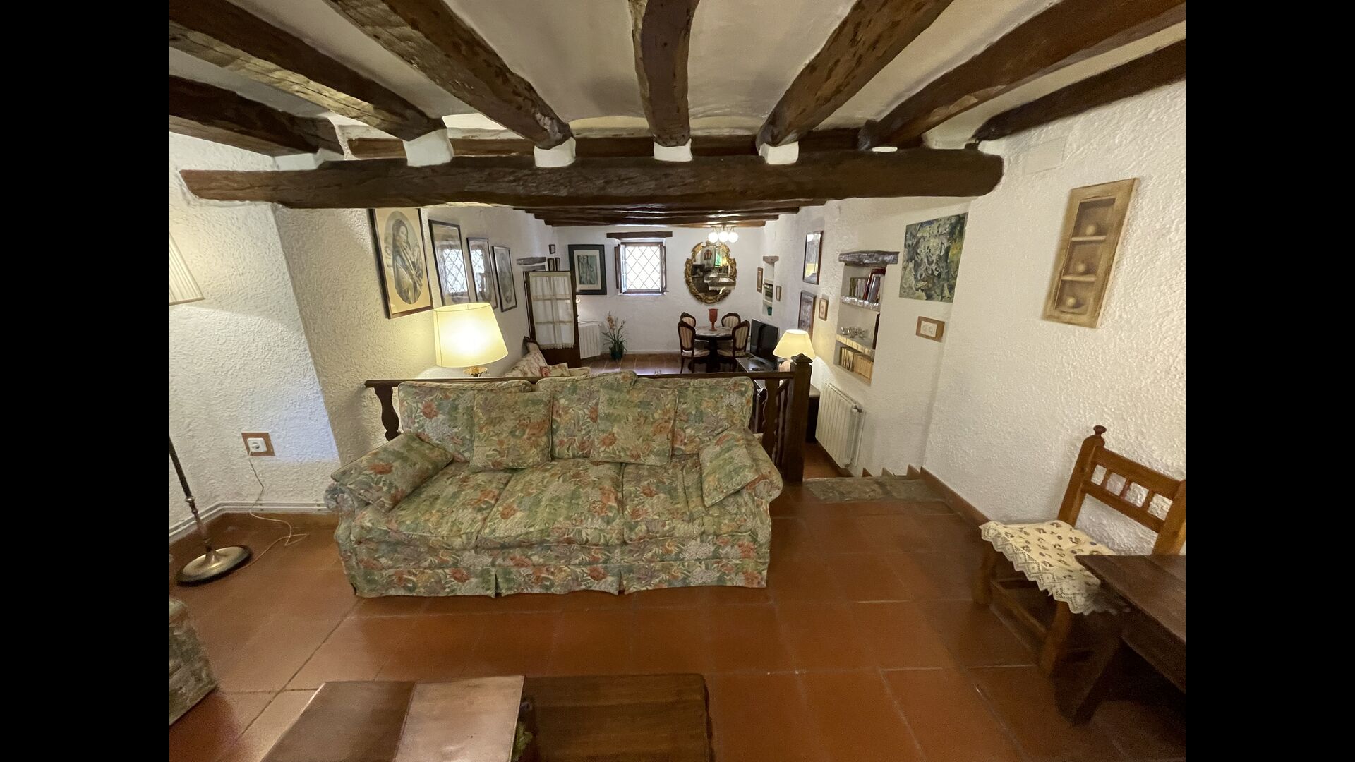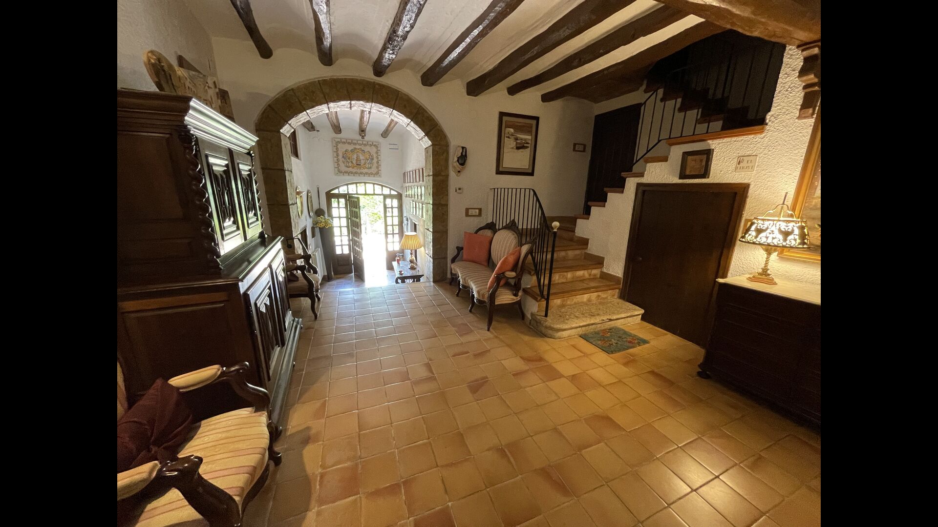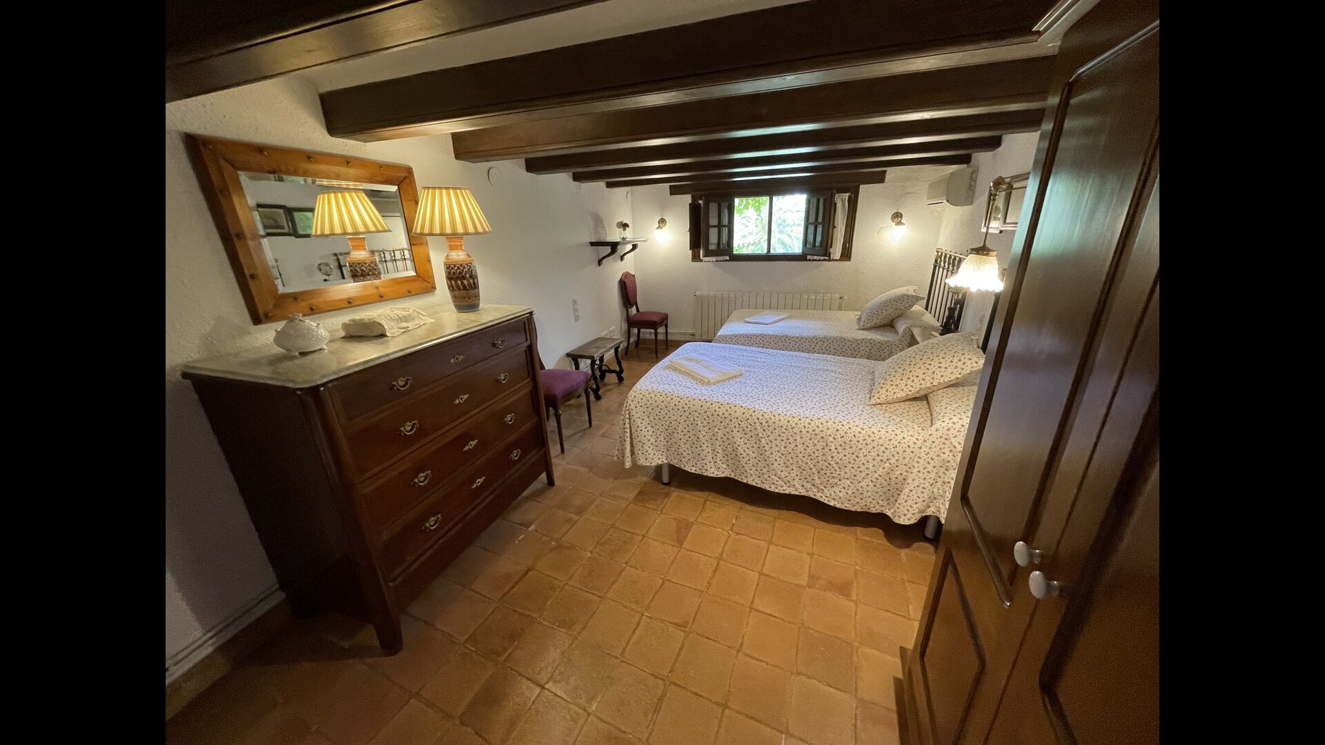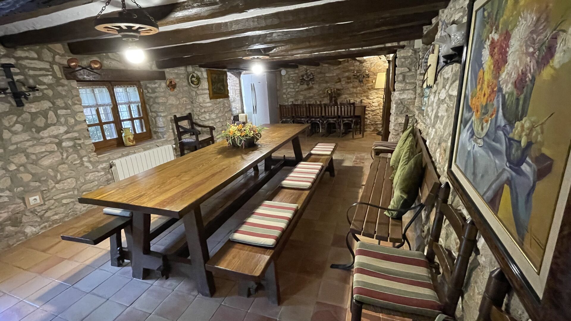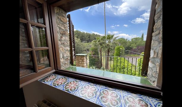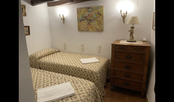 Can Joan tiene cuatro niveles y además la bodega. Para grupos grandes, la planta baja de esta casa es perfecta, ya que habrá asientos para un grupo grande alrededor de la gran mesa de comedor, y una cocina totalmente equipada conectada directamente. Alternativamente, puede comer al aire libre en la terraza, o si prefiere un lugar refrescante para su almuerzo, la bodega, que también ha sido equipada con una mesa de comedor muy grande, está situada en los pisos superiores. Cuatro escalones más arriba, hay un pasillo de conexión con 3 dormitorios, una habitación doble con baño privado, otra habitación doble y una habitación con dos camas individuales que comparten un baño. En el primer piso, hay 5 dormitorios más. Hay un pasillo con sofás y acceso a los dormitorios. Una habitación doble y una habitación con dos camas individuales comparten un baño, y otras 3 habitaciones dobles comparten otro baño.