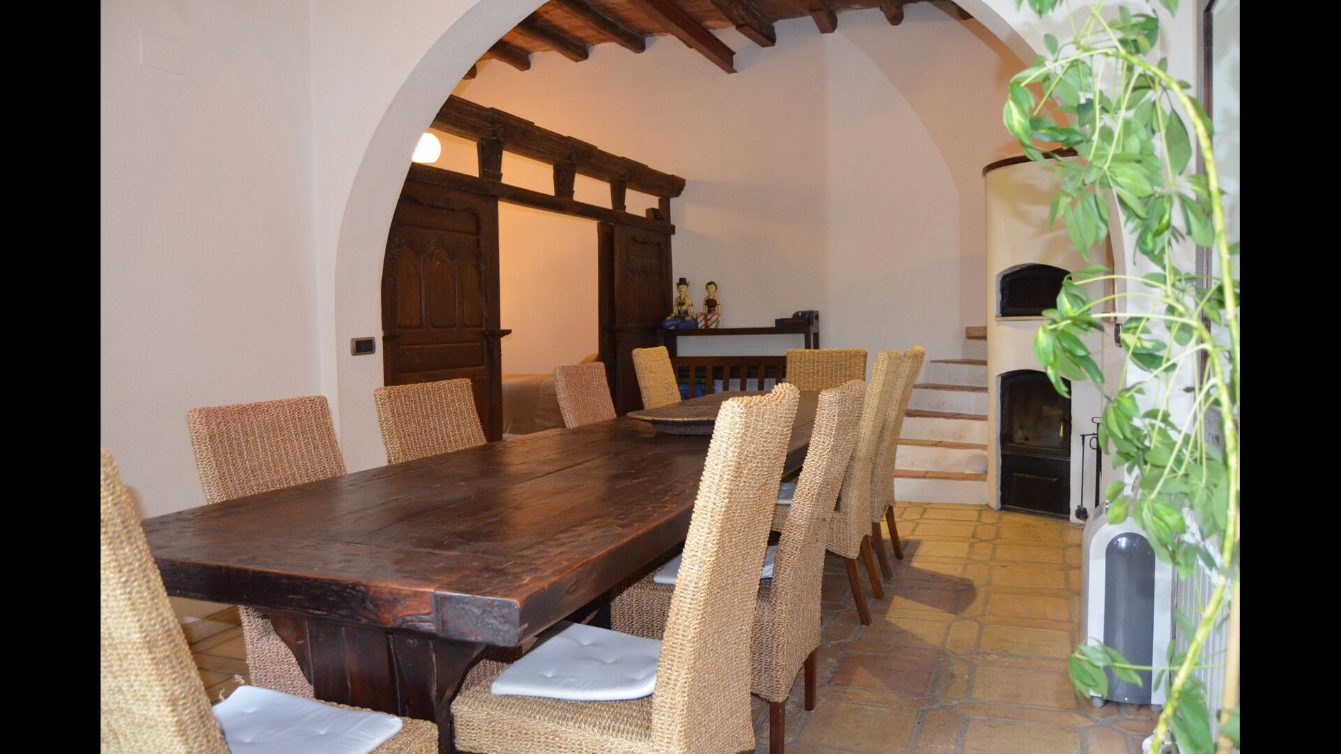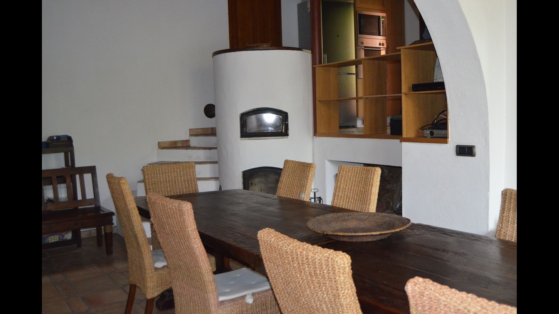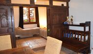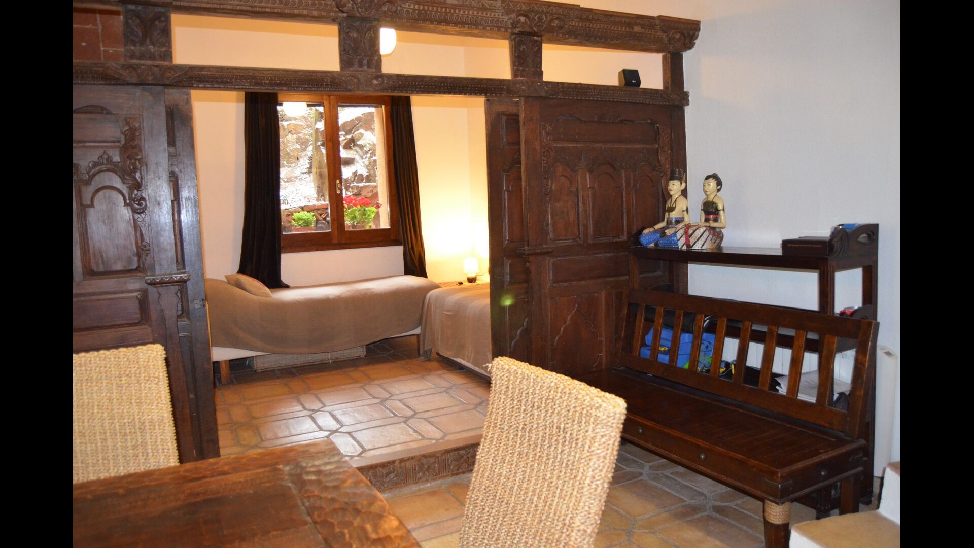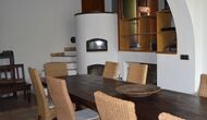 La planta baja tiene 2 habitaciones dobles, un baño y un gran comedor o sala de reuniones con espacio para 15 personas, una estufa de mampostería y una cocina abierta con acceso al jardín. Esta sala cuenta con un proyector y equipo de homecinema. Una de las habitaciones tiene una inspiración oriental y se cierra con una puerta corredera de madera original, bellamente tallada en Indonesia.