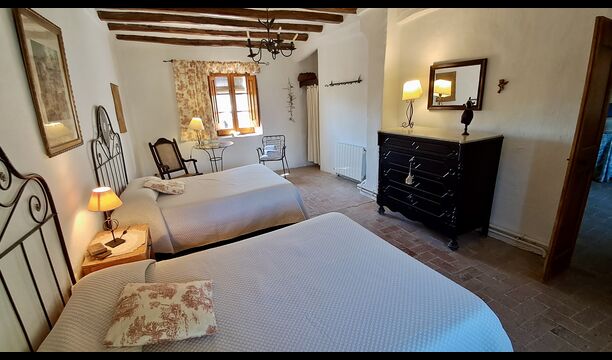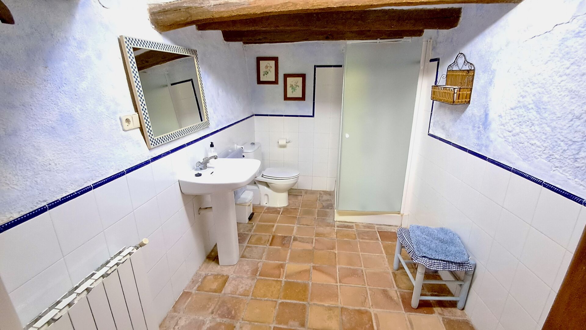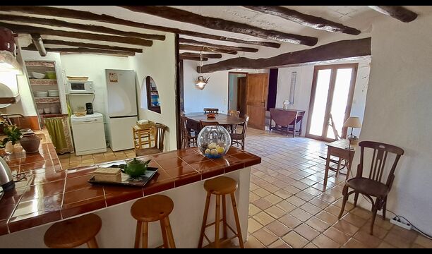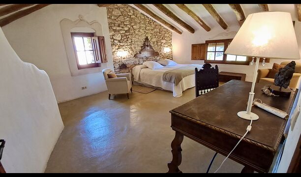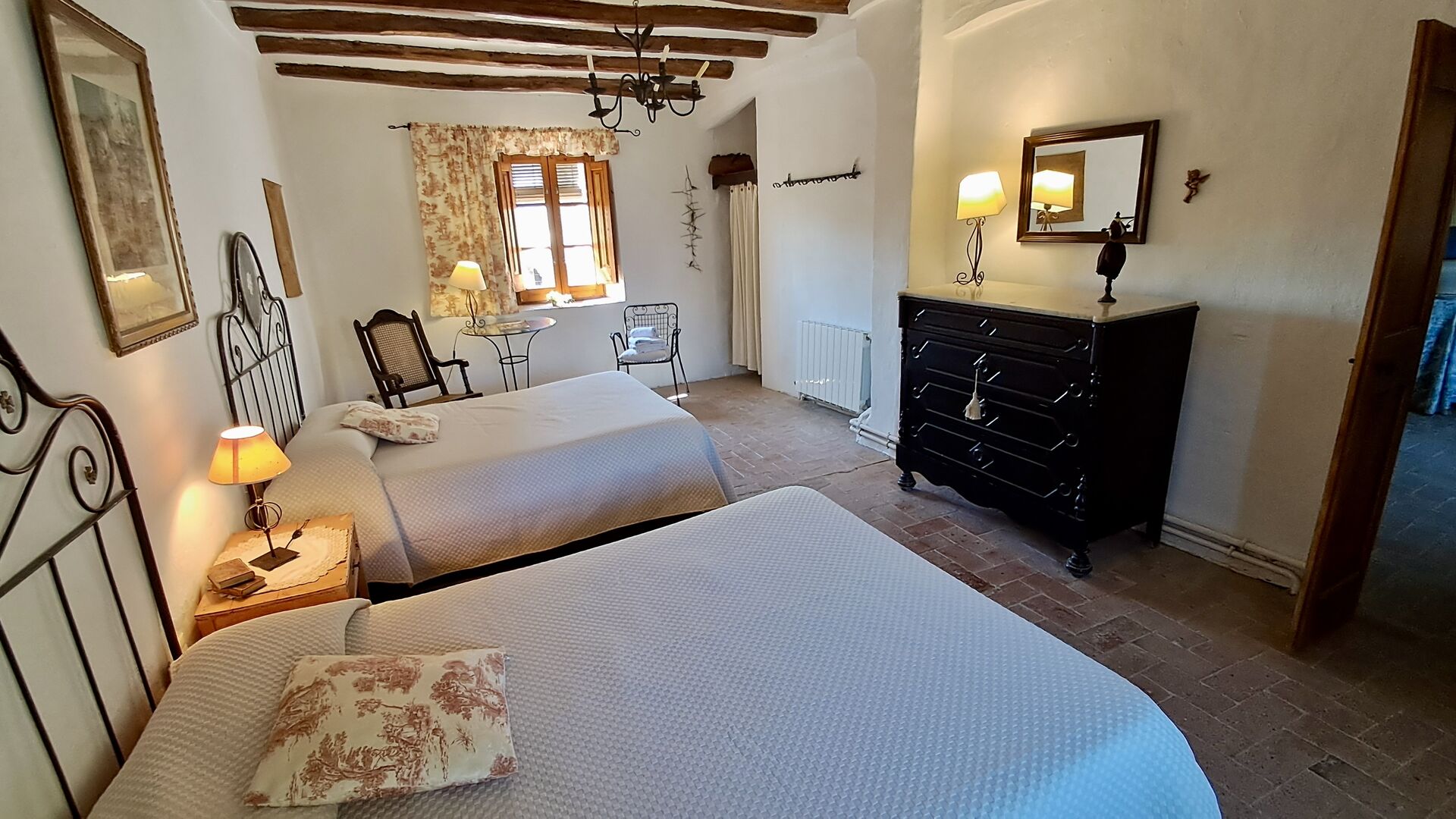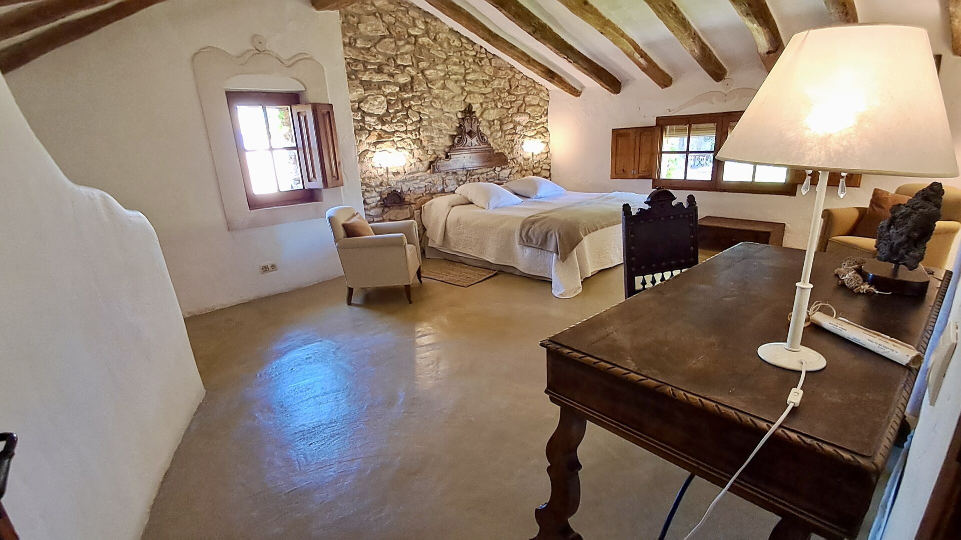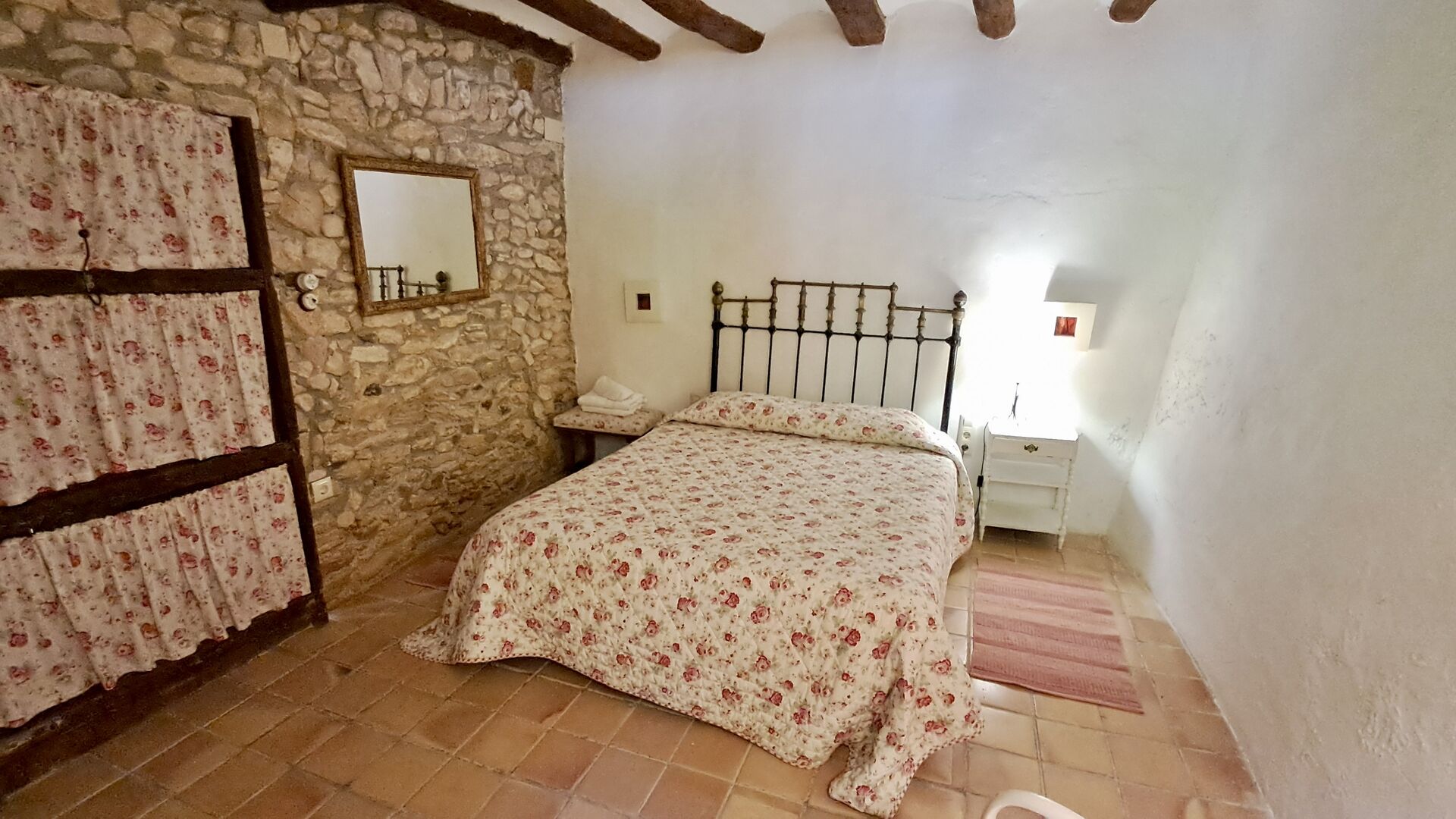 En el primer piso, se encuentra la cocina y el comedor abierto con acceso a una espaciosa terraza en el primer piso con excelente vista y una barbacoa. Aquí, todos pueden comer afuera, disfrutando de las cálidas noches catalanas. Además, hay 3 habitaciones grandes y muy espaciosas. Todos tienen un diseño diferente, pero todos tienen un alto nivel y un aspecto auténtico. Uno tiene una cama doble, uno tiene dos camas individuales y el tercero tiene dos camas dobles, por lo que es posible dormir 4 personas si es necesario. También en esta planta, hay un baño totalmente equipado. La cocina es como el resto de la casa de alta calidad, y tiene al mismo tiempo muebles rústicos y auténticos.
