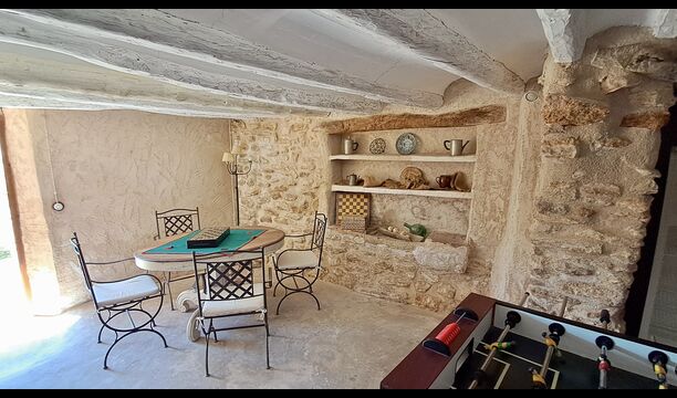 En la parte trasera de la casa, hay un espacio al aire libre, donde puedes disfrutar de la vista desde las sillas del instructor. Además, hay espacio para jugar. Dentro de la casa, en la planta baja, hay una sala de juegos con futbolín. Además, en la planta baja, hay un dormitorio y un baño.