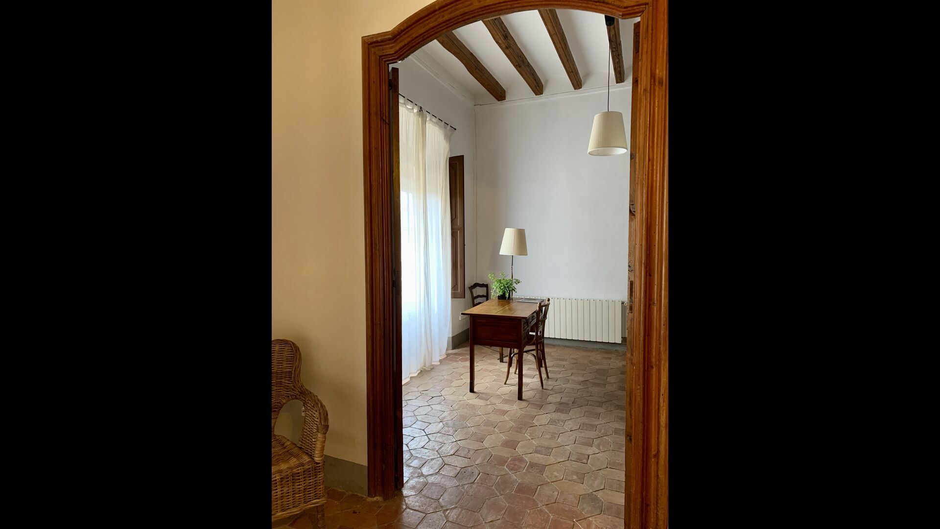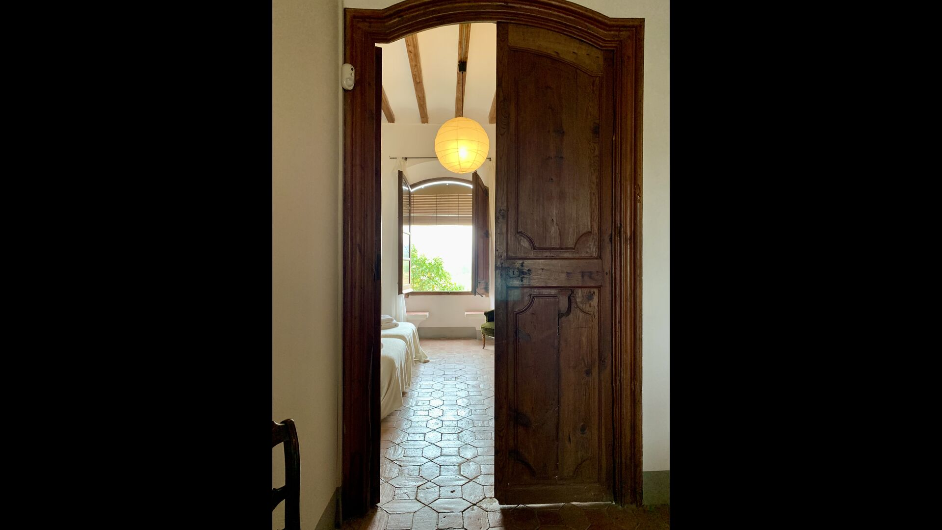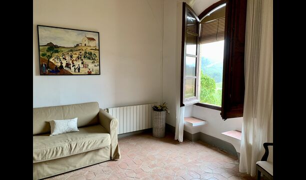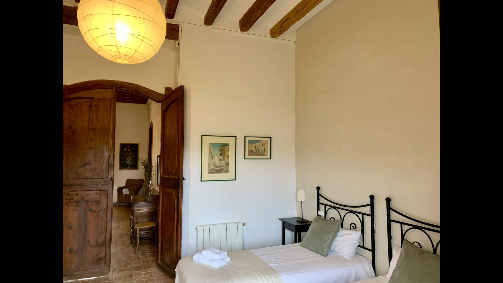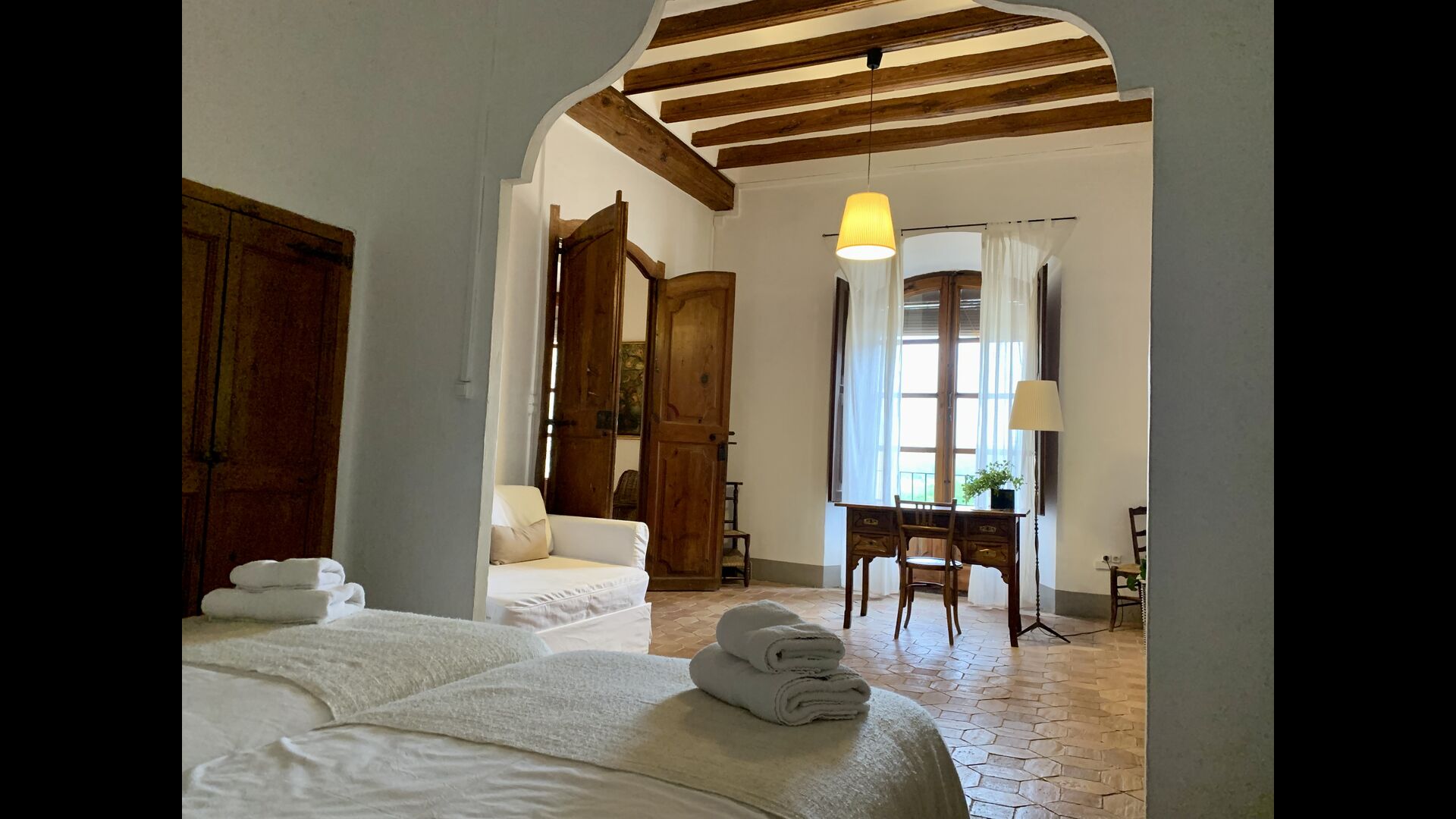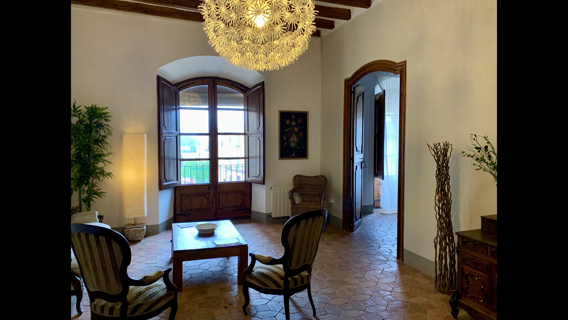 Un alojamiento único en un sitio y entorno singulares.- Disfrutar de un edificio construido en el siglo XVIII, de agradables proporciones y simetría, de habitaciones amplias con alcoba, con balcones y ventanas de grandes dimensiones y visión panorámica, así como de techos envigados y techados de baldosa que forman los típicos pavimentos de Santes Creus.