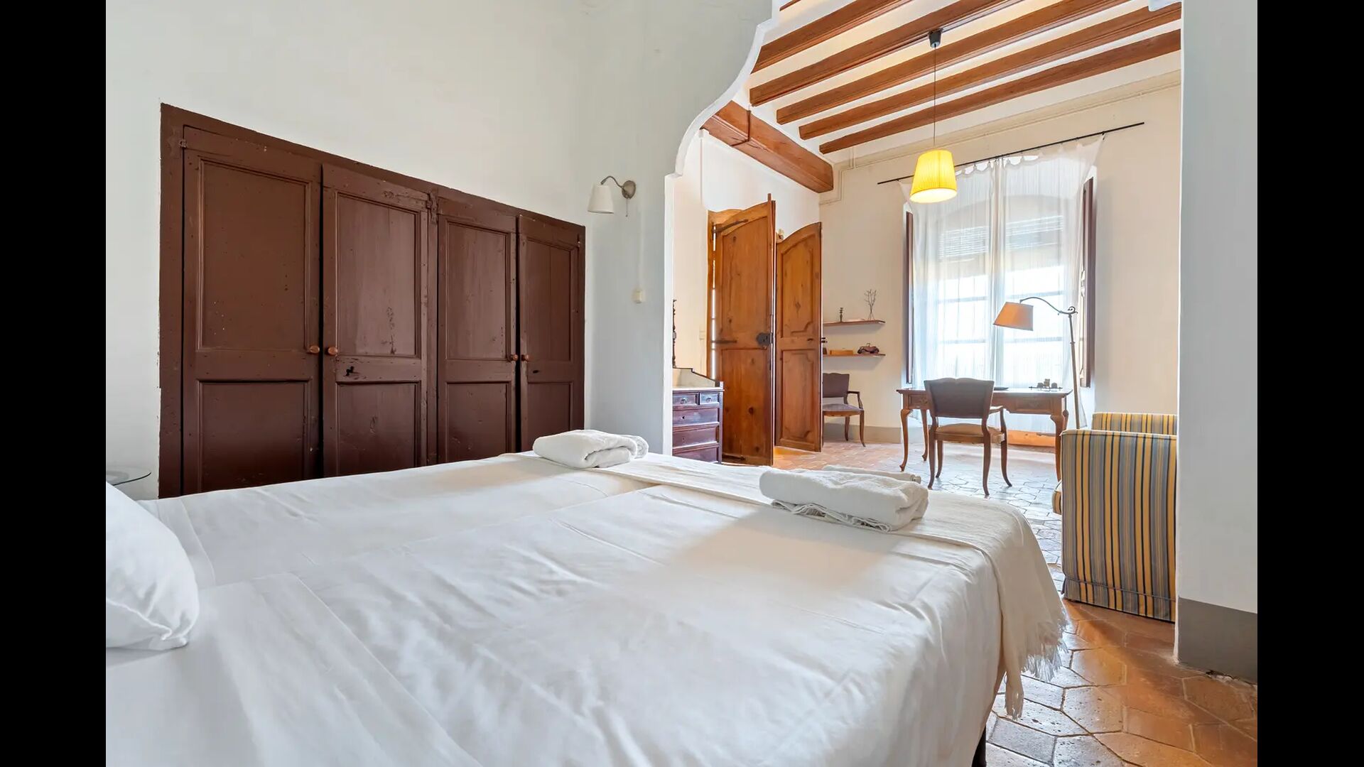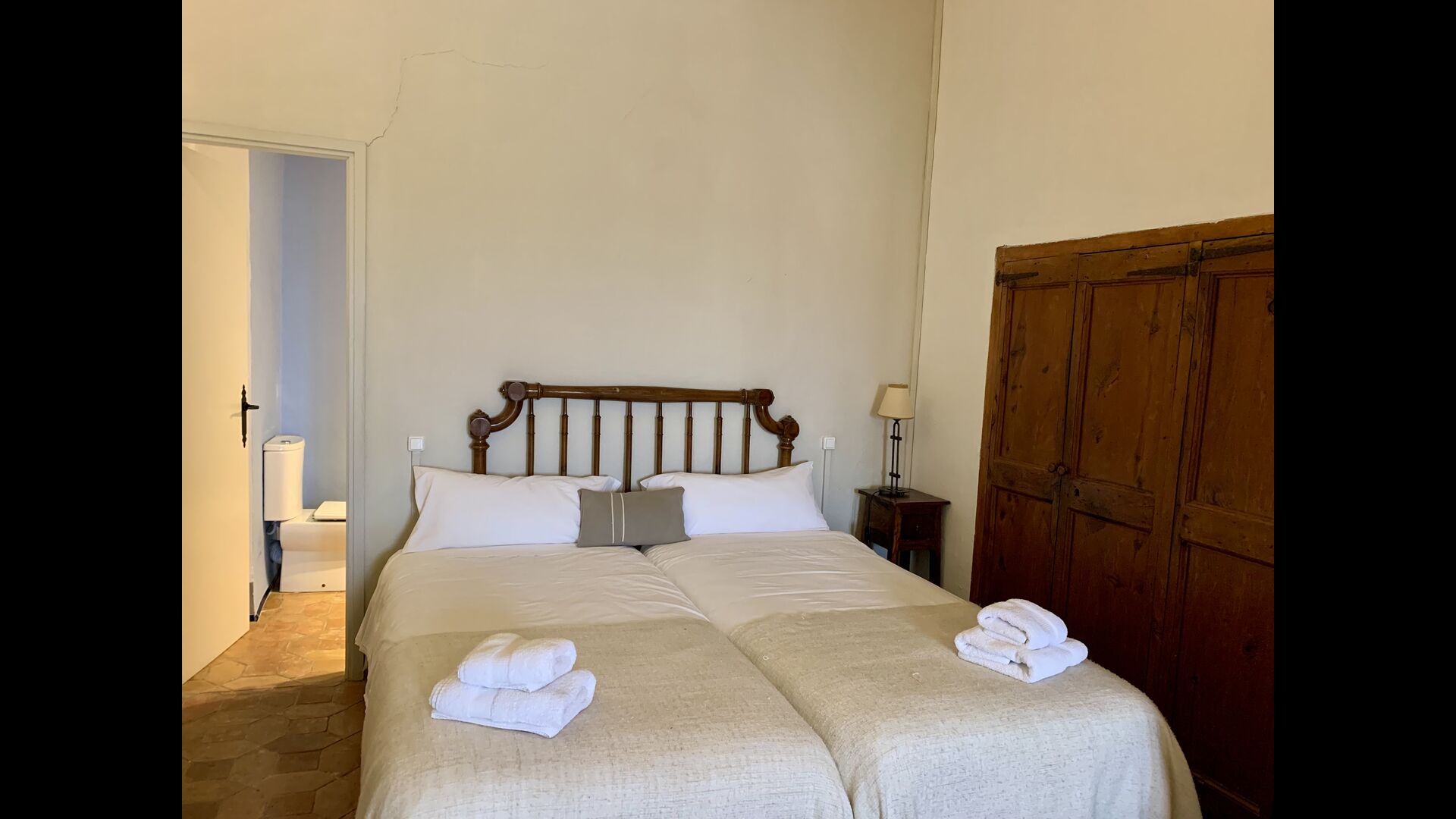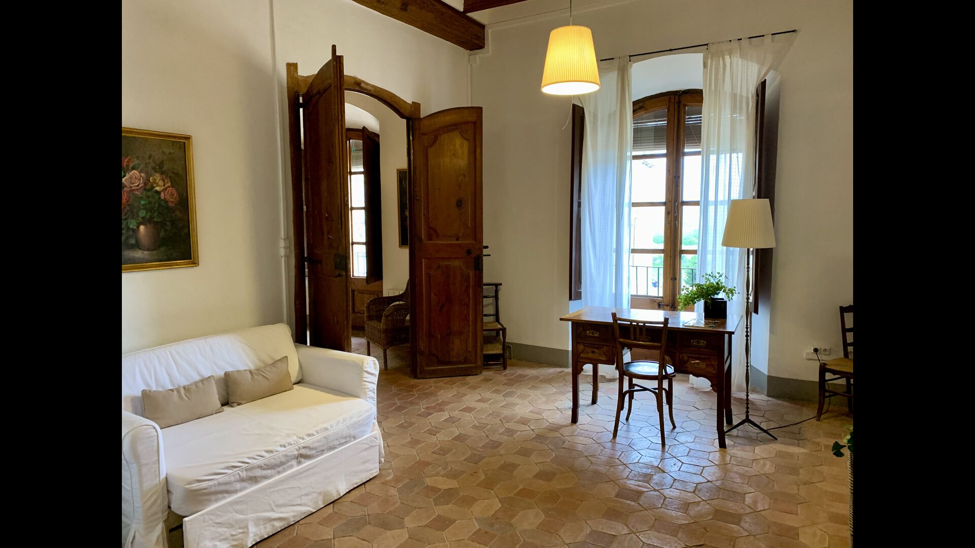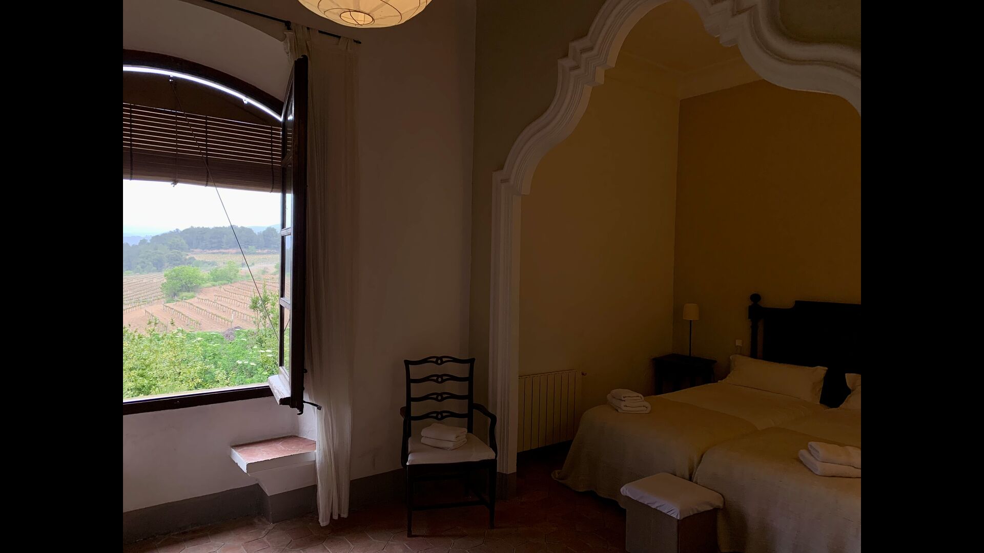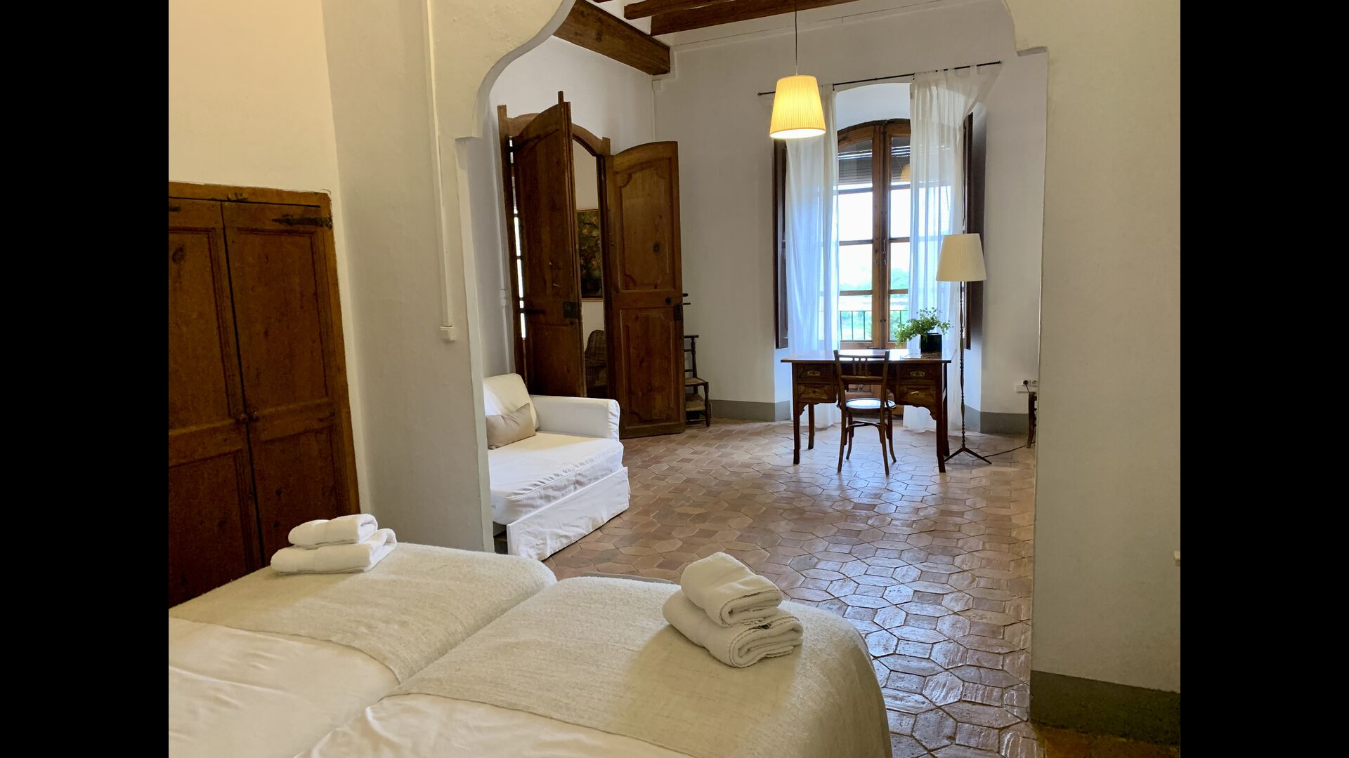 Un alojamiento único en un sitio y entorno singulares.- Disfrutar de un edificio construido en el siglo XVIII, de agradables proporciones y simetría, de habitaciones amplias con alcoba, con balcones y ventanas de grandes dimensiones y visión panorámica, así como de techos envigados y techados de baldosa que forman los típicos pavimentos de Santes Creus.