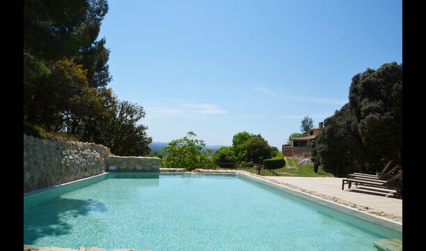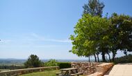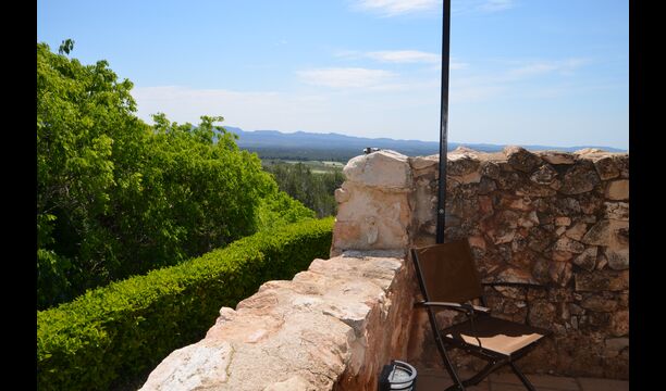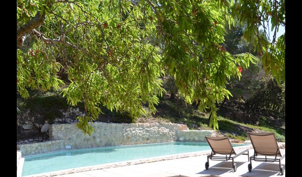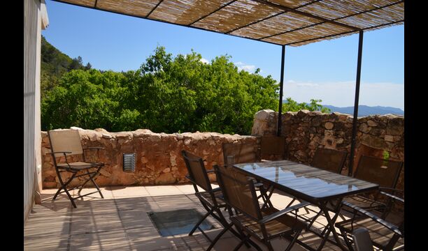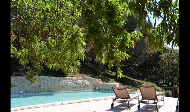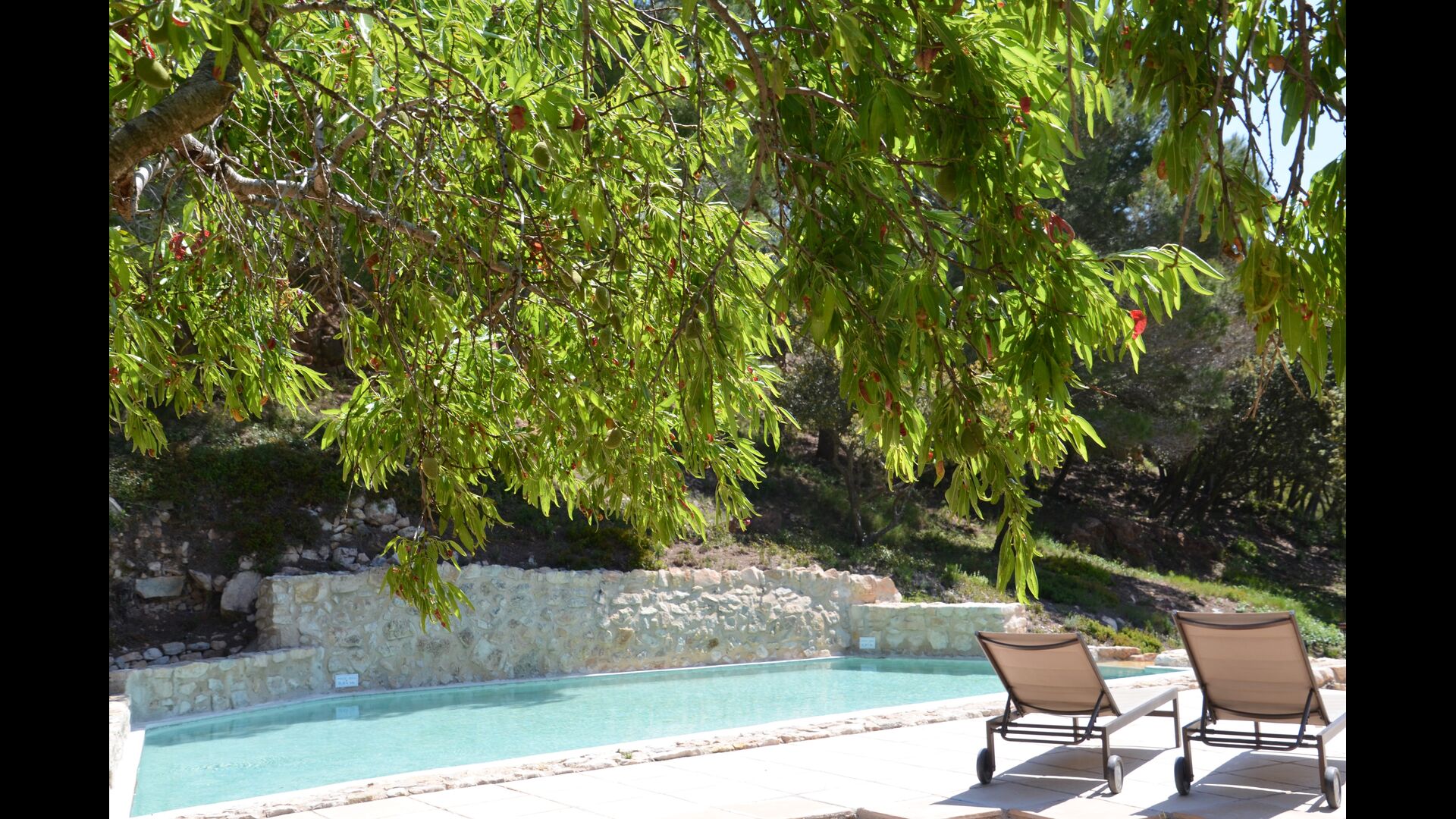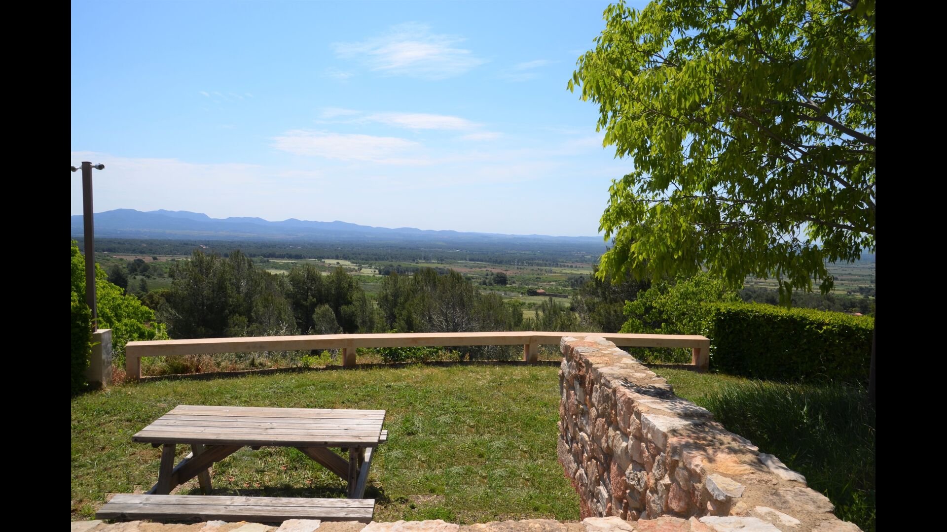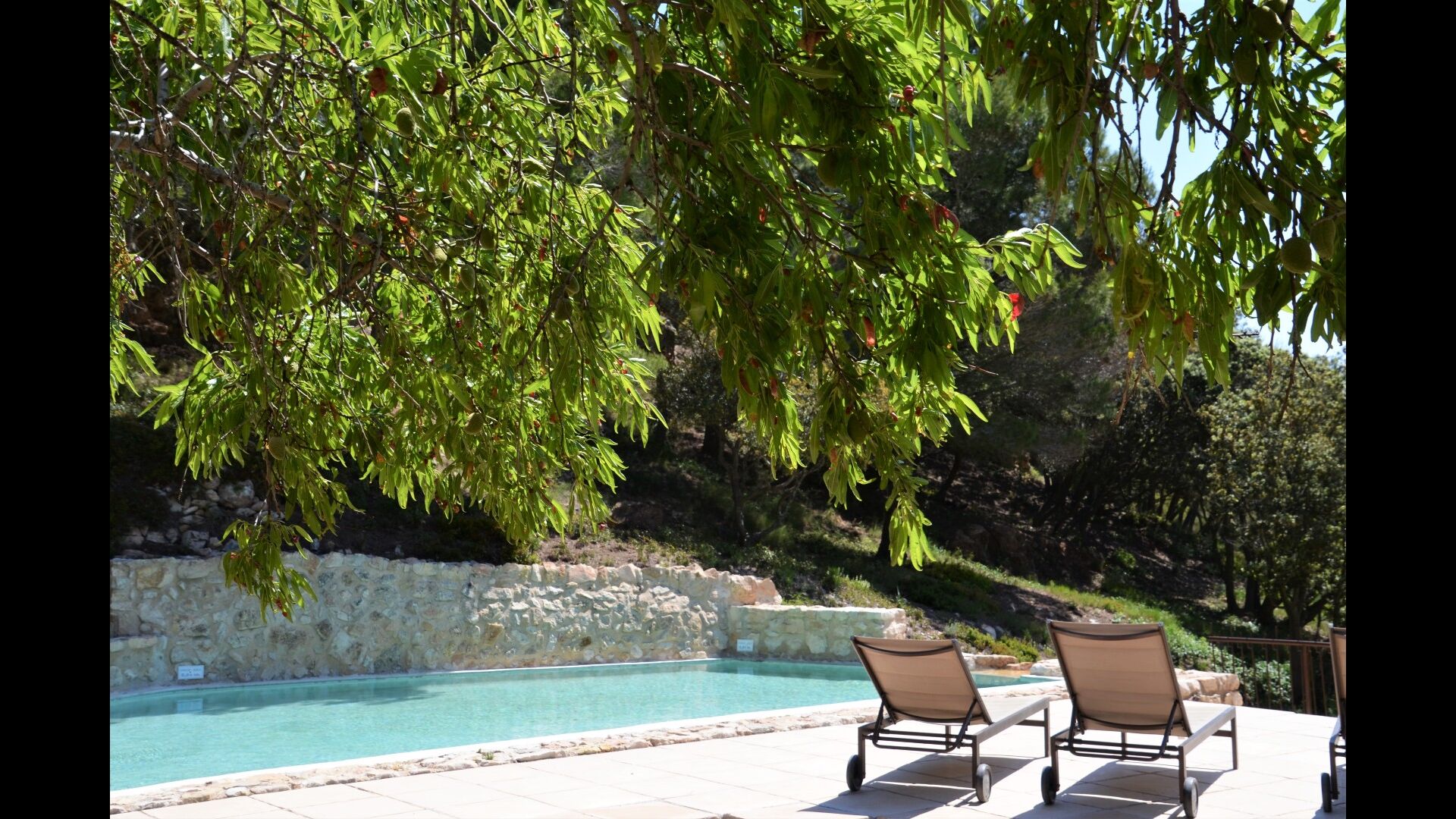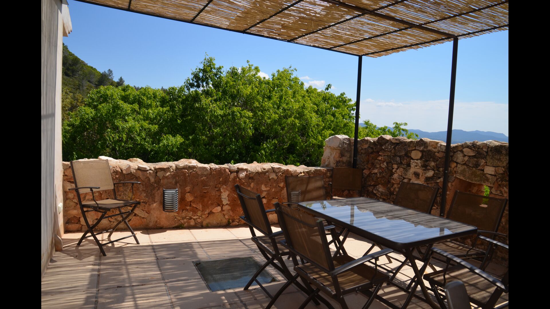 Junto a la piscina, hay una zona de terraza donde poder relajarse, y si hace demasiado calor, simplemente mueva la mesa debajo de los almendros, donde seguro que encontará una sombra. La situación de la piscina, hace que la vista sea impresionante, con campos, almendros y vino y con el mar Mediterráneo visible en días claros.