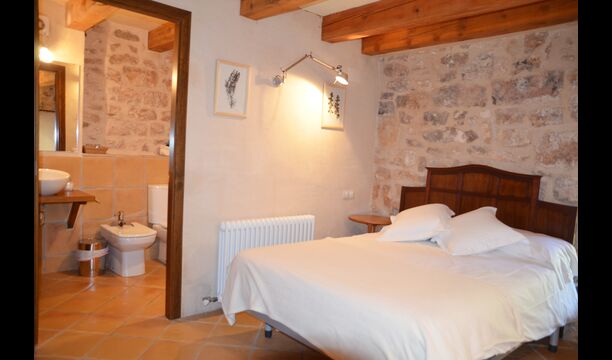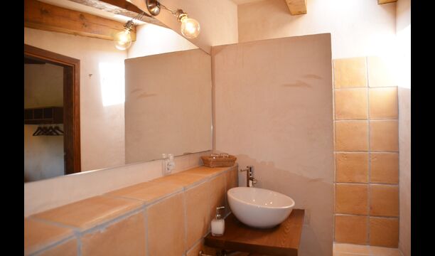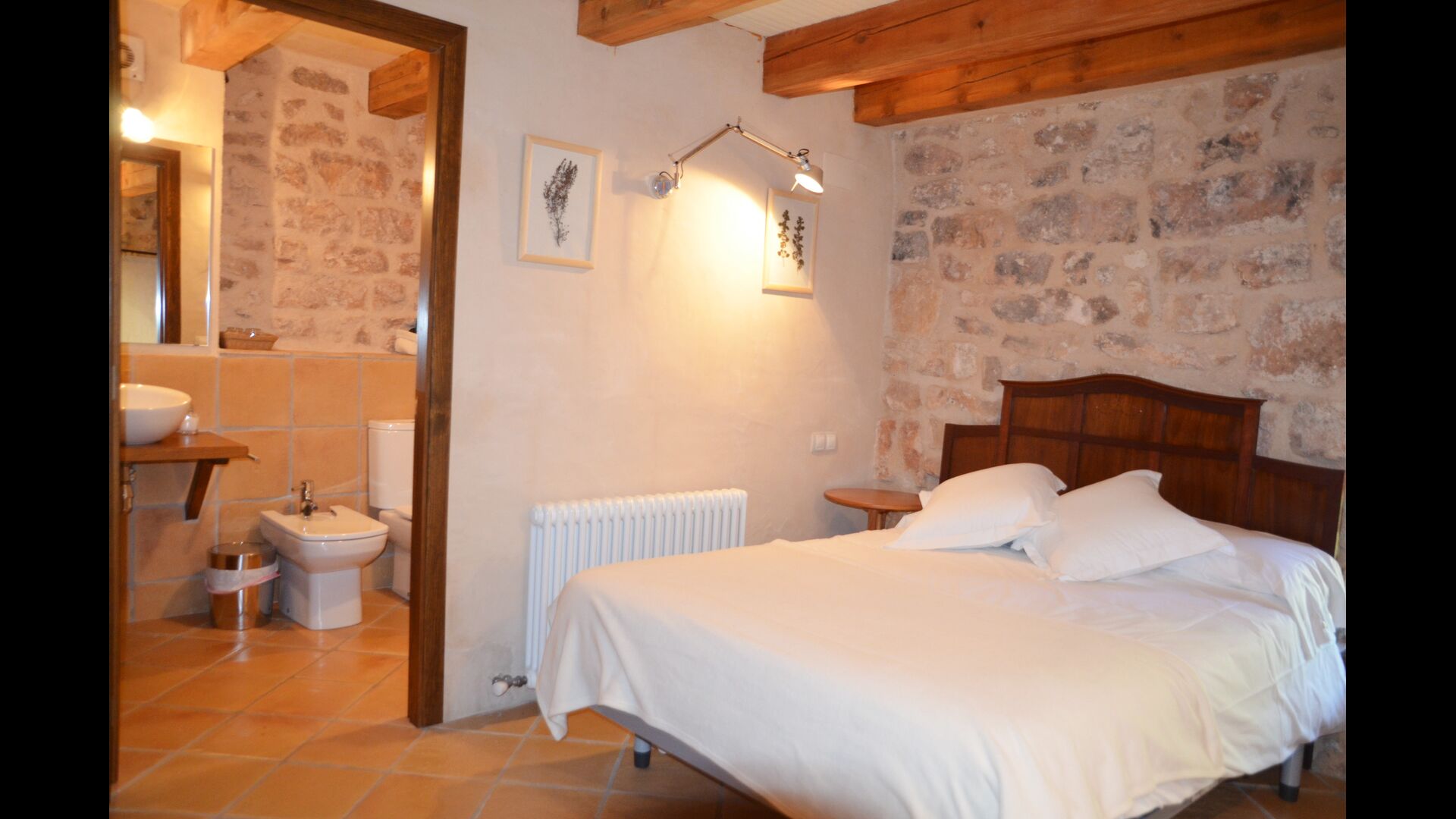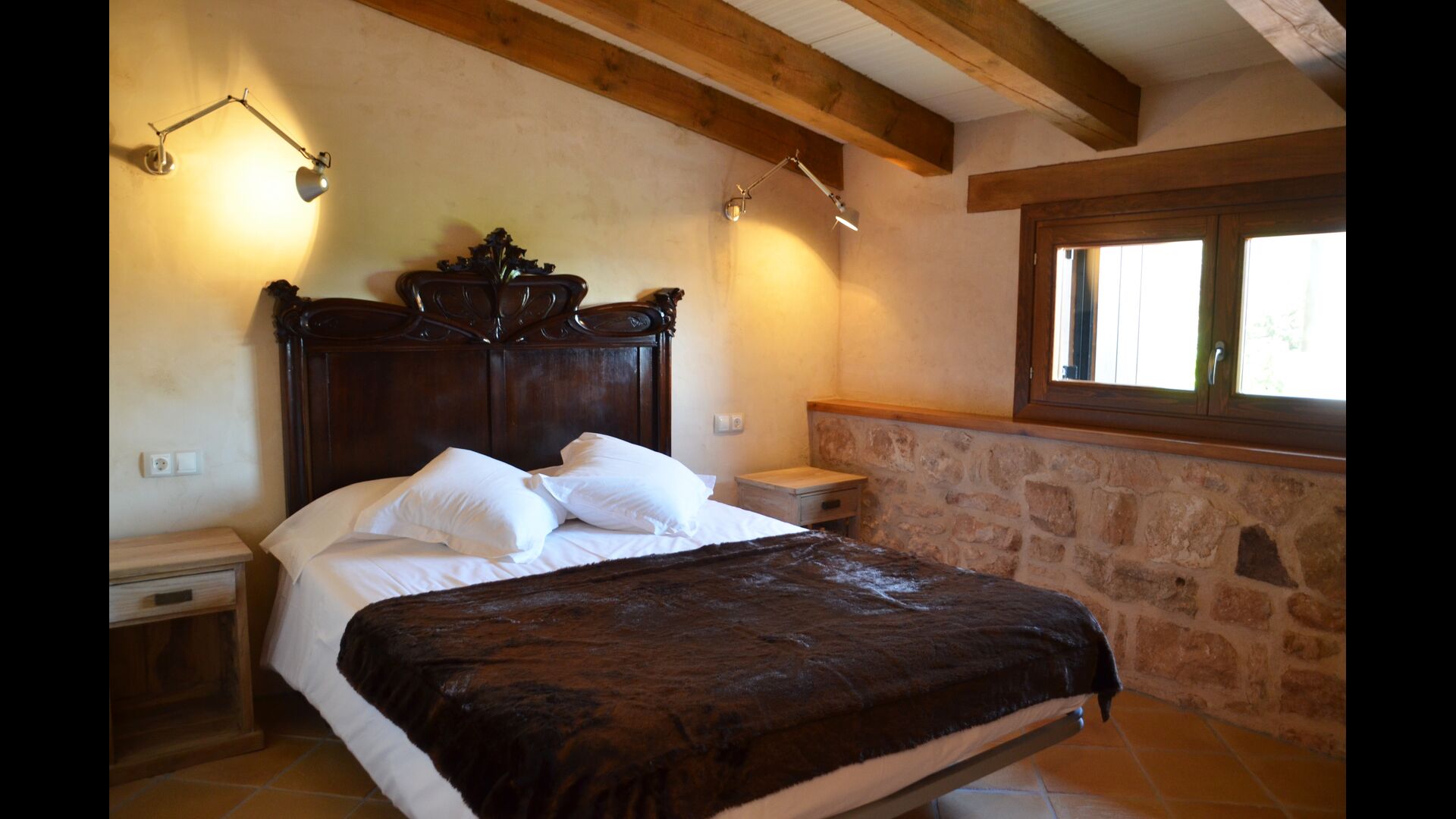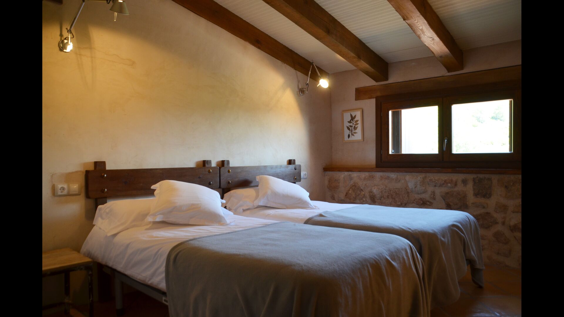 En el primer piso, se encuentran las 3 habitaciones dobles restantes, dos con camas dobles y una con dos camas individuales. Todas las habitaciones tienen baño privado. Si son más de 8 personas, hay dos camas supletorias para niños. Las paredes de piedra caliza mantienen la temperatura agradable en verano.