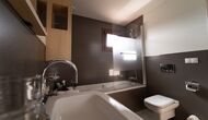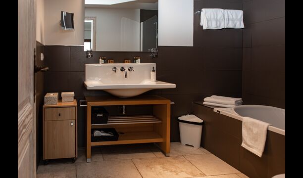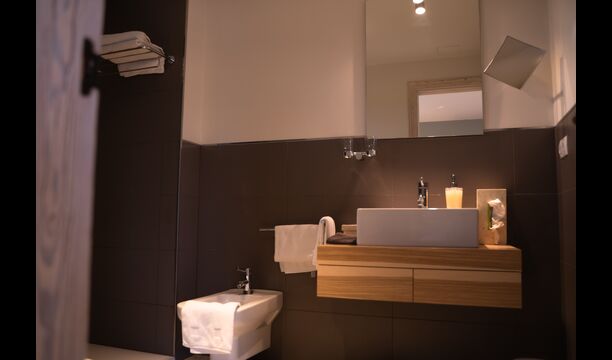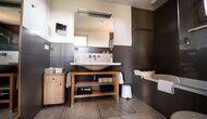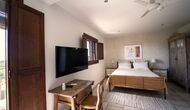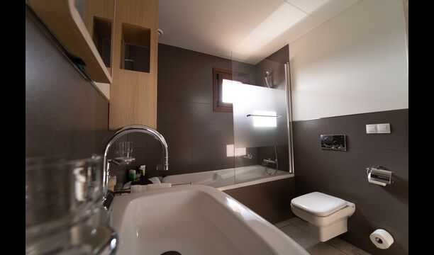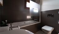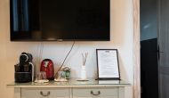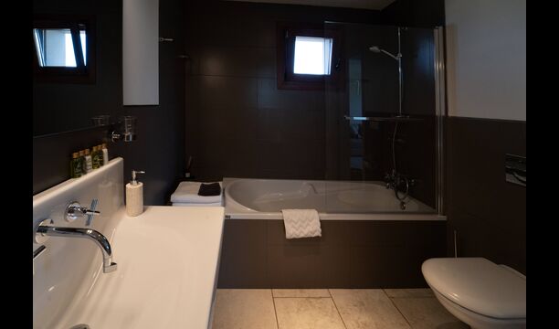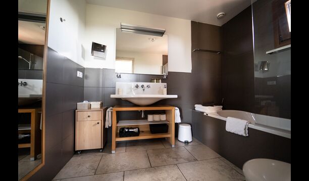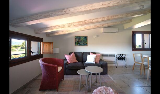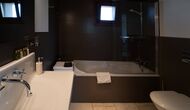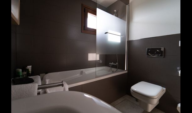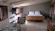 El baño privado está equipado con bañera, lavabo doble, WC, secador de pelo, espejo de aumento y artículos de aseo gratuitos. El dormitorio dispone de cama de matrimonio de 1,60 x 2,00 m y sofá cama de 1,40 x 2,00 m. Por su tamaño de 23m2 y la configuración de las camas (cama de matrimonio y sofá cama de matrimonio), es apto para hasta 4 personas.