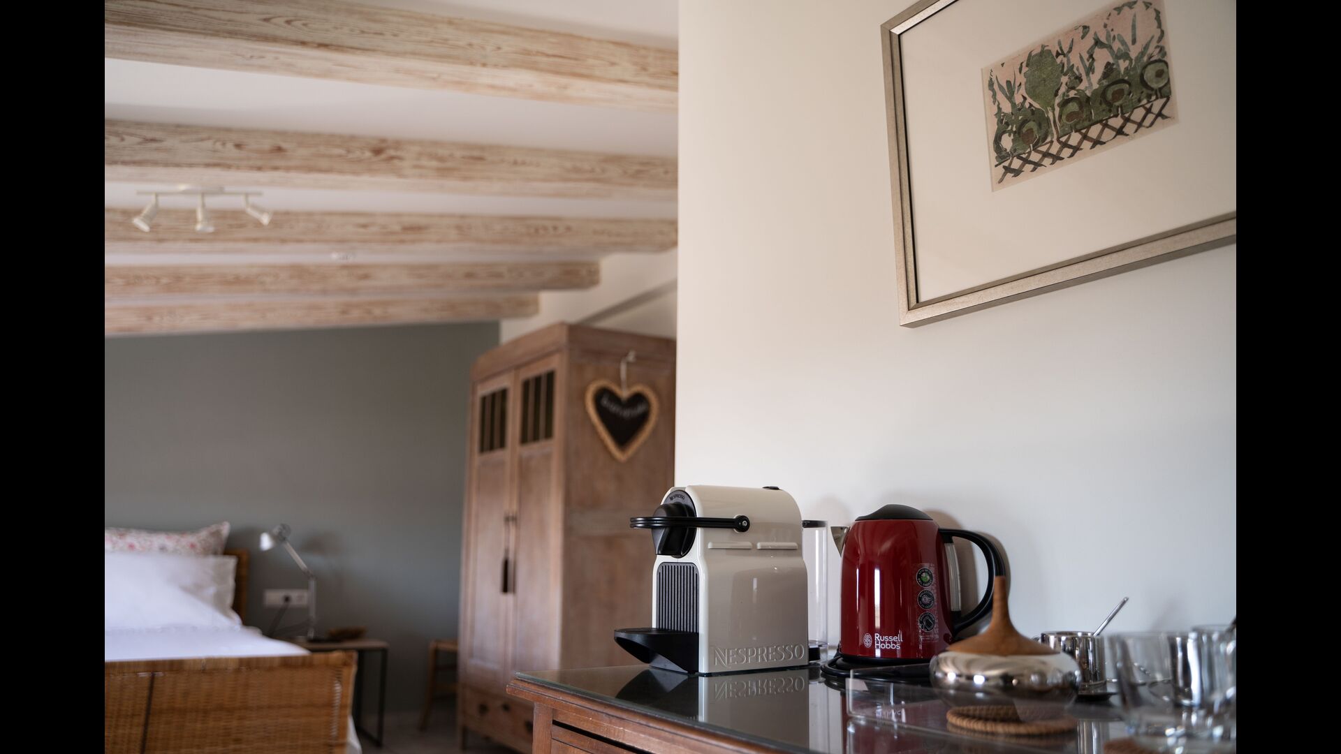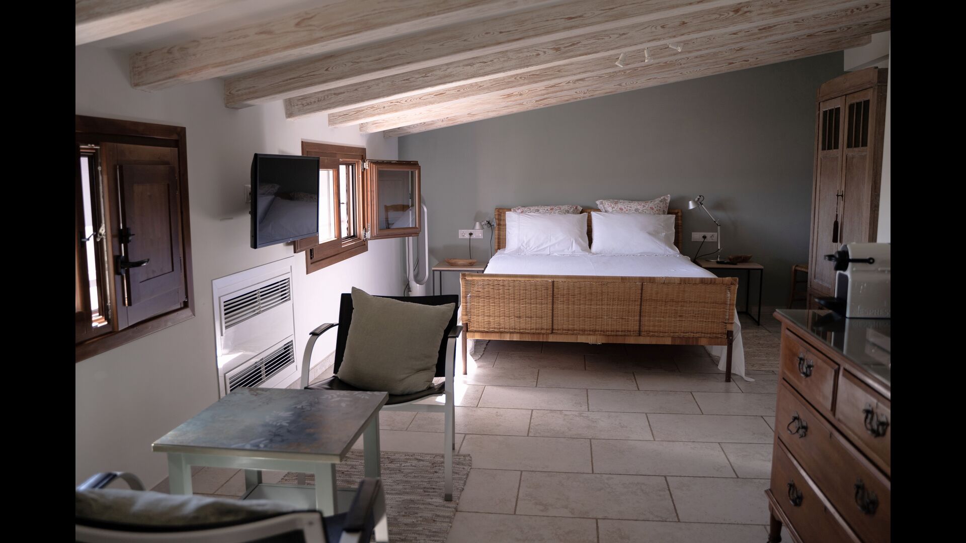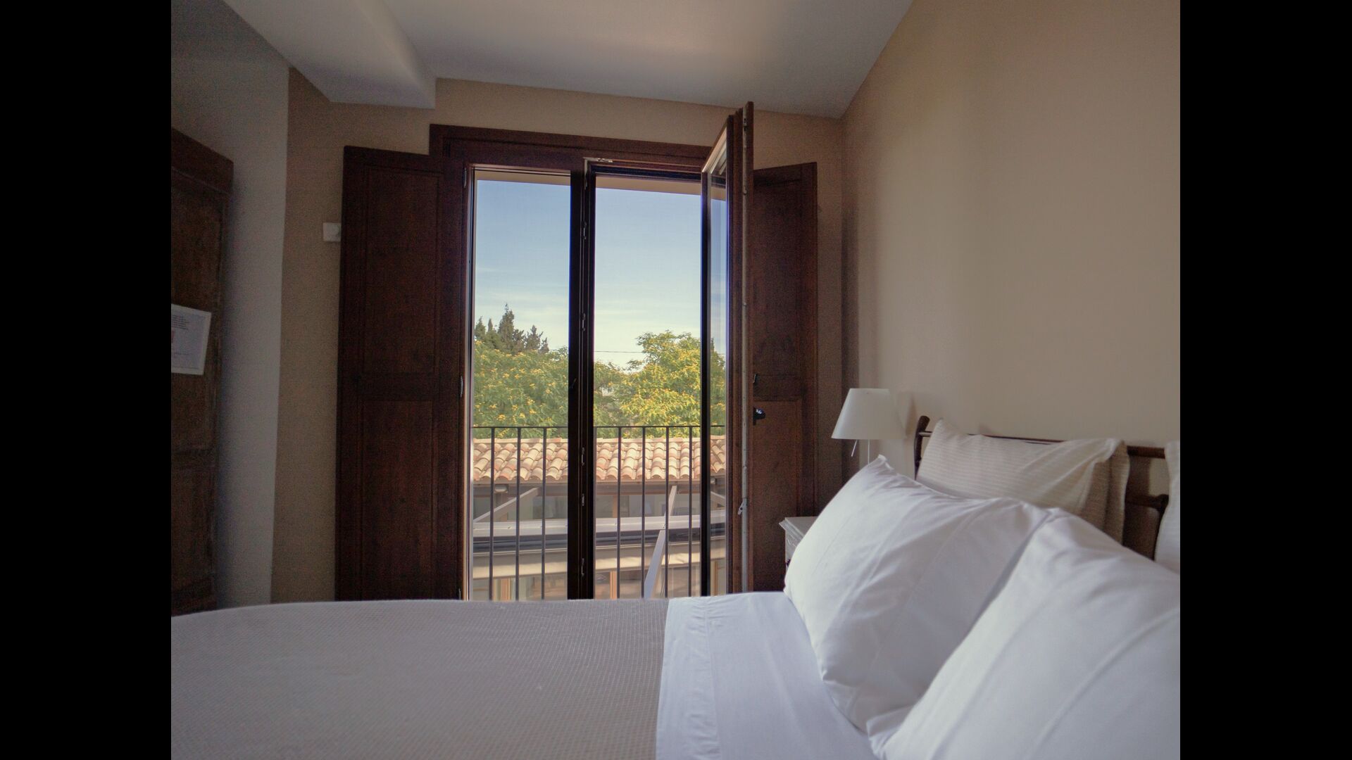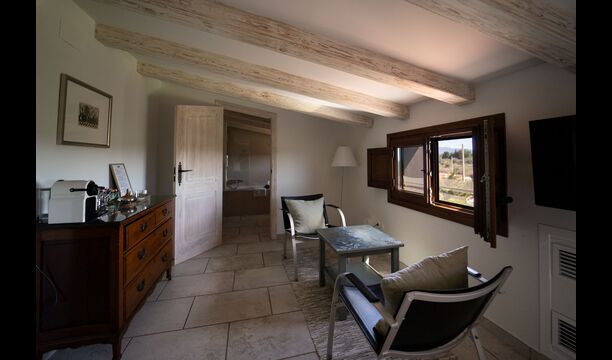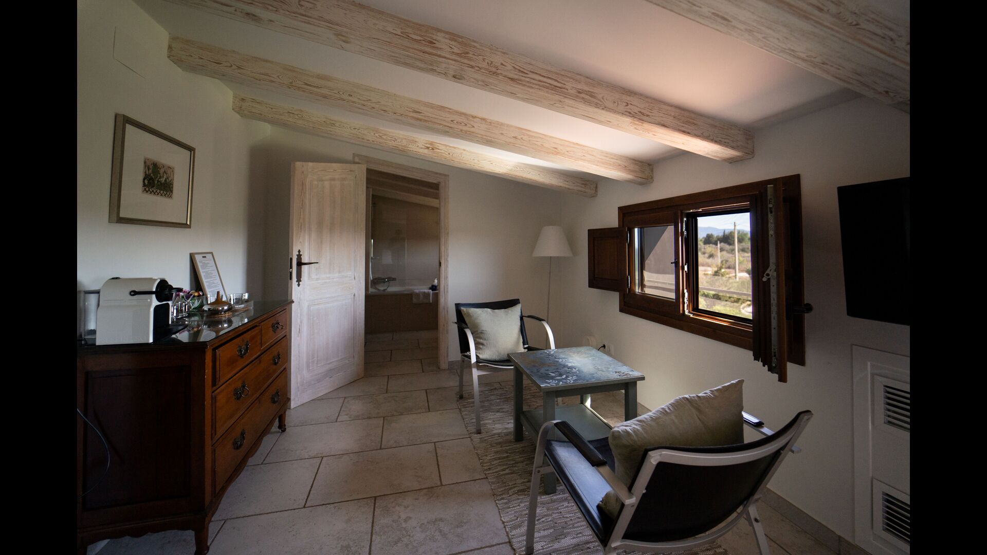 Todas las habitaciones dobles ofrecen vistas al mar Mediterráneo a lo lejos, a las montañas con la puesta de sol oa los olivares. Todas están equipadas con aire acondicionado, televisión por satélite, suelo radiante, wifi, ; café Nespresso y baño privado. El mobiliario de cada habitación es una mezcla inteligente de lo antiguo y lo moderno, creando un ambiente de muy buen gusto.