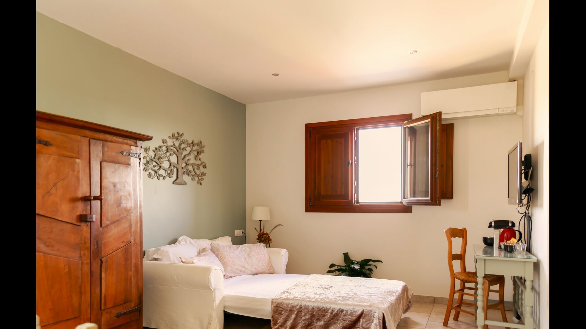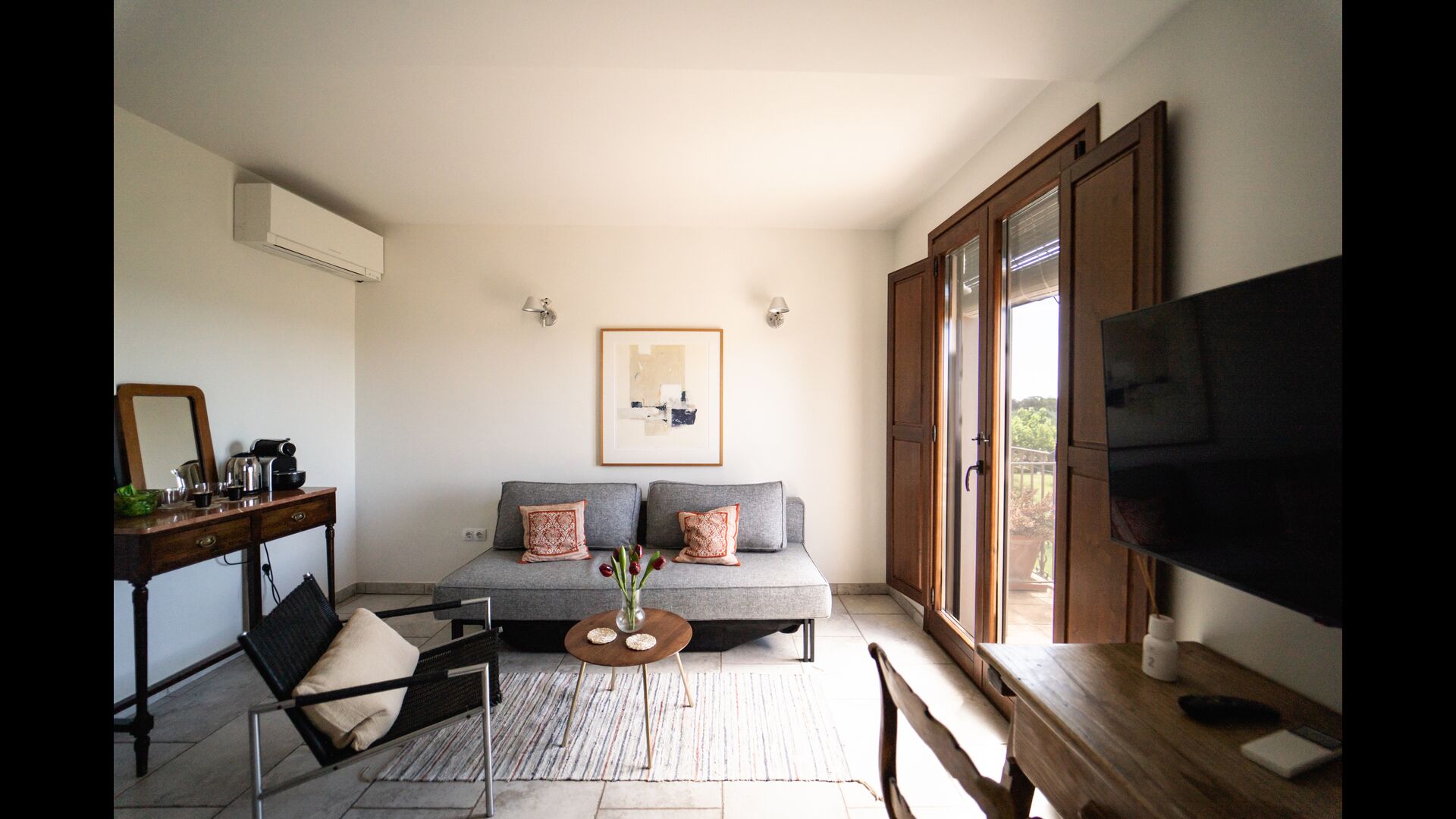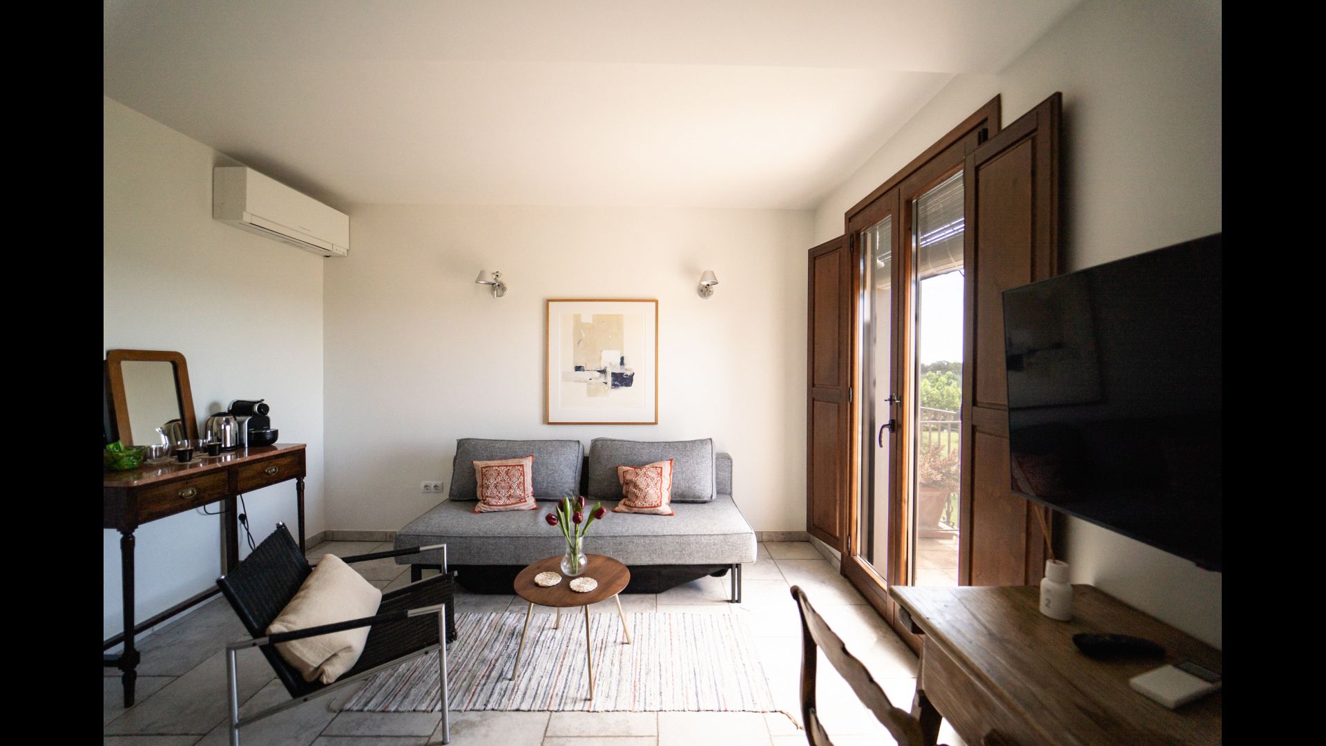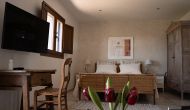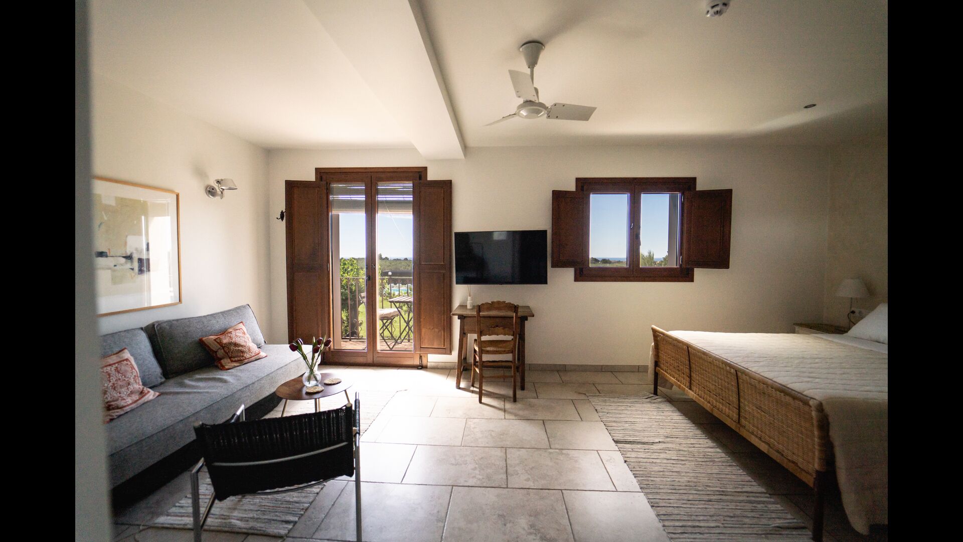 Todas las habitaciones dobles ofrecen vistas al mar Mediterráneo a lo lejos, a las montañas con la puesta de sol oa los olivares. Todas están equipadas con aire acondicionado, televisión por satélite, suelo radiante, wifi, ; café Nespresso y baño privado. El mobiliario de cada habitación es una mezcla inteligente de lo antiguo y lo moderno, creando un ambiente de muy buen gusto.
