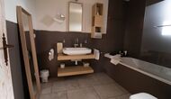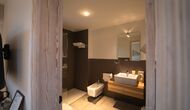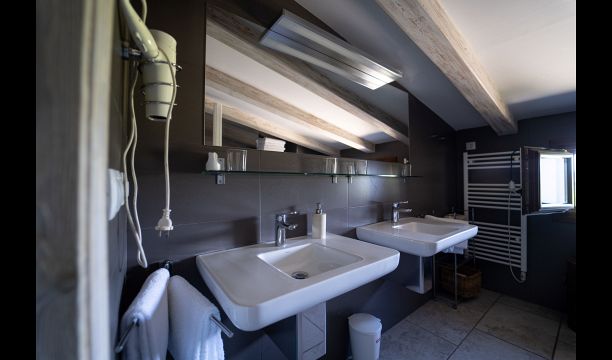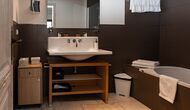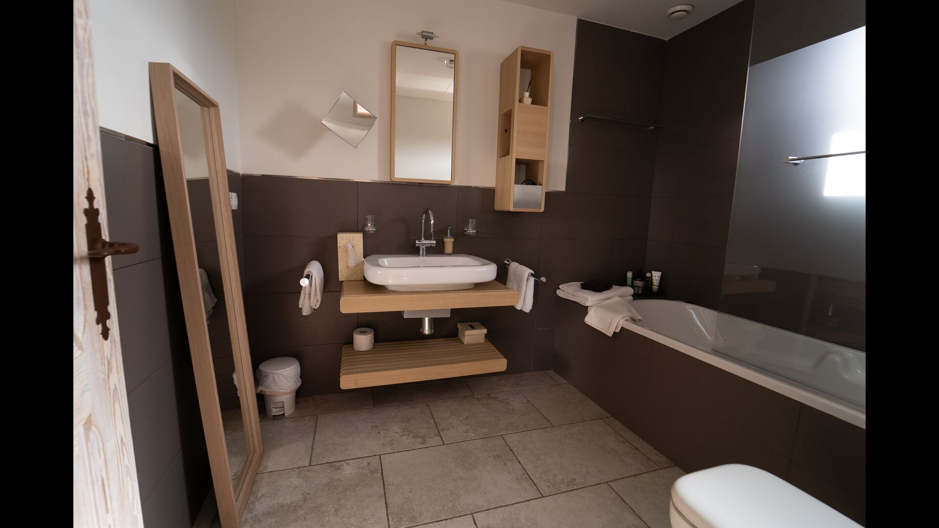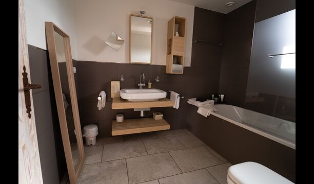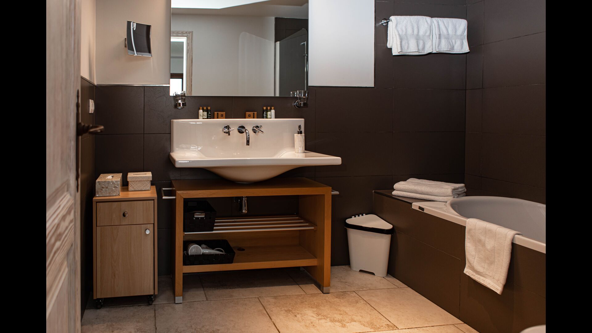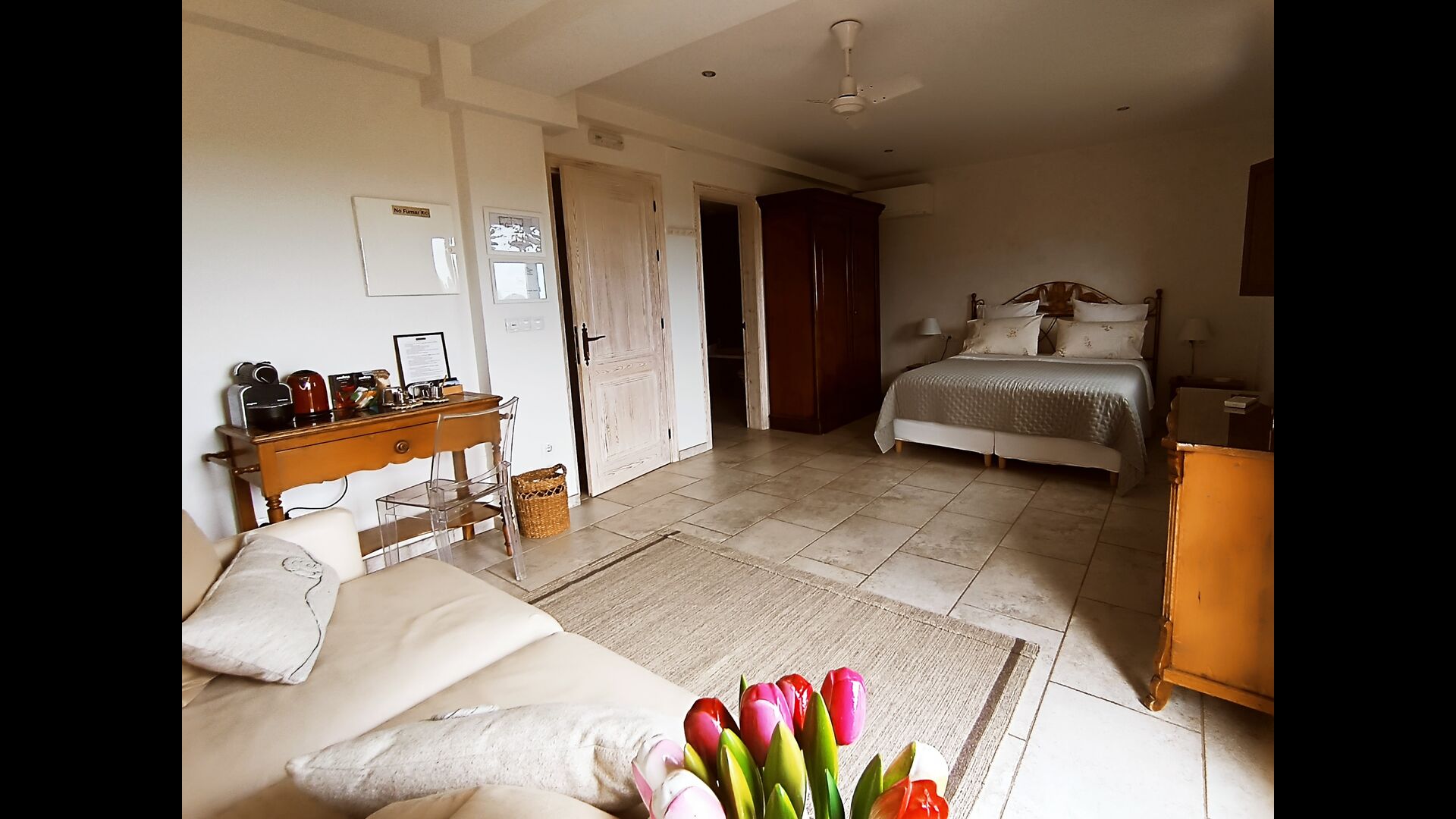 El baño privado está equipado con bañera, lavabo, WC, secador de pelo, espejo de aumento y artículos de aseo gratuitos. Esta habitación dispone de una cama de matrimonio de 1,60 x 2,00 my un sofá cama de 1,40 x 2,00 m. Por su tamaño de 20m2 y la configuración de las camas (cama de matrimonio y sofá cama de matrimonio), puede alojar hasta 2 personas. 4 personas.